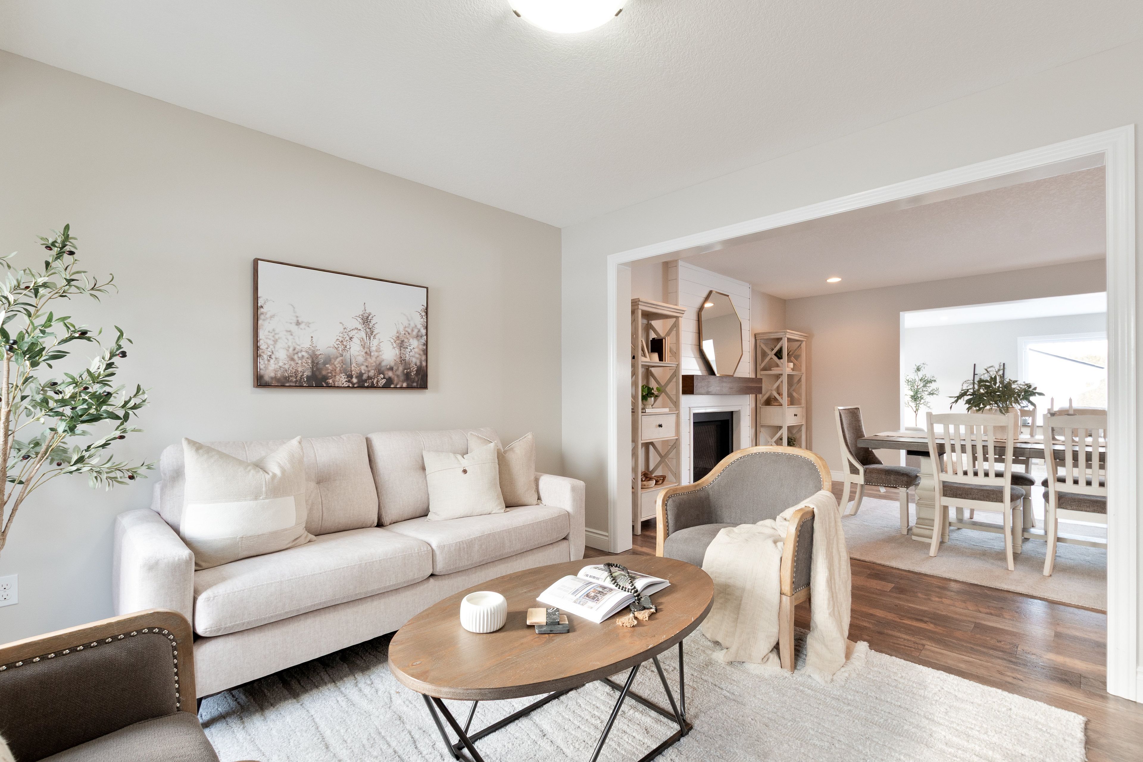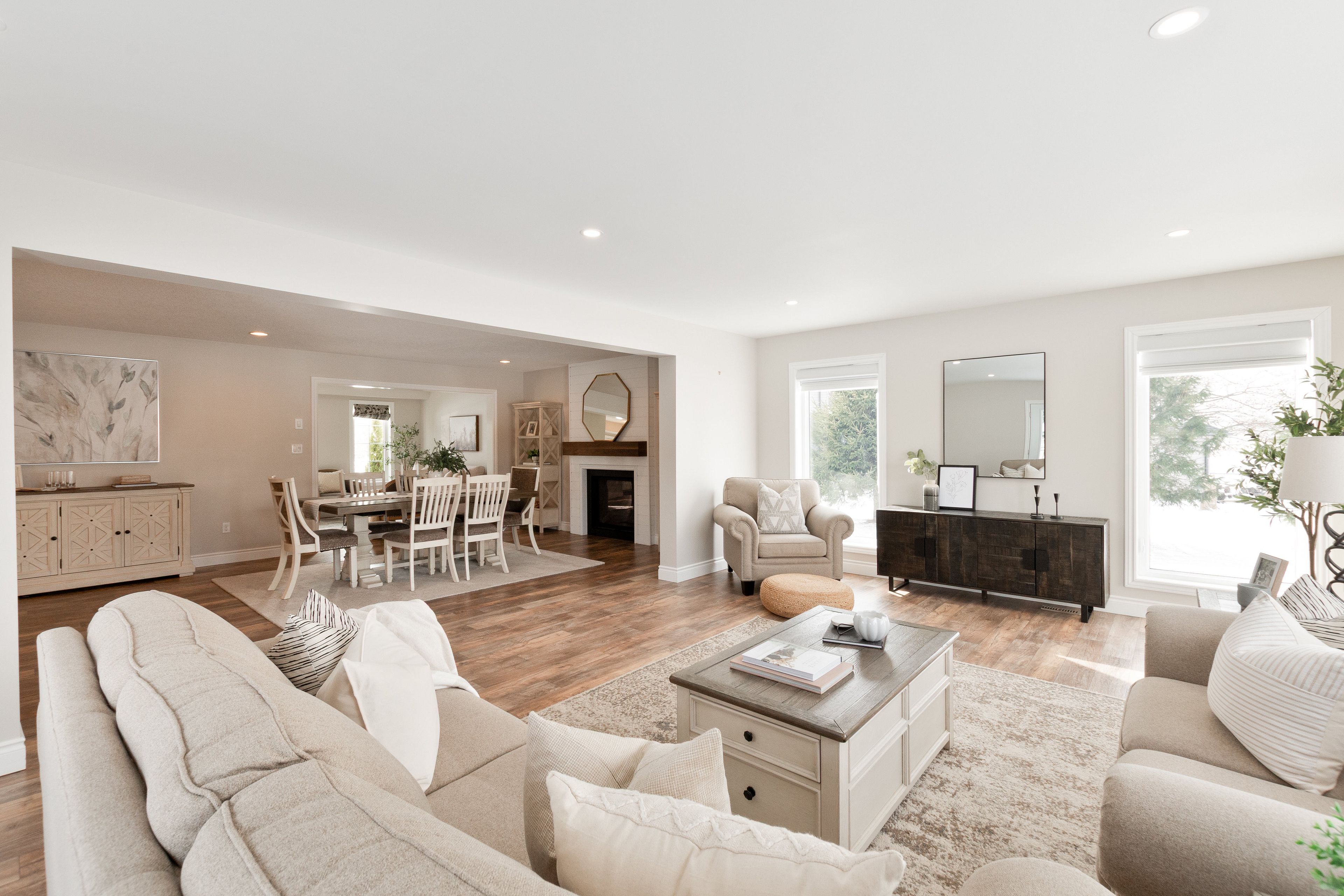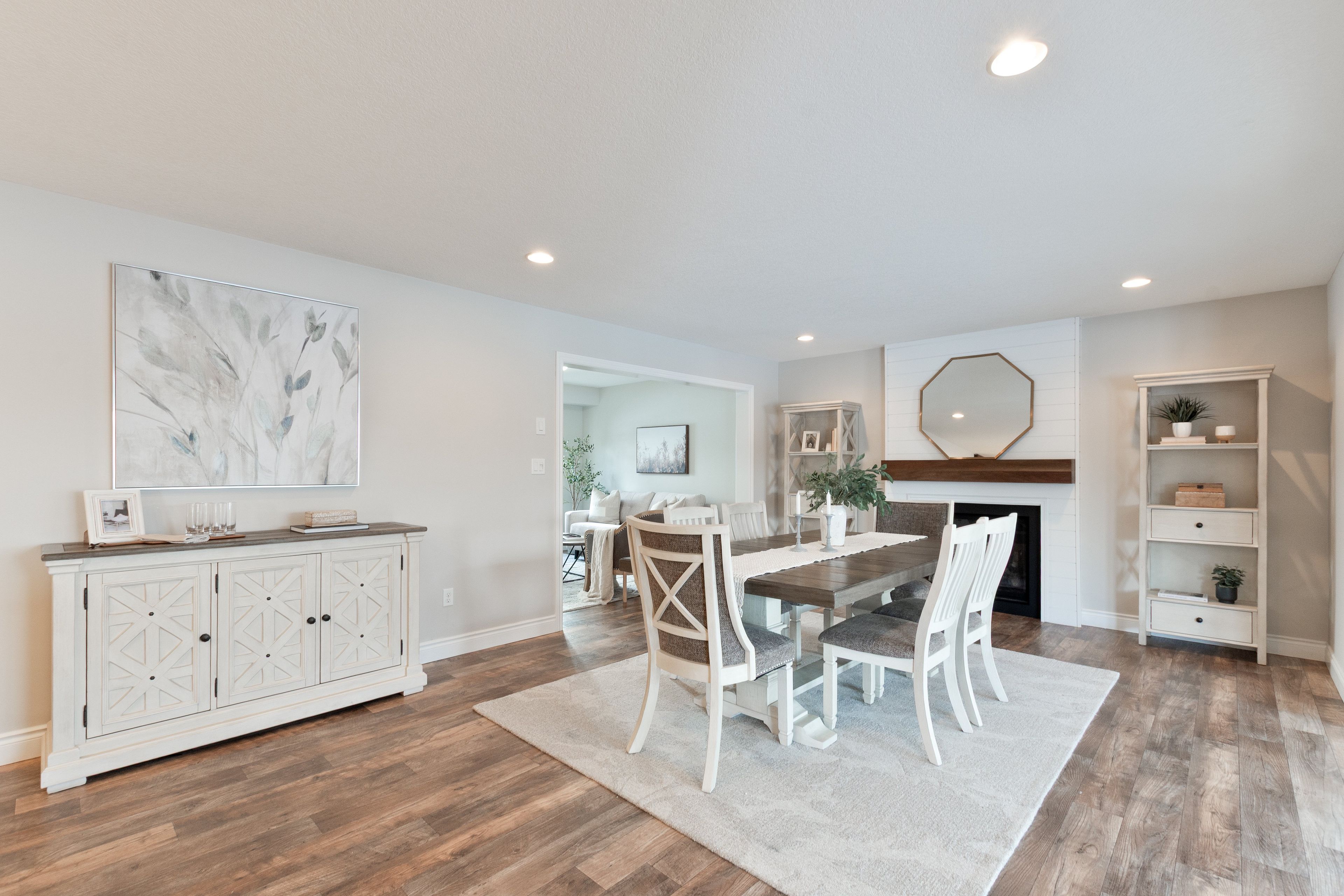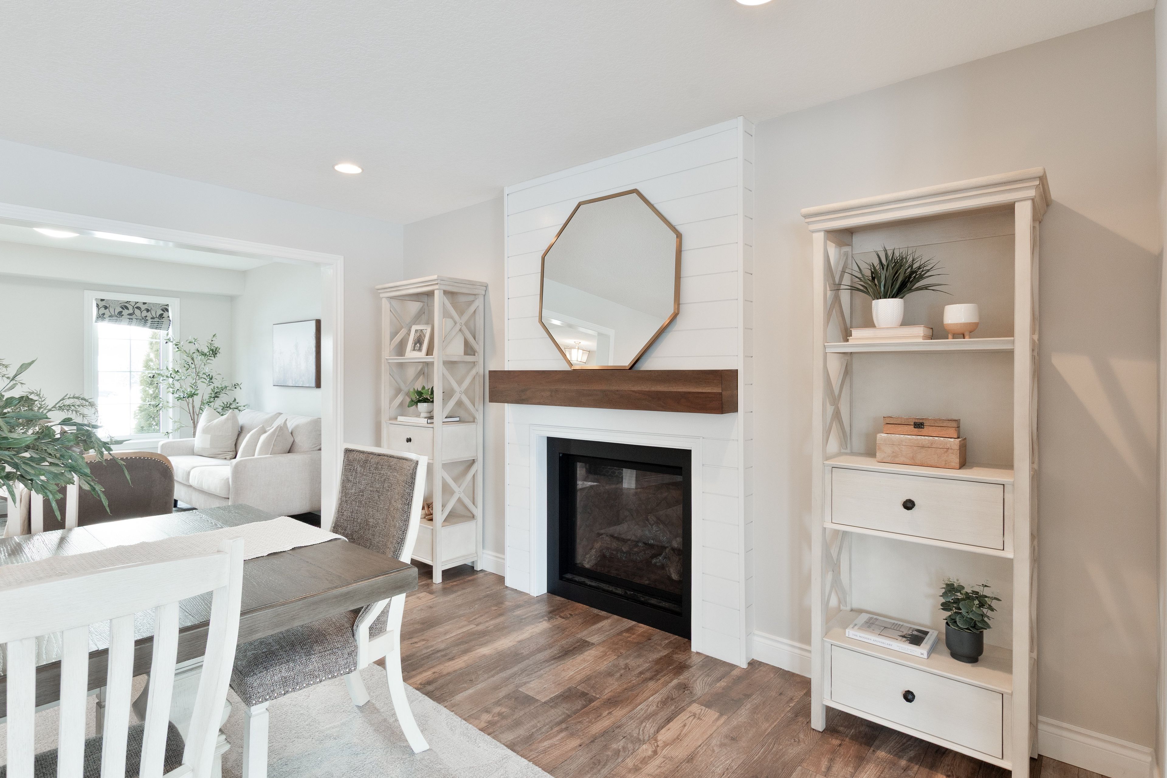 • Bright open-concept design with a cozy gas fireplace in the dining area.