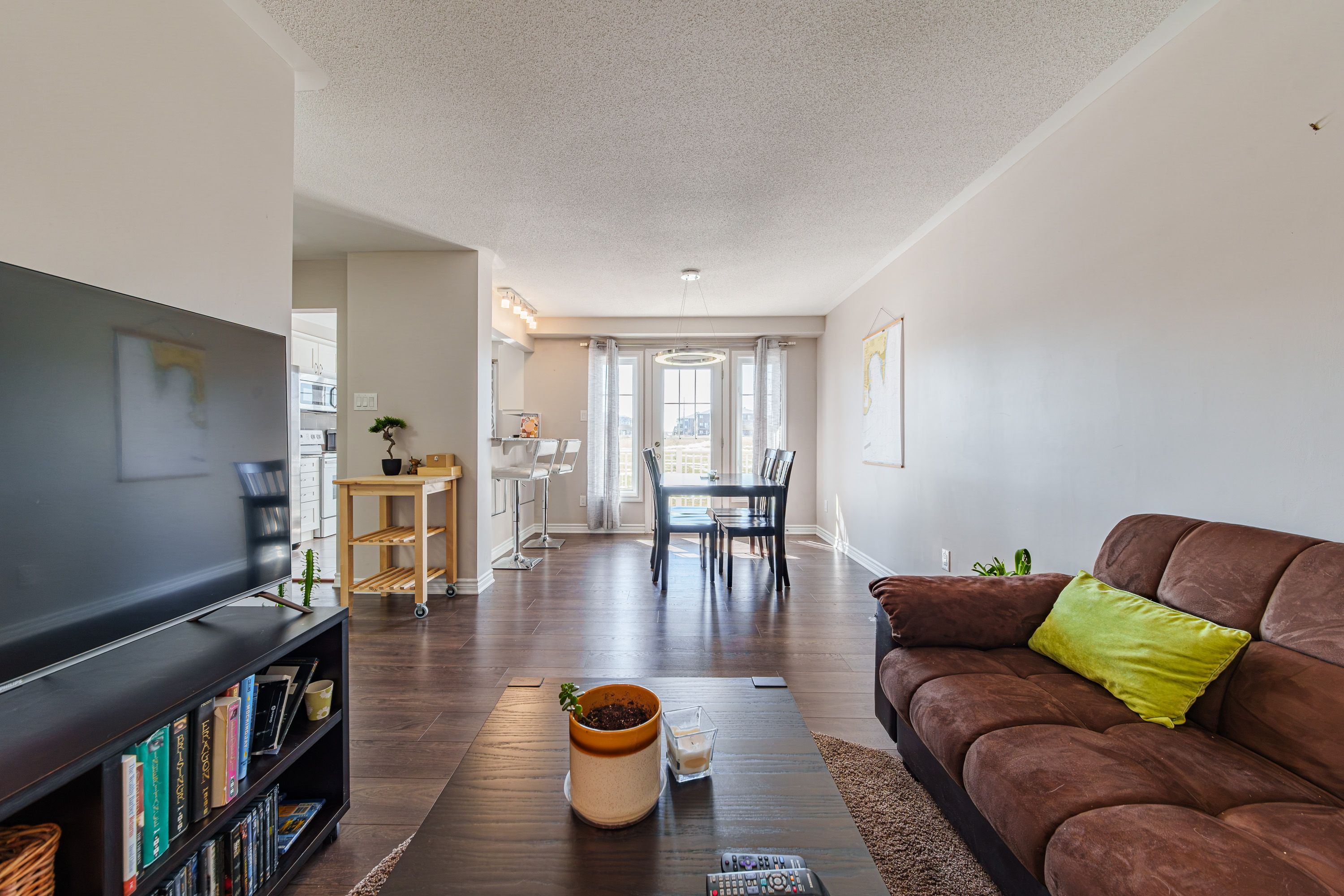 • Open-concept living and dining space with electric fireplace.