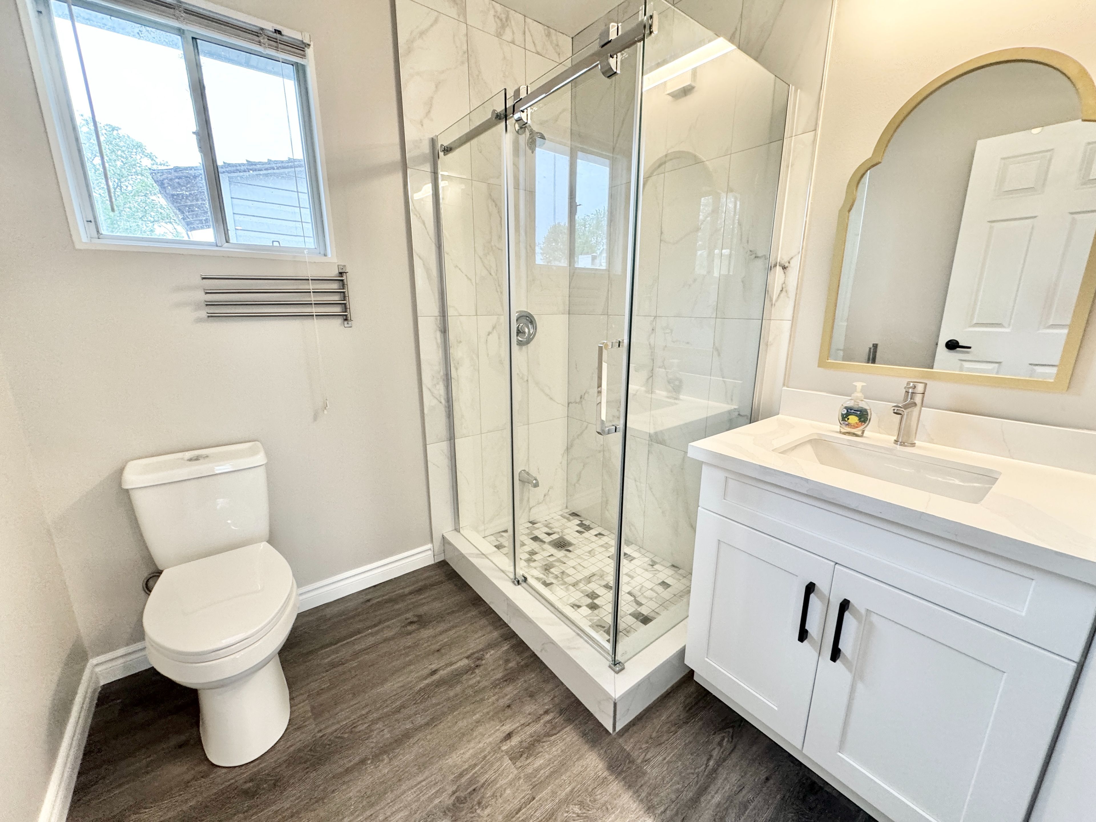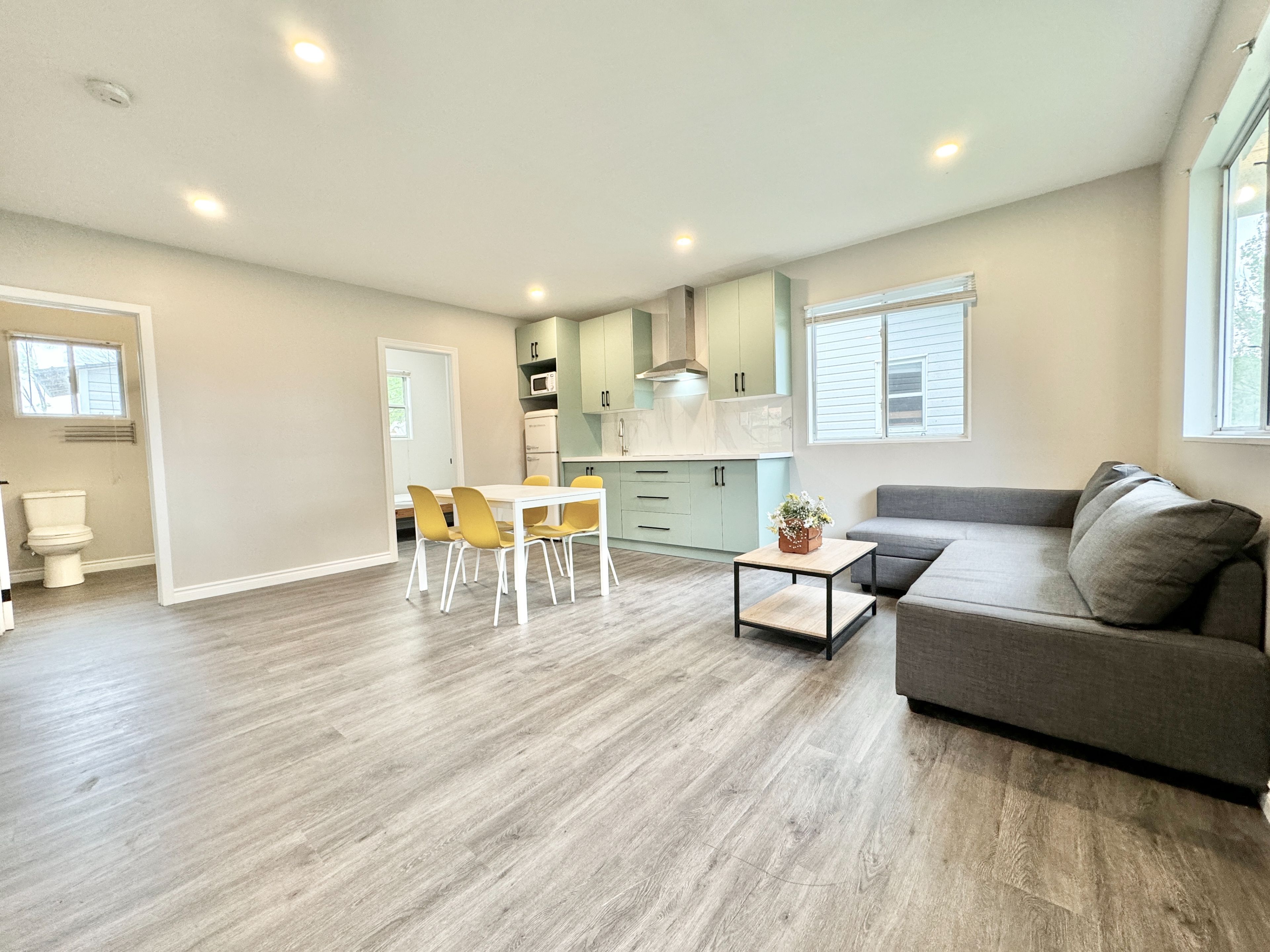 • Modern kitchen with quartz countertops and laminate flooring throughout.