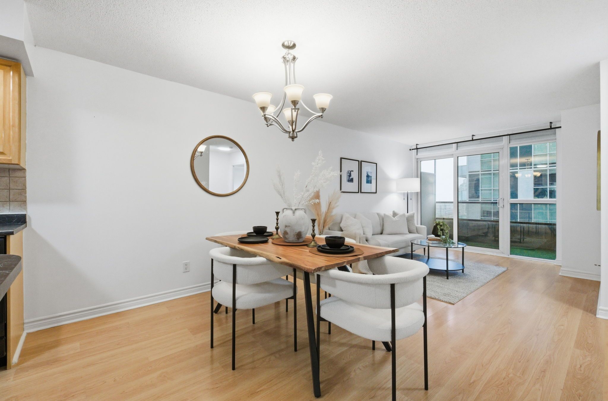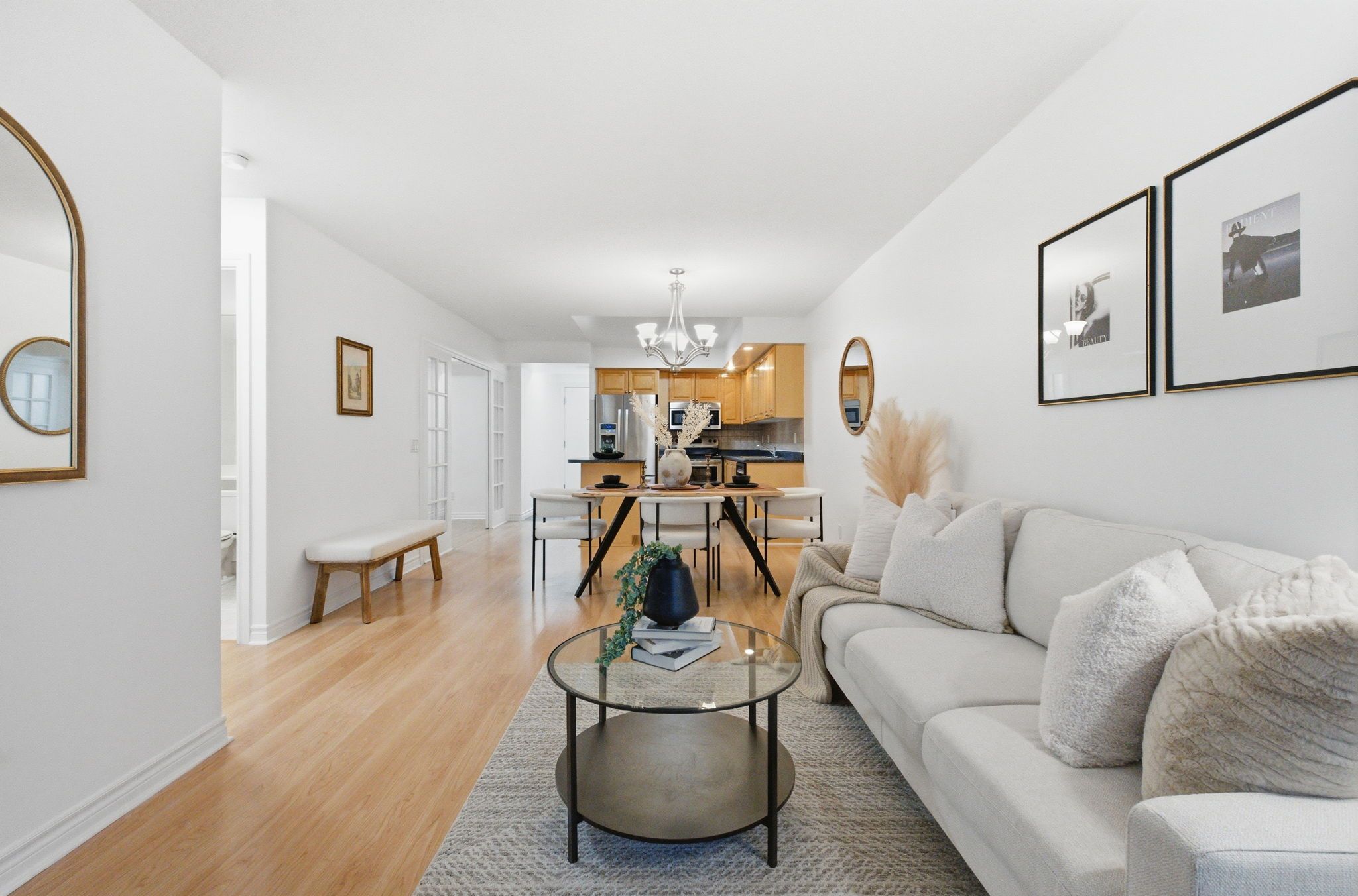 • Open-concept layout connecting kitchen, living, and dining areas.