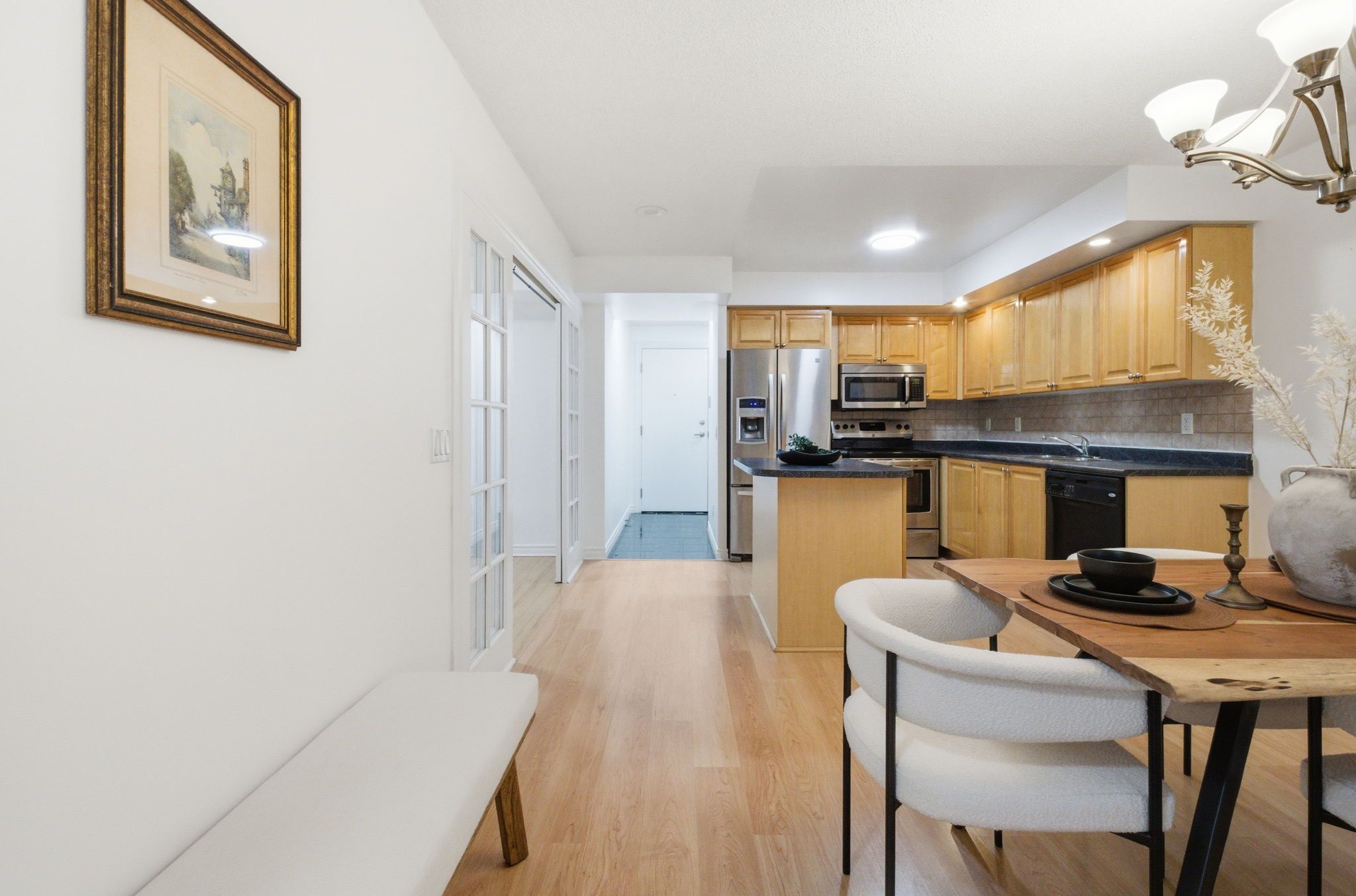 This bright and well-designed suite offers a functional open-concept layout with floor-to-ceiling windows, allowing for abundant natural light throughout. The contemporary kitchen features sleek cabinetry, quartz countertops, and integrated stainless steel appliances, seamlessly flowing into the living and dining area. The bedroom is well-sized with ample closet space, and the suite offers quality finishes throughout. Located in a highly sought-after etobicoke community, steps to transit, shopping, restaurants, parks, and everyday conveniences, with easy access to major highways. Residents enjoy premium building amenities including concierge, fitness center, party room, and more. Ideal for professionals or couples seeking convenience, comfort, and a vibrant urban lifestyle.