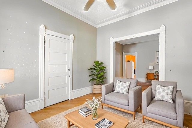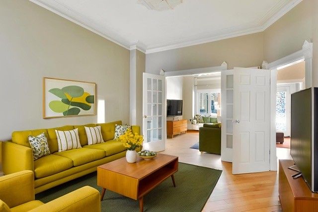 • Three spacious bedrooms and two bathrooms with high ceilings for an airy feel.