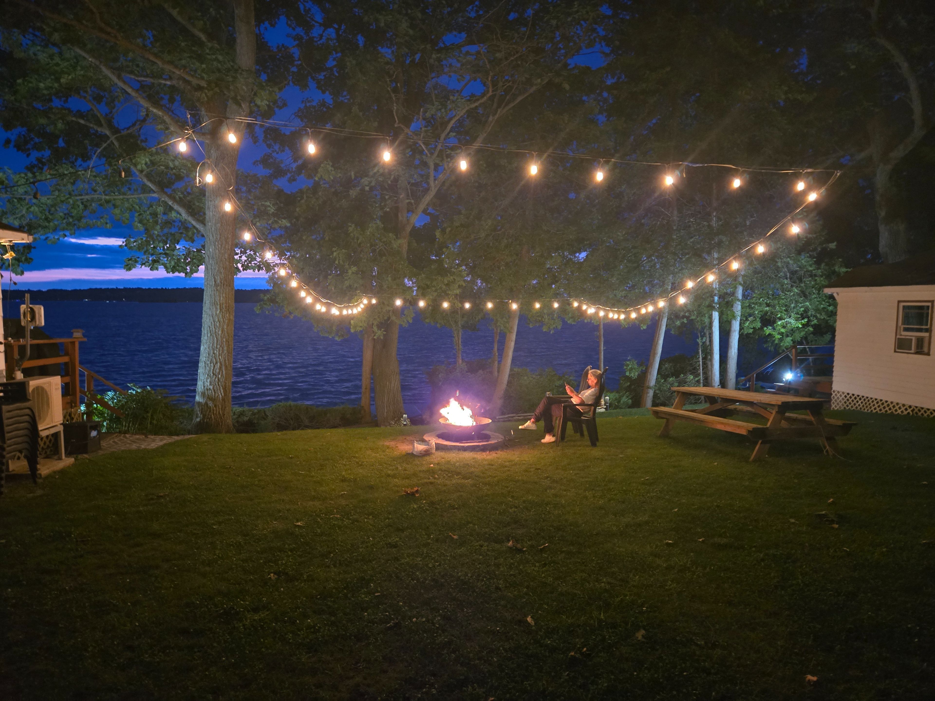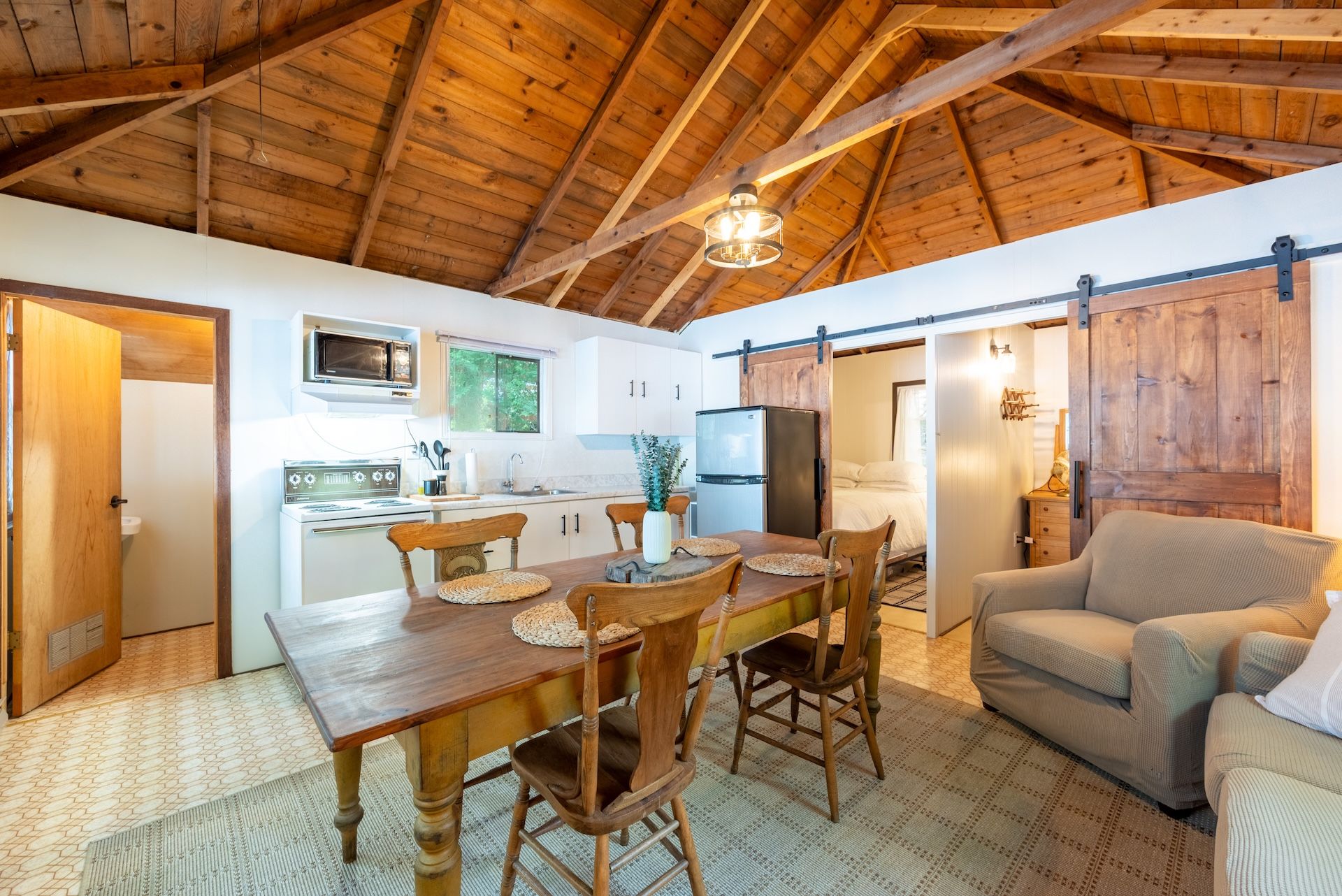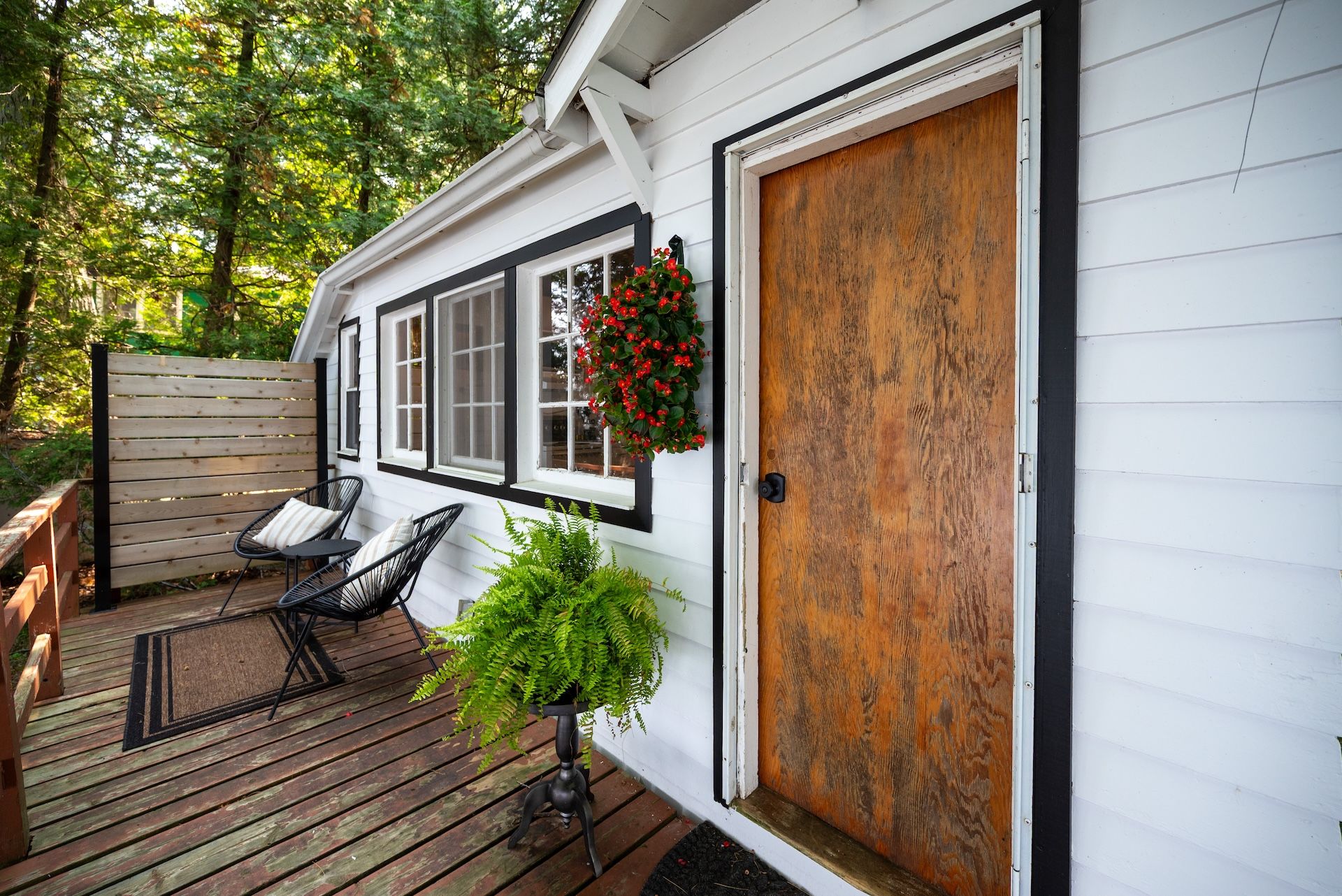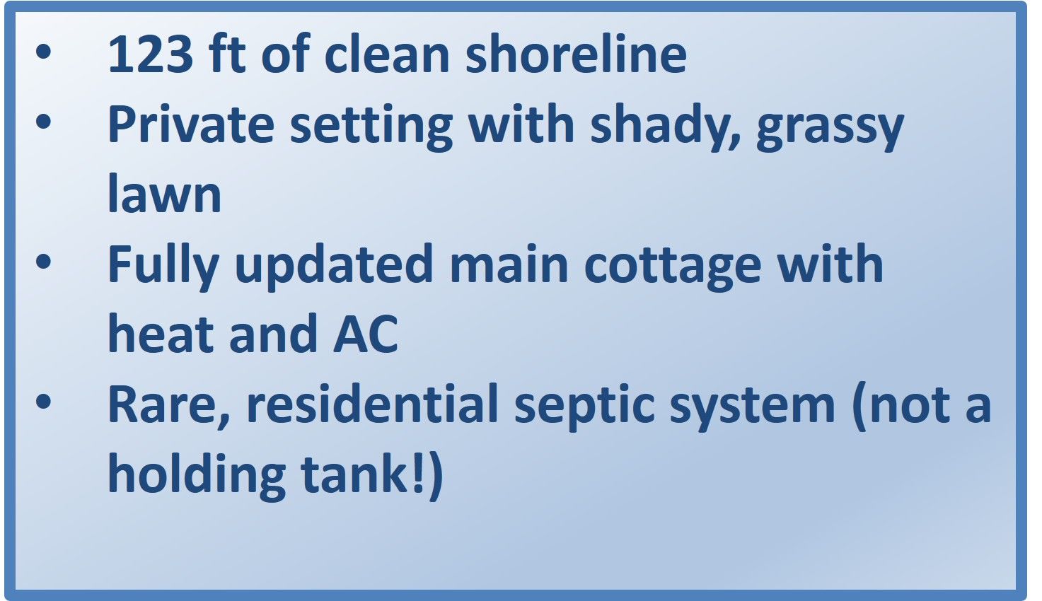 • Spacious main cottage with modern kitchen, bath, and large deck overlooking the lake.