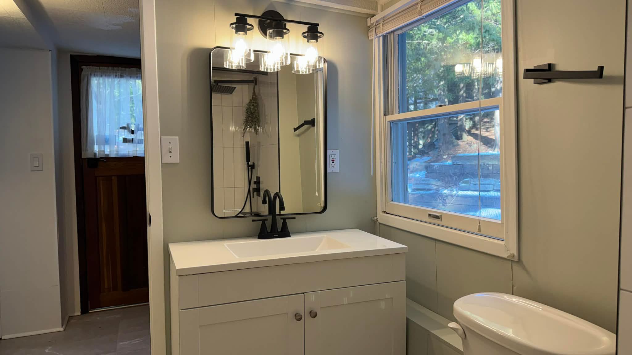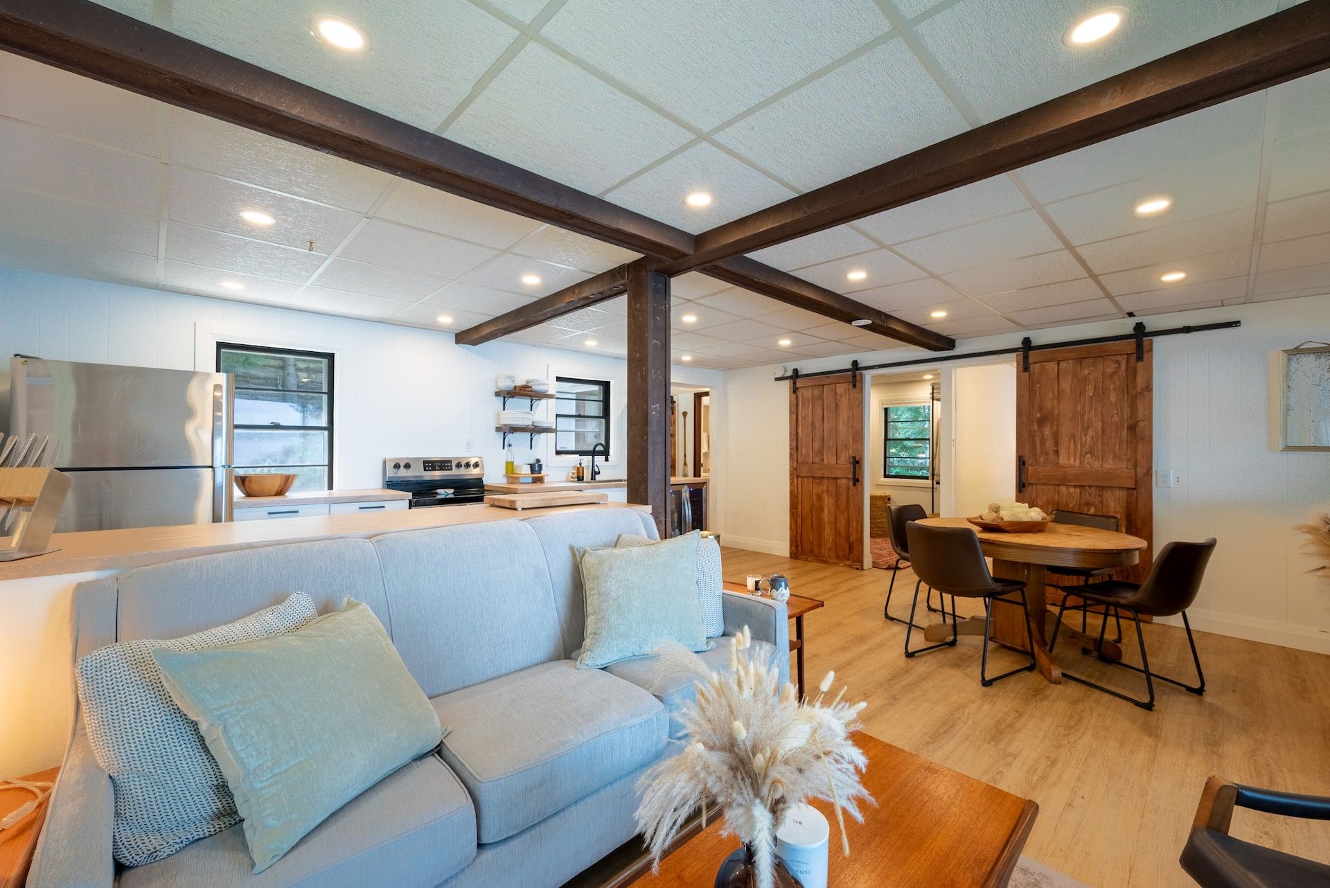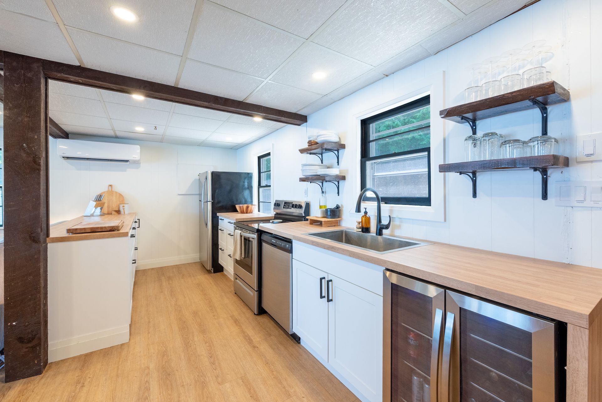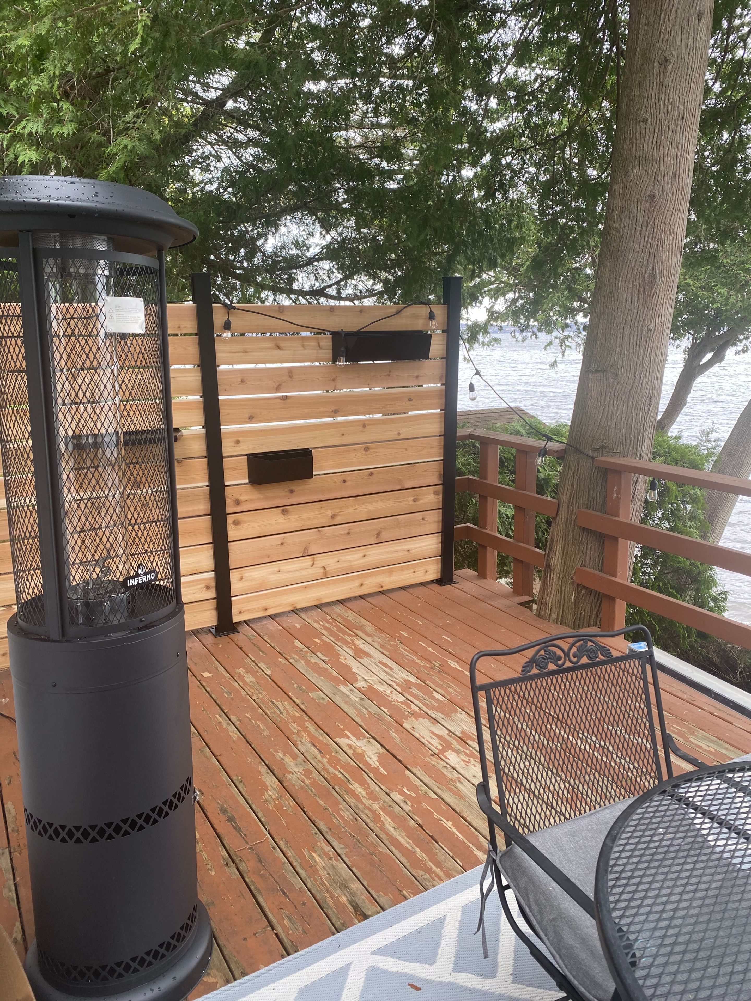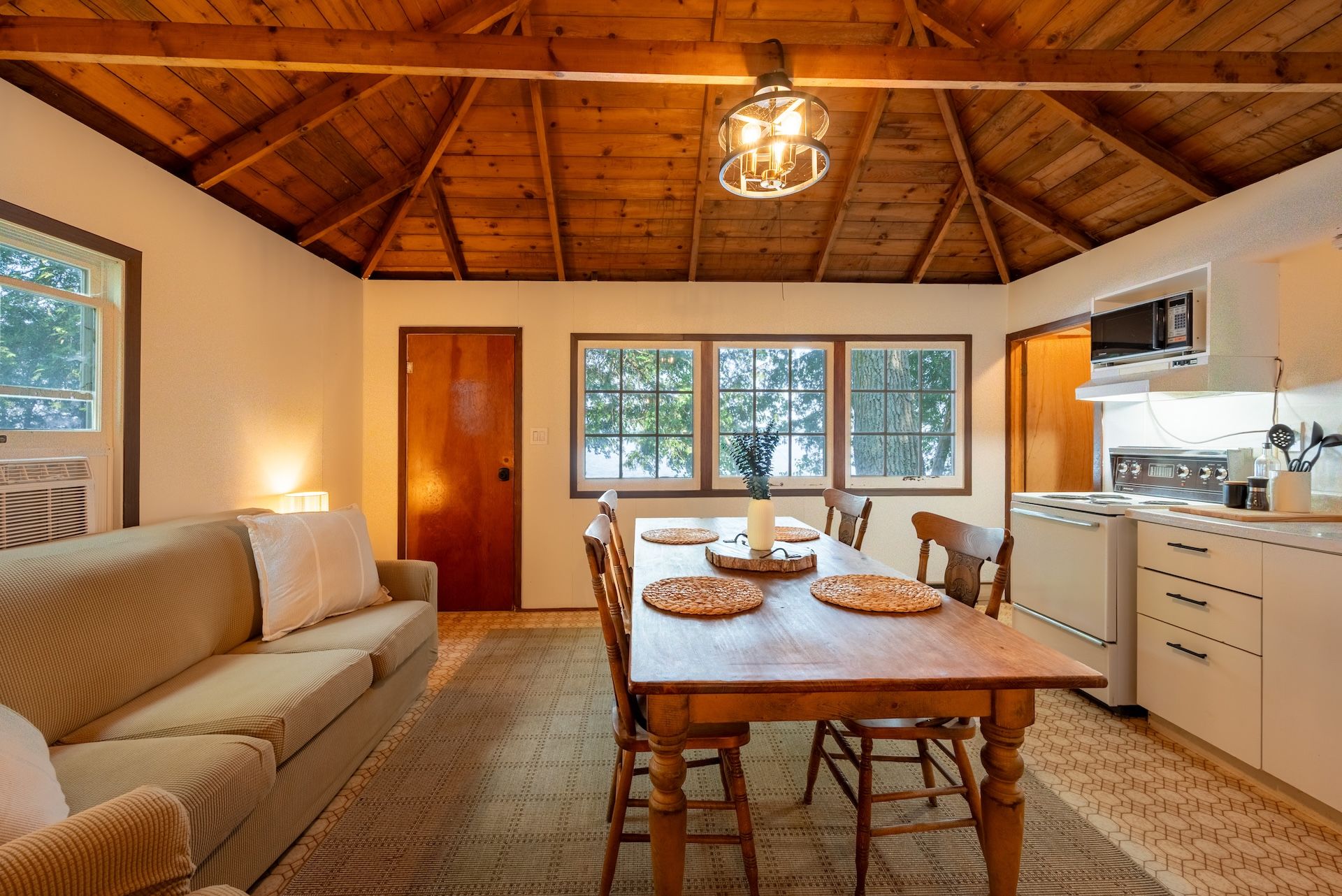 • Spacious main cottage with modern kitchen, bath, and large deck overlooking the lake.