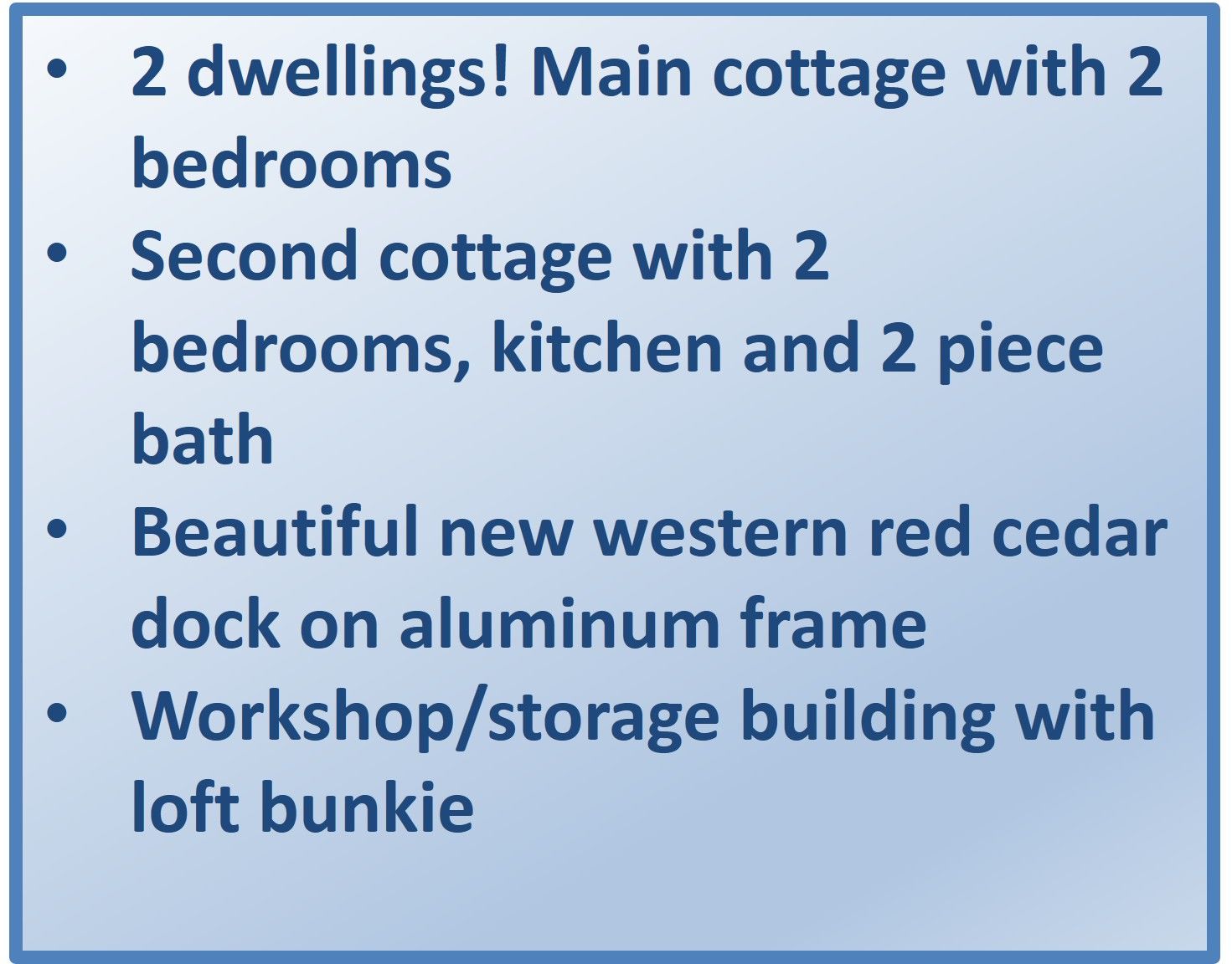 • Turn-key waterfront property with two updated dwellings and a workshop.