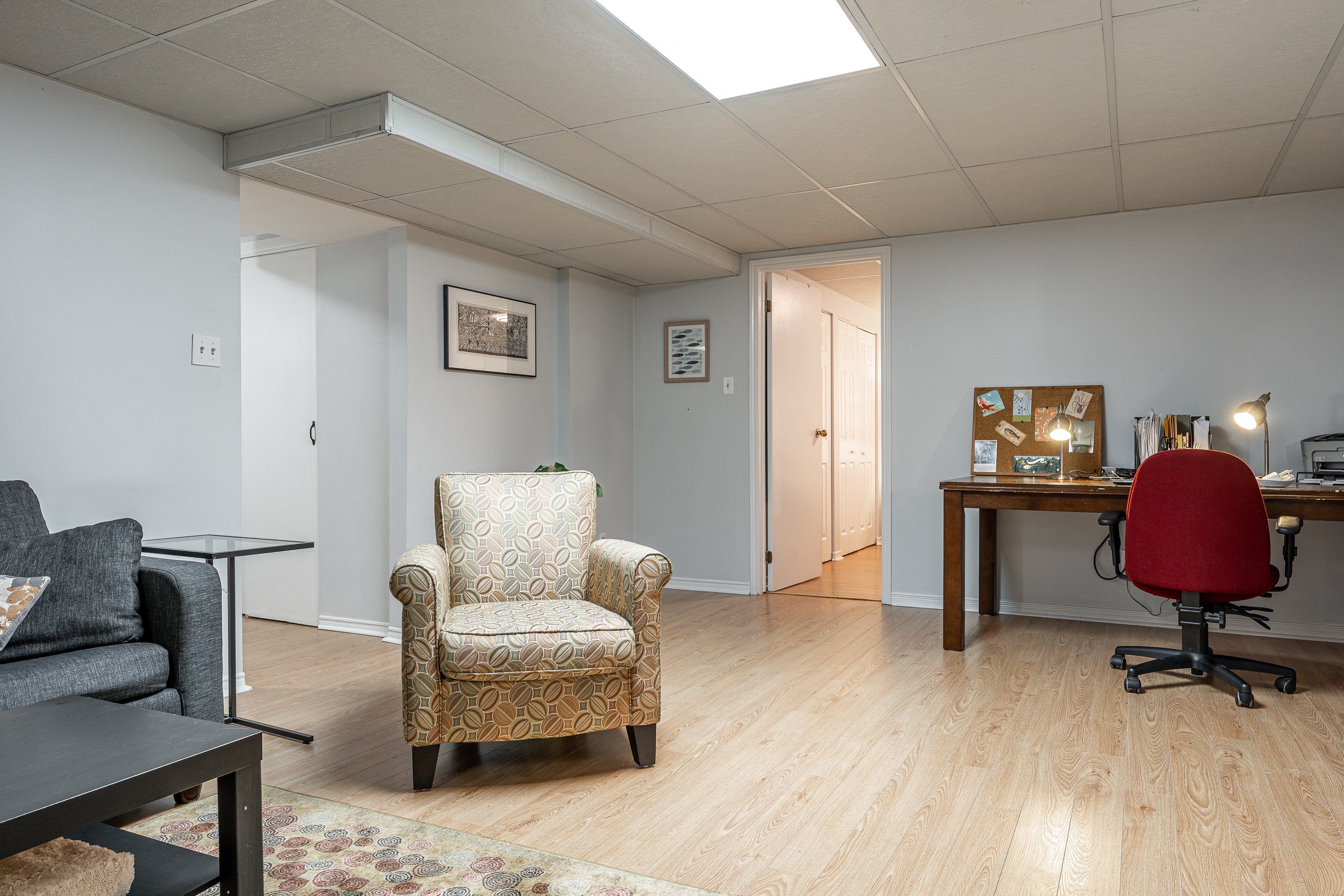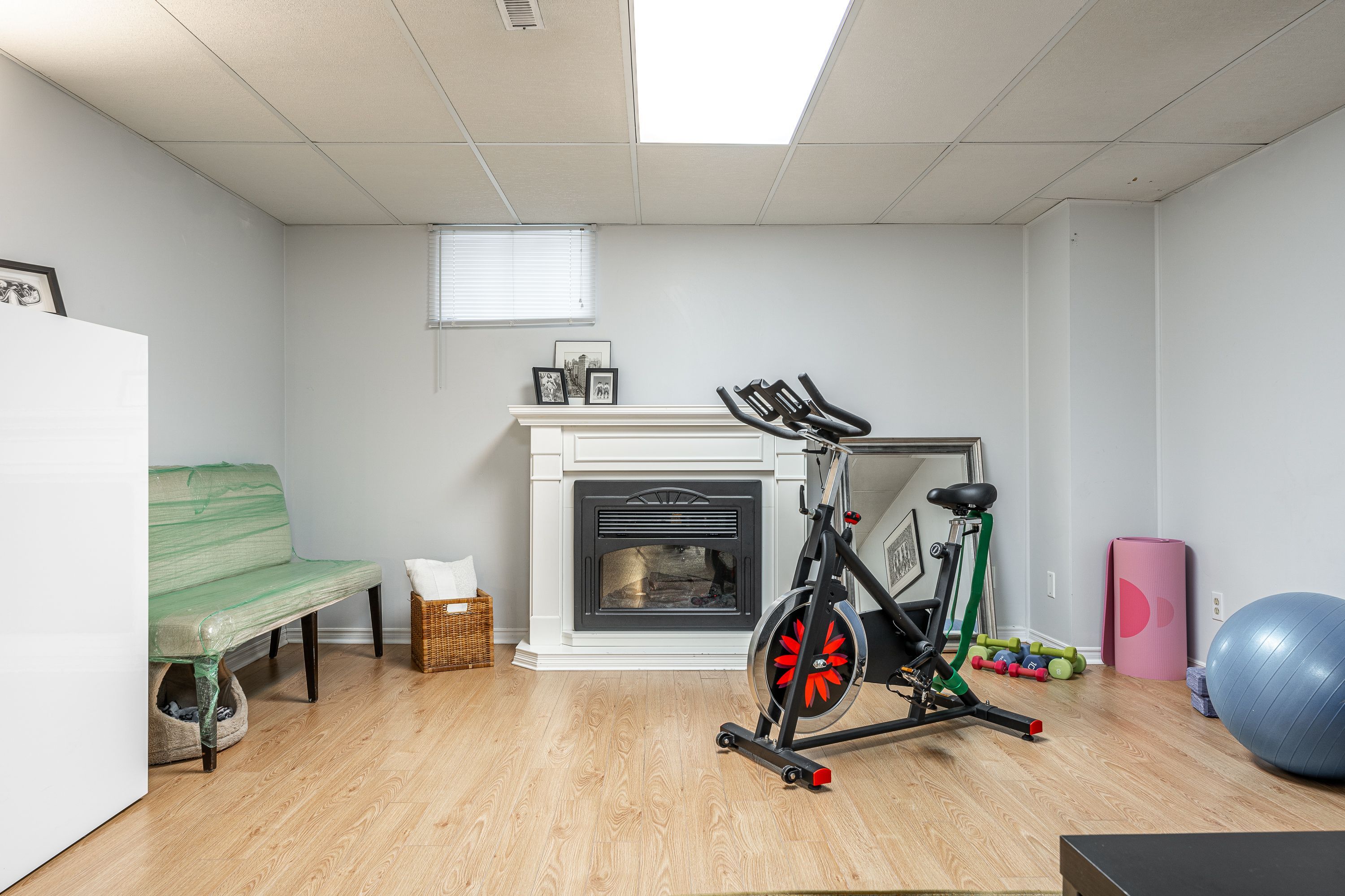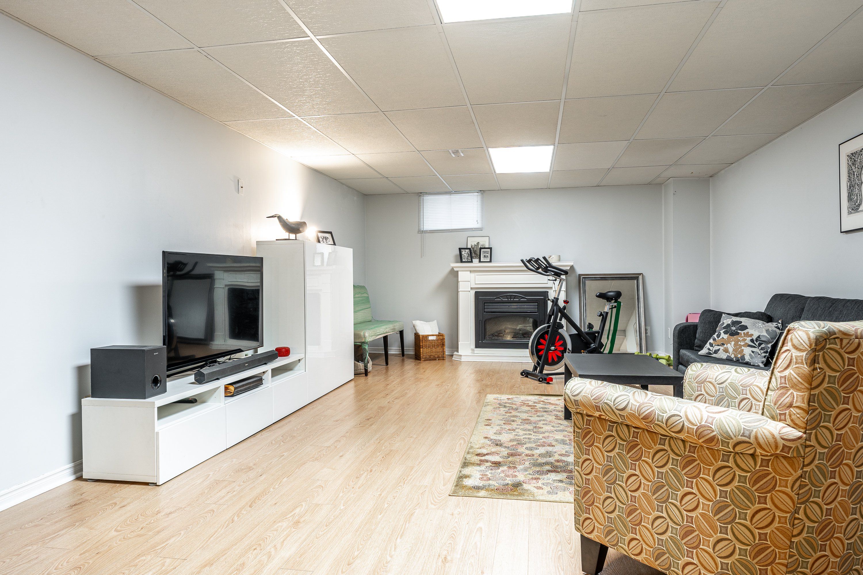 • Lower level features a family room with electric fireplace and laundry area.