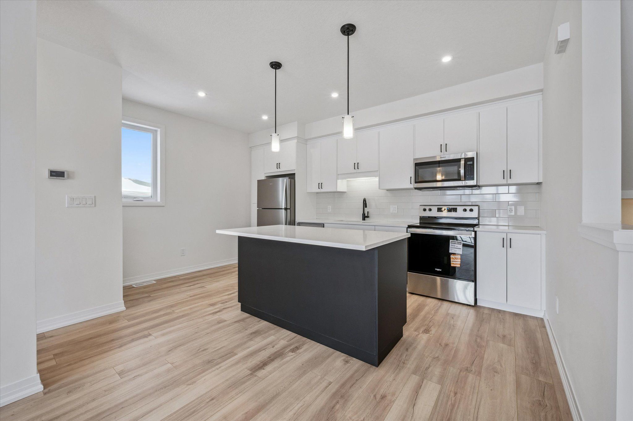 • Modern kitchen with stylish island and white cabinetry.