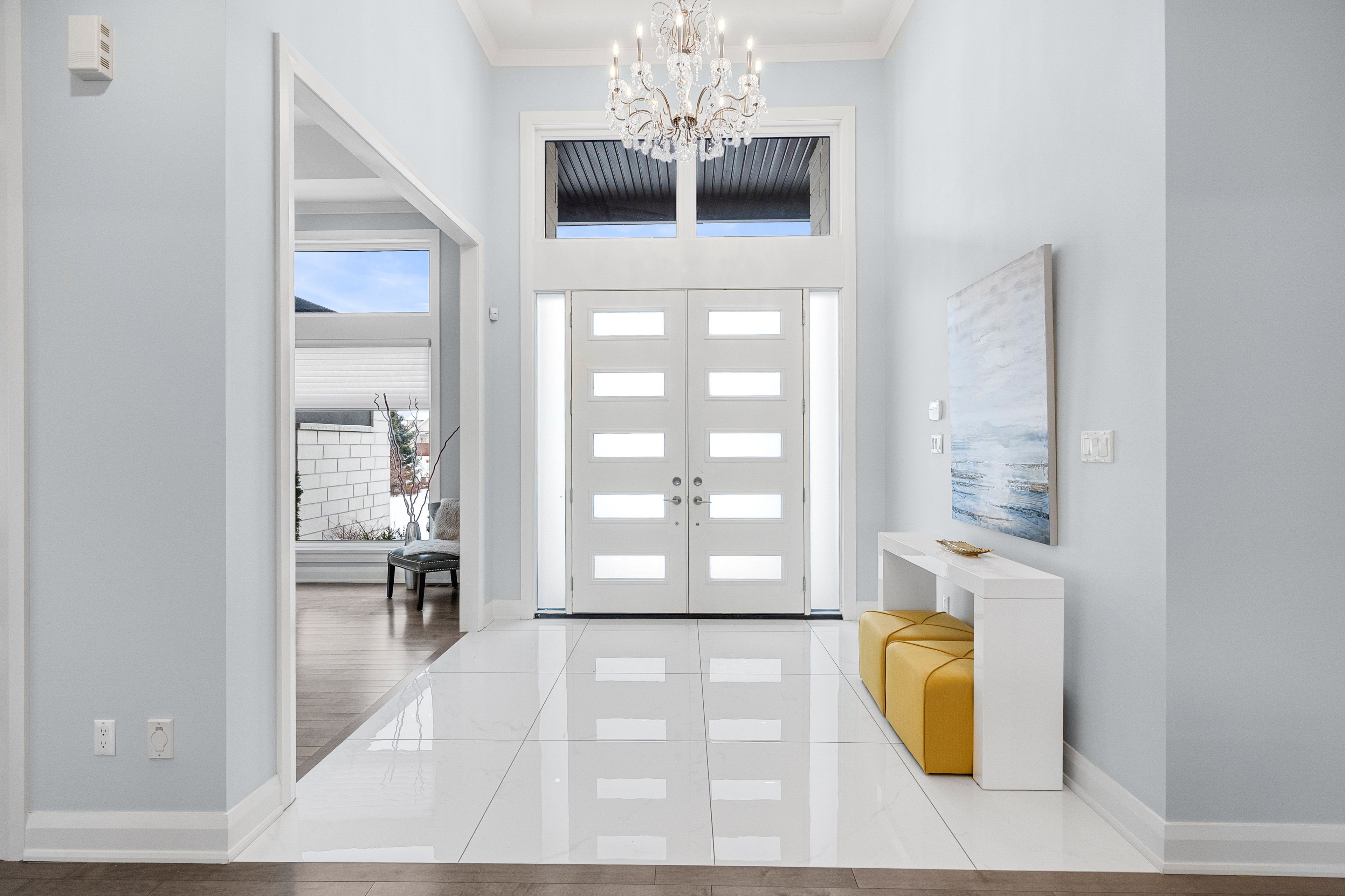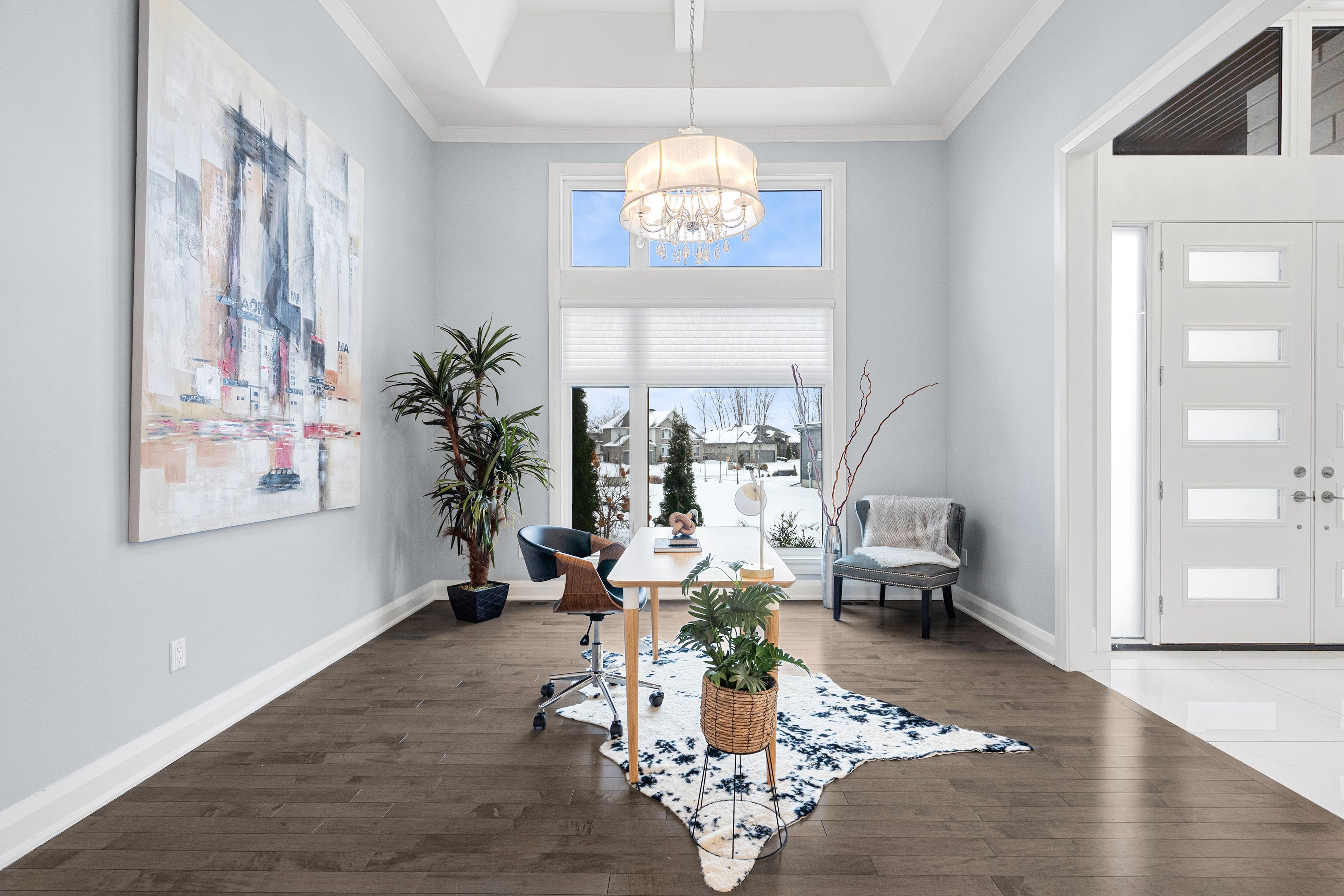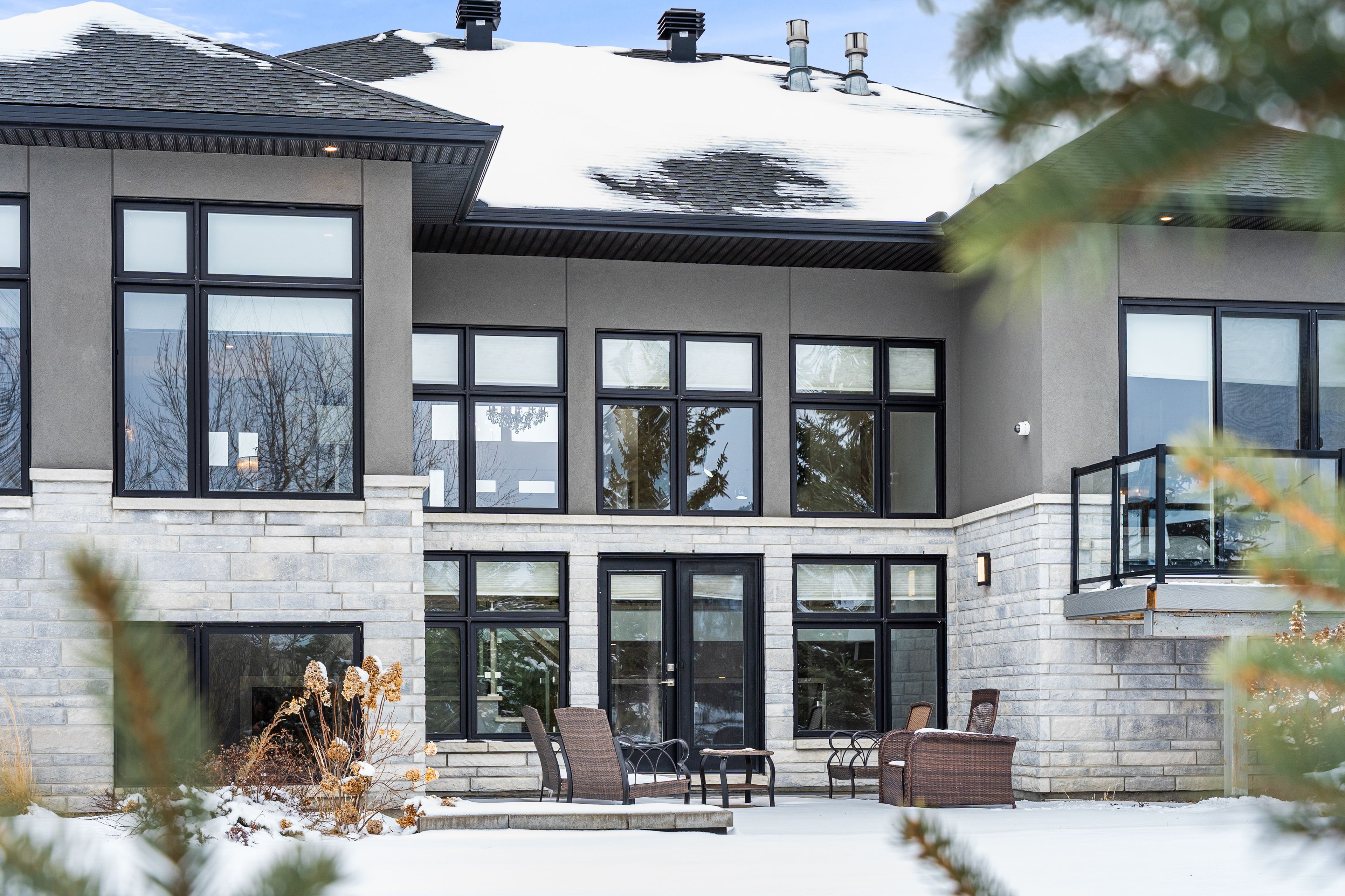 Welcome to this picasso custom-built estate bungalow in prestigious manotick estates, set on a rare 116 x 269 ft lot surrounded by professionally landscaped grounds with full irrigation, techo-bloc hardscaping, and southwest exposure. The home's limestone styled and stucco exterior sets the tone for the architectural elegance within. Inside, soaring 10-foot ceilings throughout are elevated by striking architectural details including a 15-foot foyer, 12-foot coffered living room, 13-foot coffered office, and tray ceilings in the kitchen and dining areas. Maple flooring flows throughout the main level, adding warmth and continuity to the design. At the heart of the home, the chef's kitchen is designed for both everyday living and entertaining, featuring a dramatic quartz waterfall island, pot filler, thermador gas stovetop, and electrolux commercial-grade refrigerator/freezer. The primary suite is a private retreat with a raised ceiling and spa-inspired ensuite featuring a pedestal tub, glass shower finished with moroccan quatrefoil tile, and refined finishes throughout. The walkout lower level extends the living space with exceptional natural light, additional bedrooms, and flexible recreation areas. Outdoor living is equally impressive with a trex deck with glass railings, designed to capture evening sunsets across the expansive backyard. And a 3 car garage for enthusiasts. A rare offering combining architectural sophistication, thoughtful design, and estate-scale living minutes from the city and charm of manotick village.