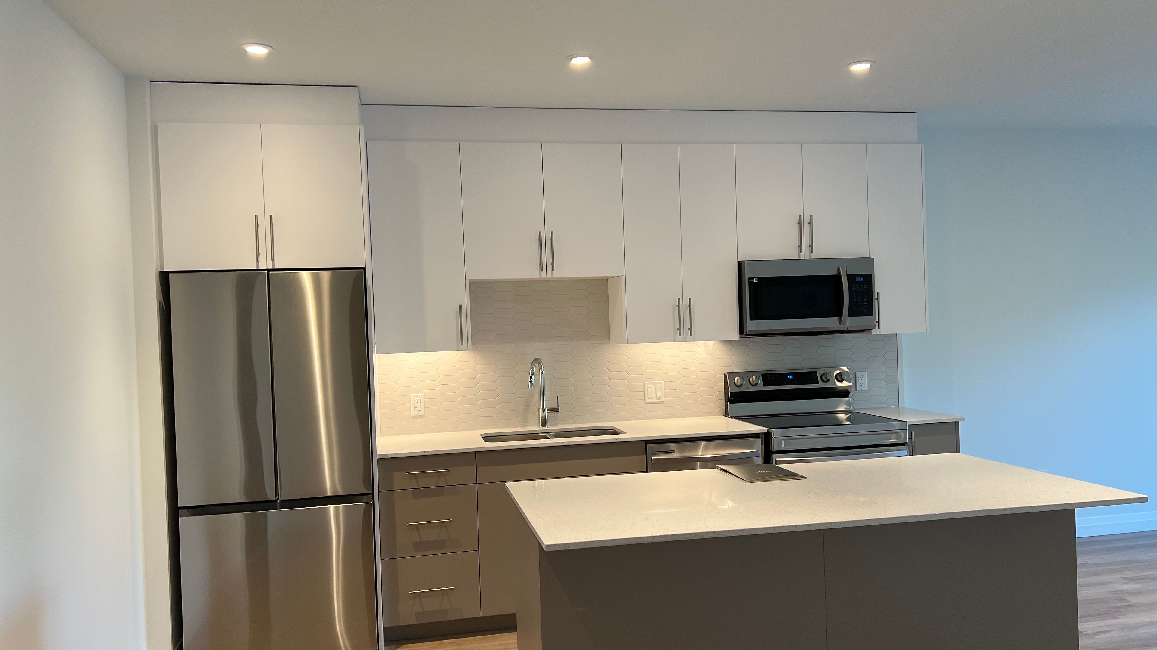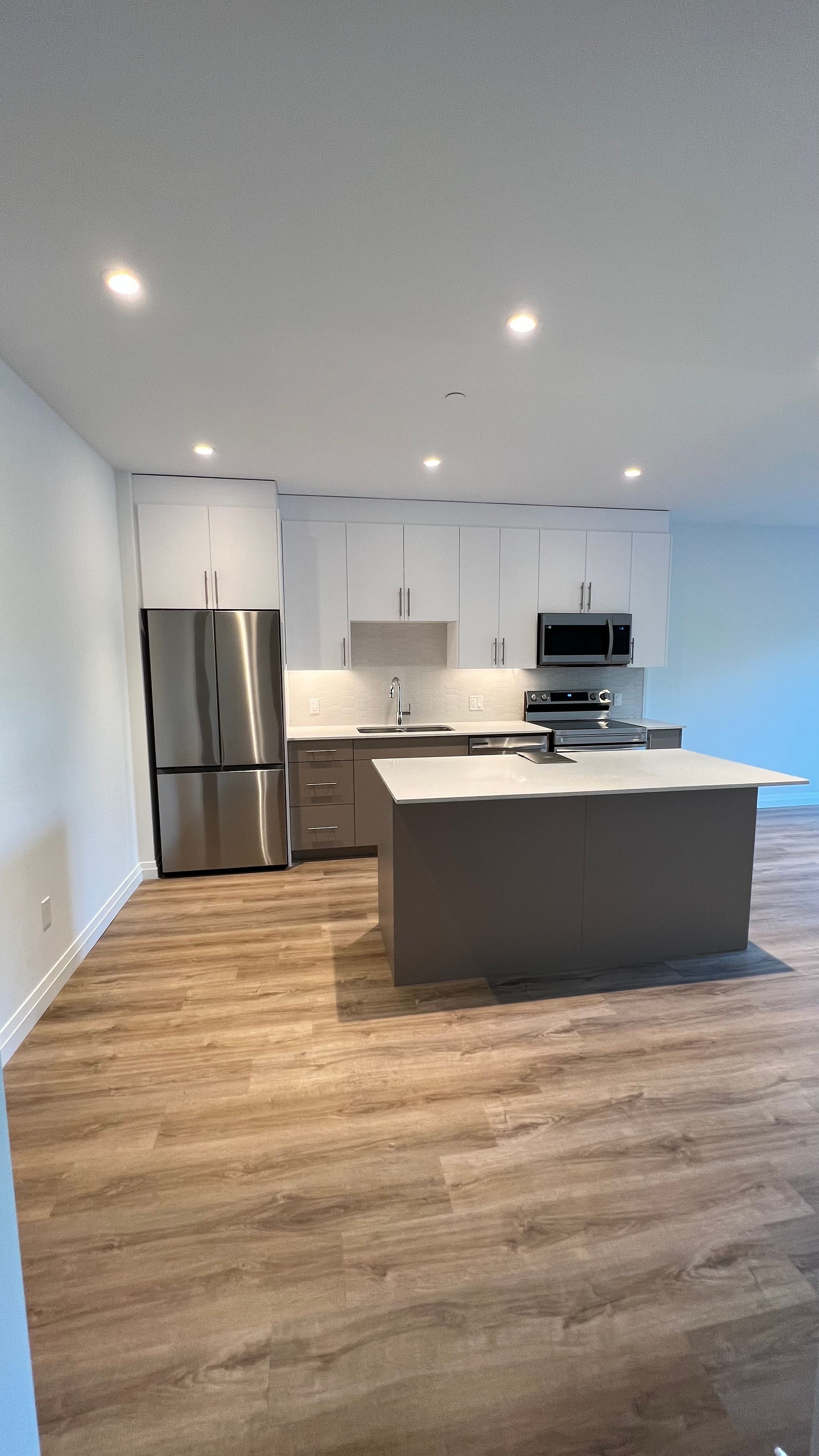 • Contemporary kitchen with stainless steel appliances and spacious island.