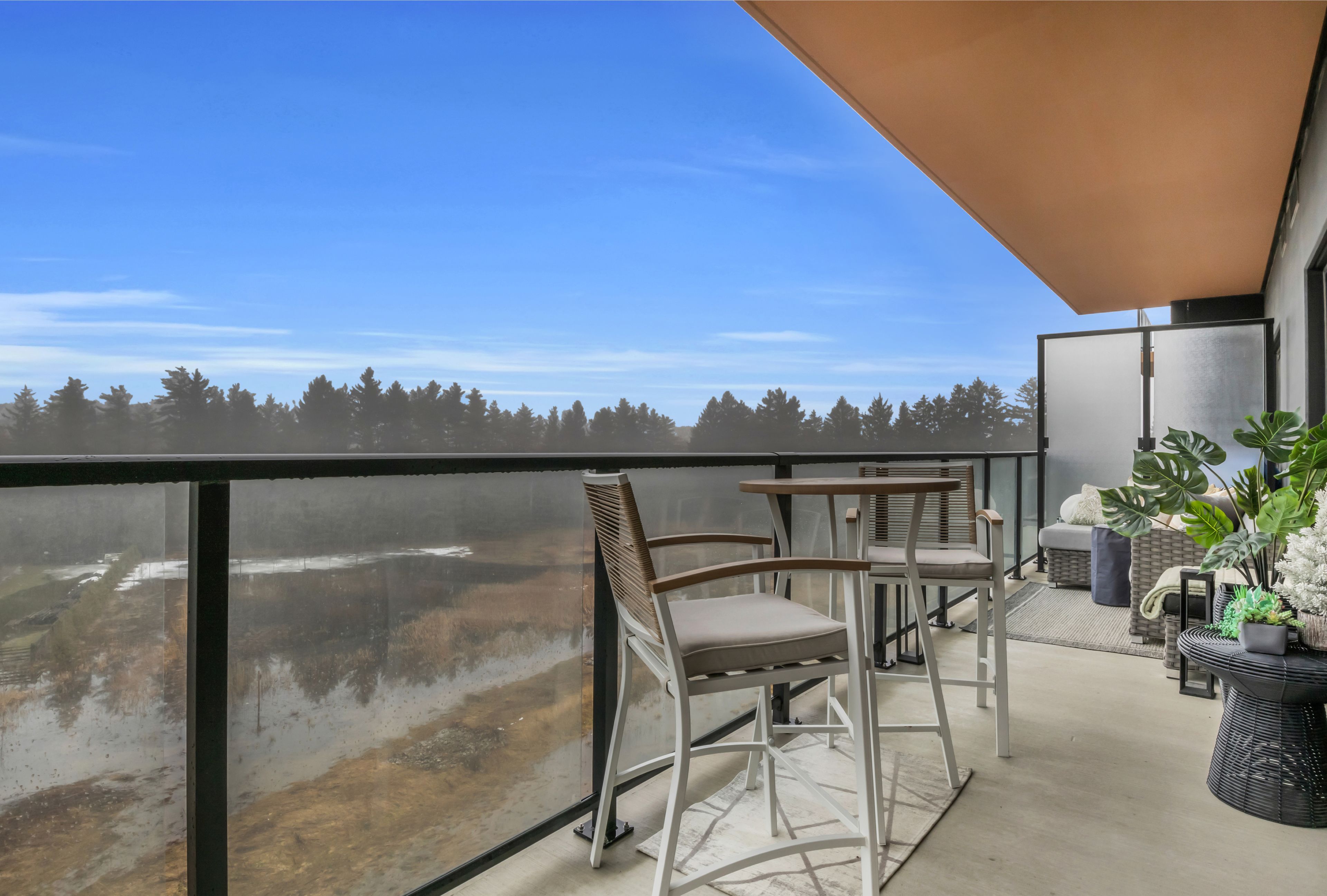 Arguably one of the most desirable vantage points at rainbow flats, this beautifully styled 2-bedroom, 2-bathroom suite offers peaceful pond and forest views with a spacious balcony that feels like a private extension of the home. Welcome to suite 507 at 525 new dundee road in kitchener's sought-after rainbow flats community. Offering 951 sq. Ft. Of thoughtfully designed living space, this impeccably maintained condo features a coveted 2-bedroom, 2-bathroom layout with timeless, neutral finishes throughout. The bright open-concept design is both stylish and functional, with clean lines and a magazine-worthy aesthetic. The kitchen features stainless steel appliances, ample cabinetry, and flows seamlessly into the living and dining areas, creating a comfortable setting for both everyday living and entertaining. The spacious private balcony serves as a true extension of the suite, providing a rare vantage point with tranquil views of the pond, surrounding forest, and green space. Positioned on the fifth floor, the suite enjoys an ideal balance of elevation, privacy, and connection to nature. The primary bedroom features a walk-in closet and 3-piece ensuite, while the second bedroom and full bathroom offer flexibility for guests, family, or a home office. Residents enjoy excellent amenities including a fitness centre, yoga studio with sauna, library, social lounge, party room, and pet wash station. With exclusive resident access to the adjacent pond and conservation trails just steps from the building, rainbow flats offers a unique cottage life in the city lifestyle while remaining close to everyday conveniences. Beautifully maintained and move-in ready, this is refined, low-maintenance living surrounded by nature.