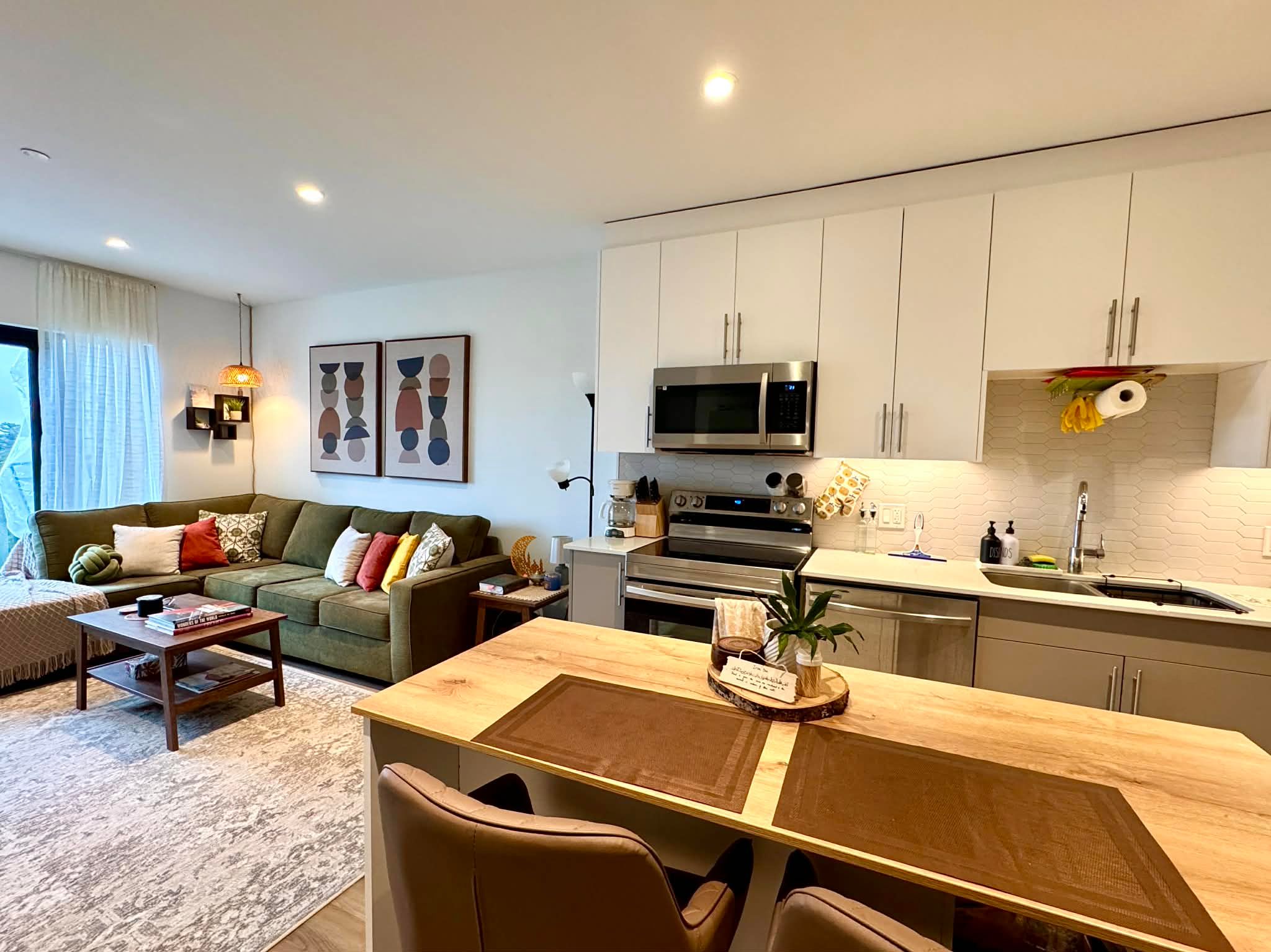 • Well-equipped kitchen with stainless steel appliances and large island.