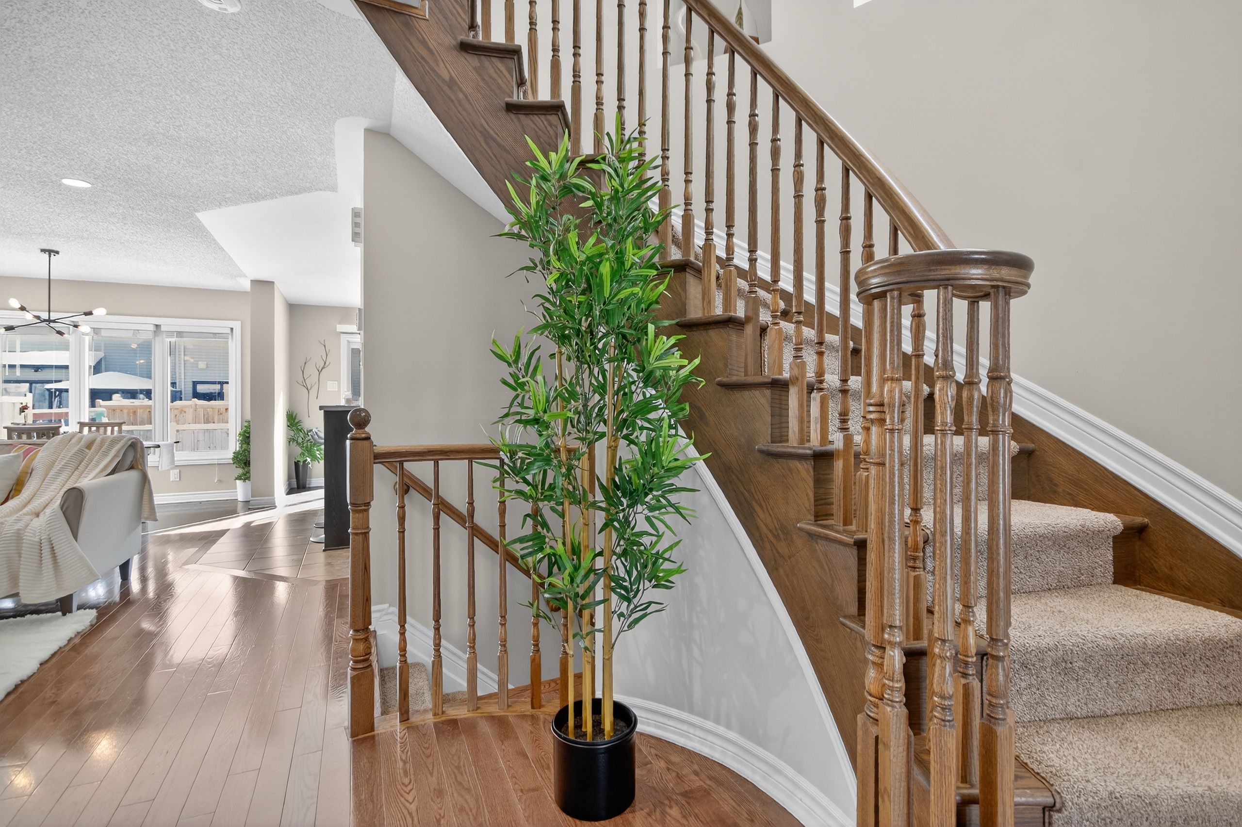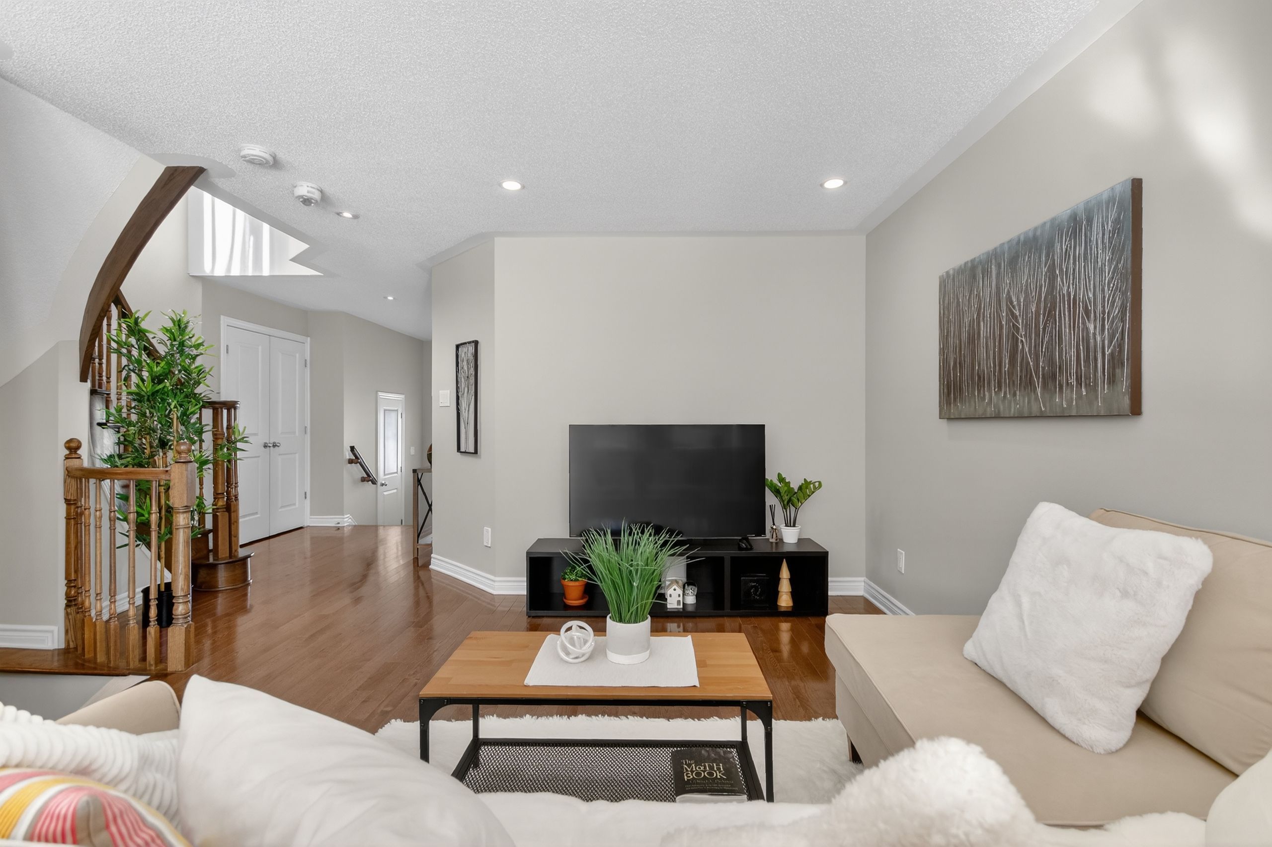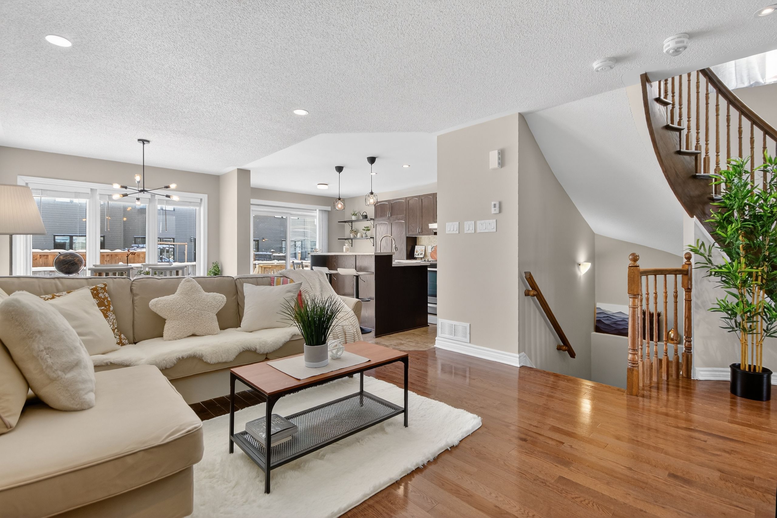 • Main floor with hardwood flooring, large living room, and open-concept kitchen.