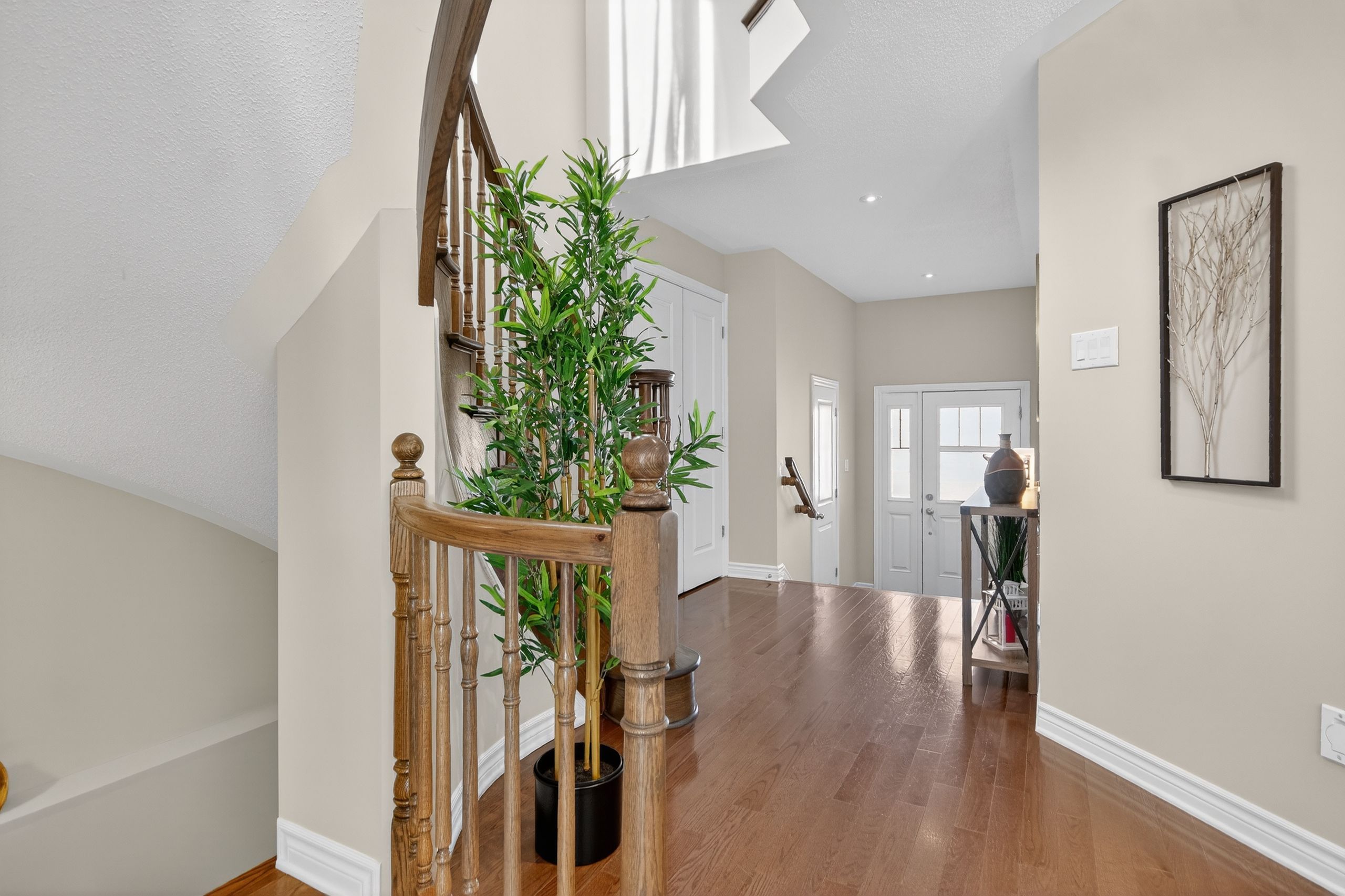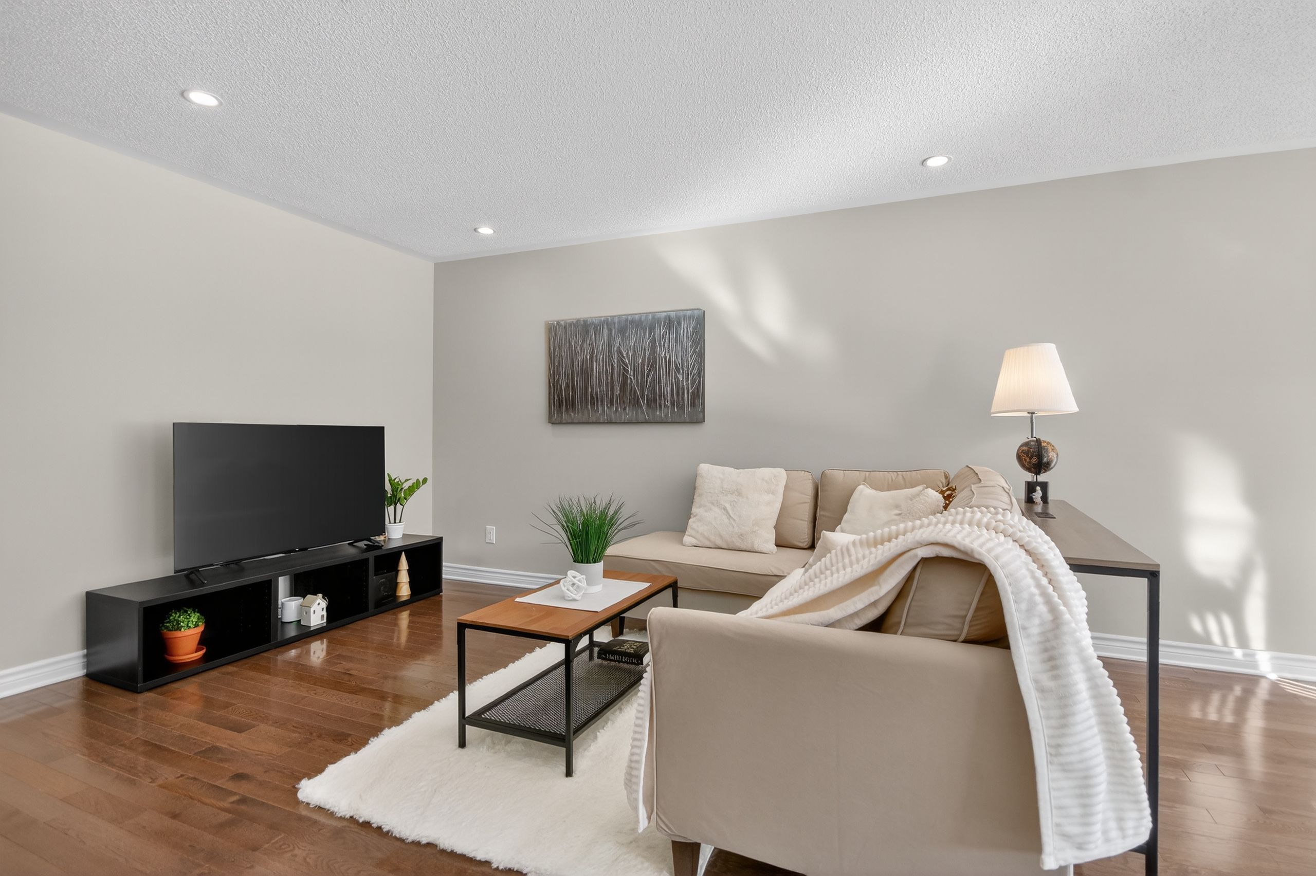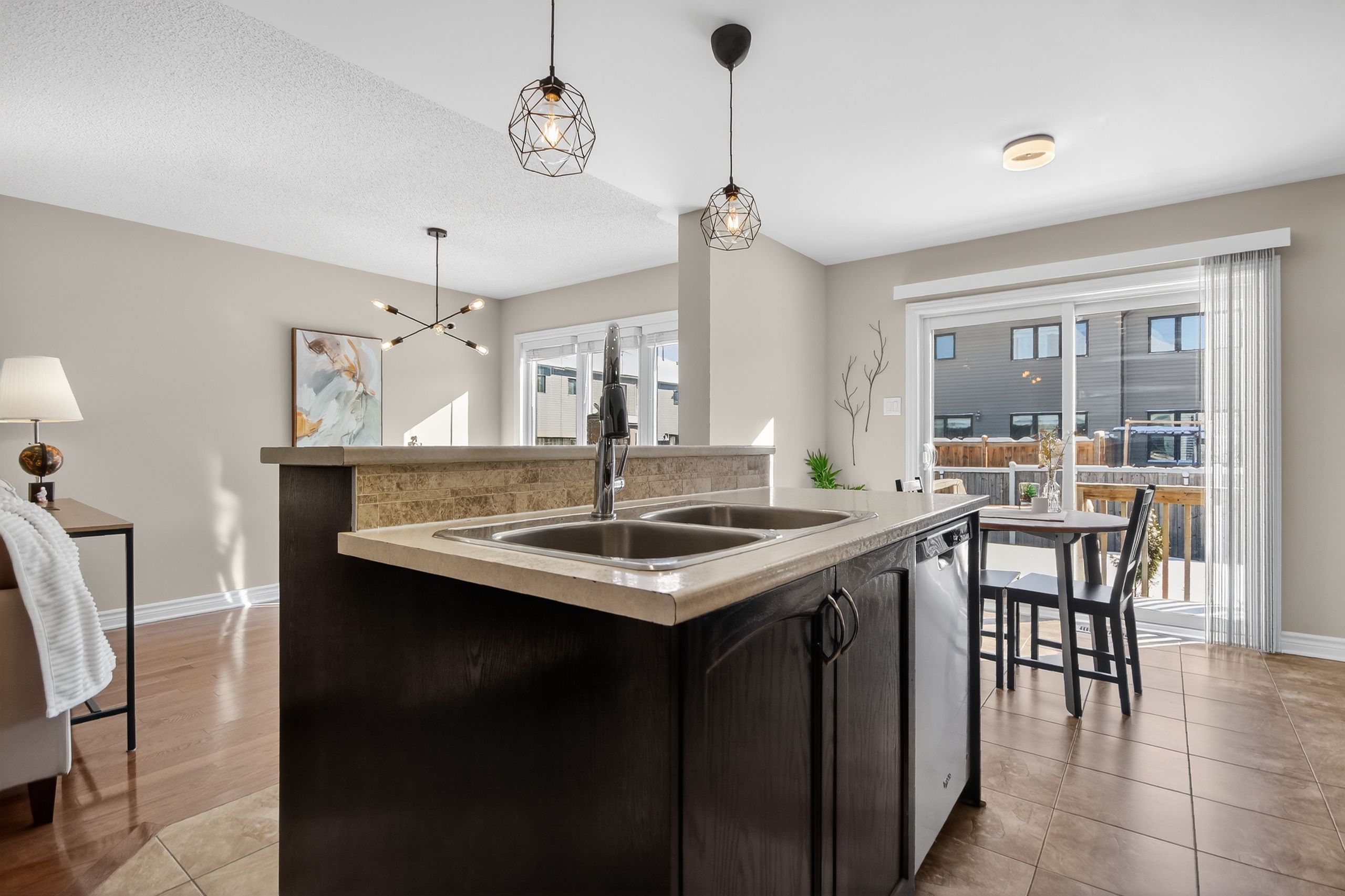 • Main floor with hardwood flooring, large living room, and open-concept kitchen.