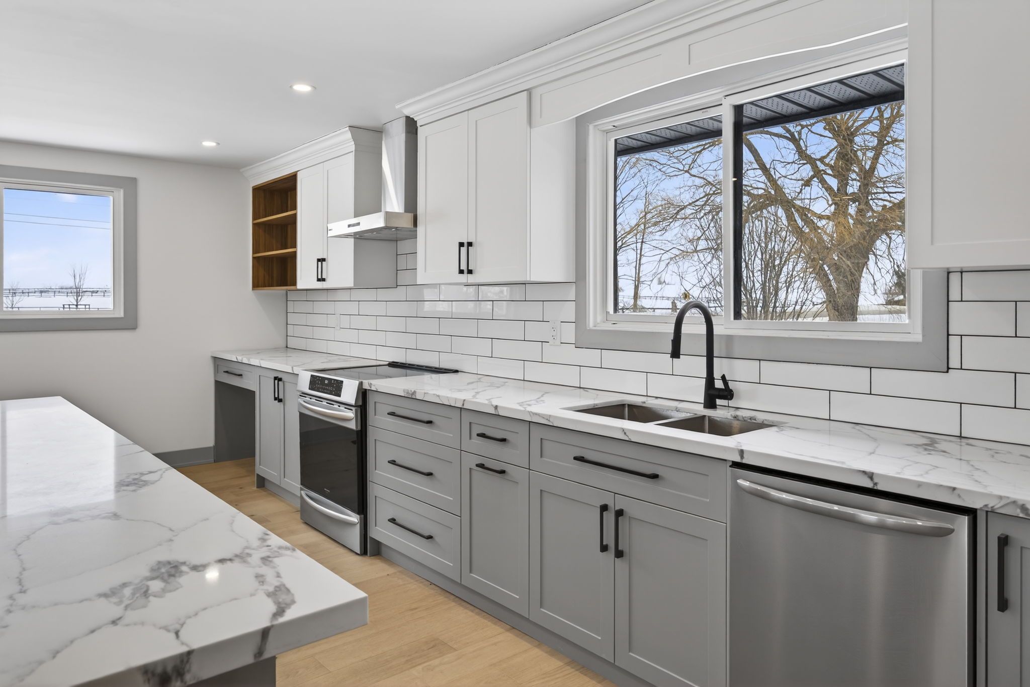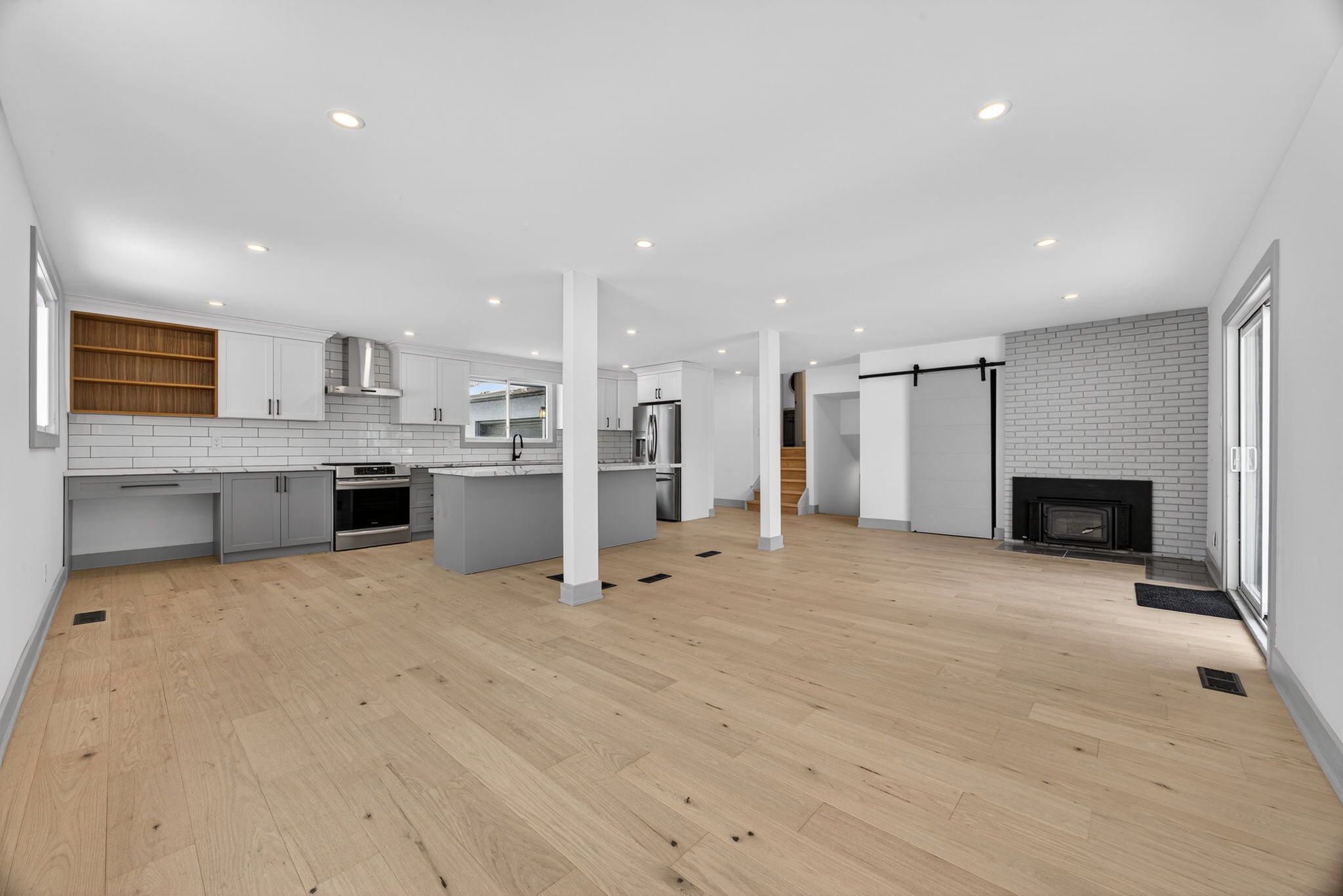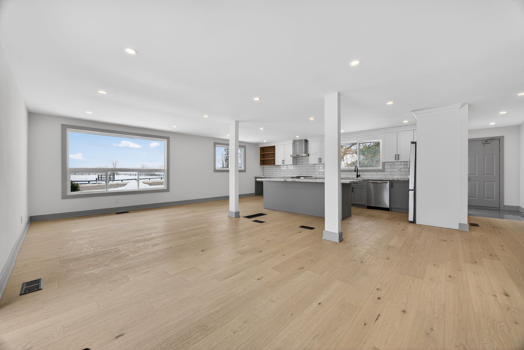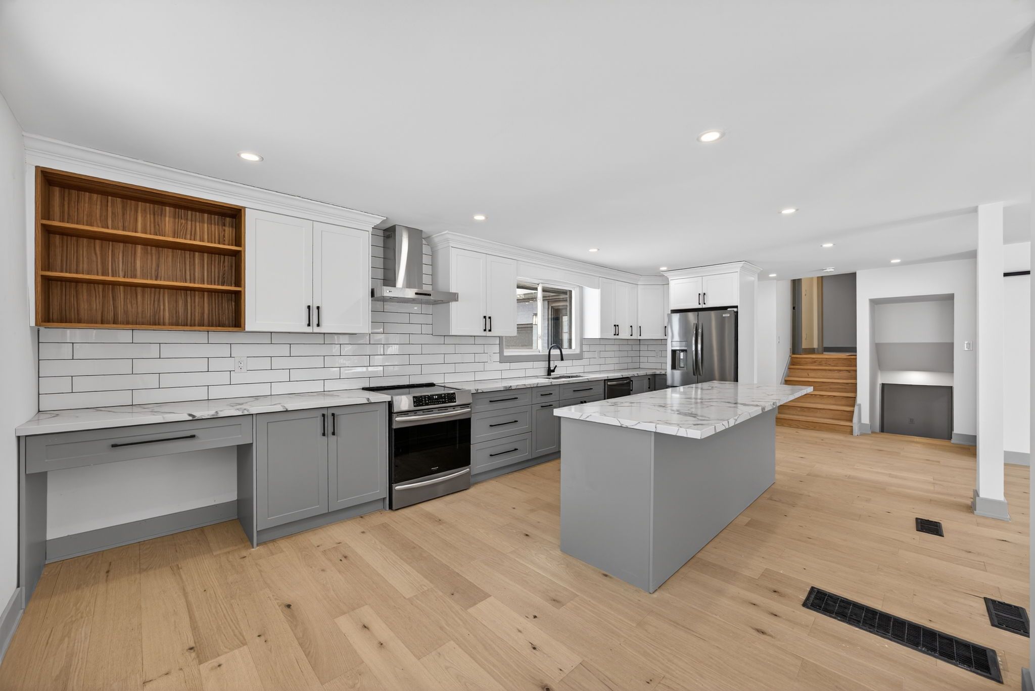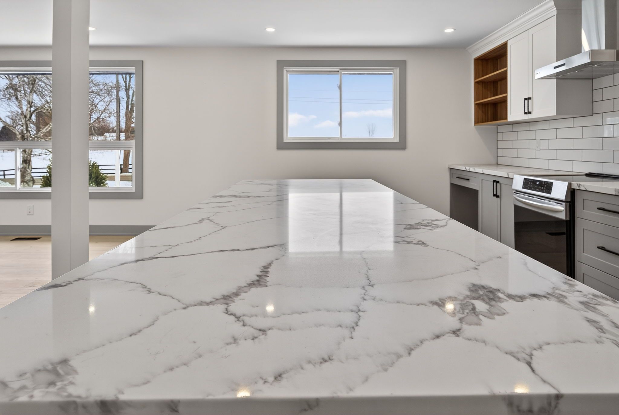 • Massive kitchen with island, quartz countertops, and stainless steel appliances.