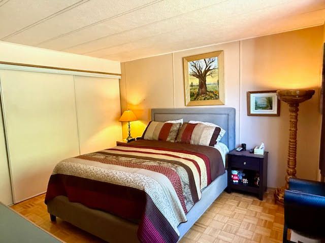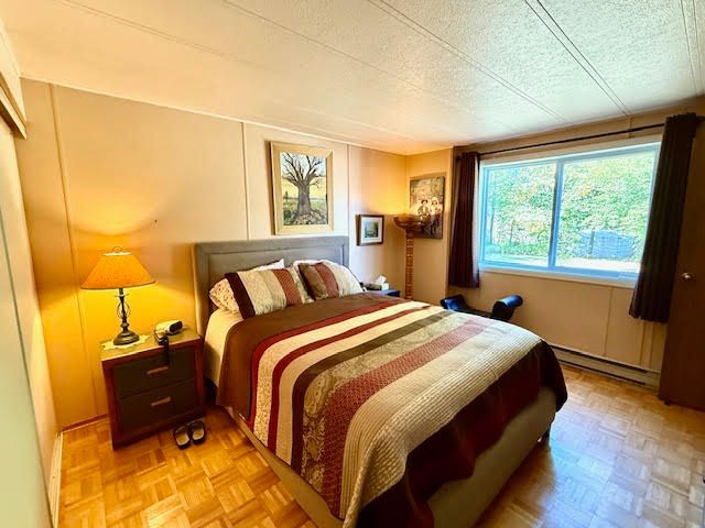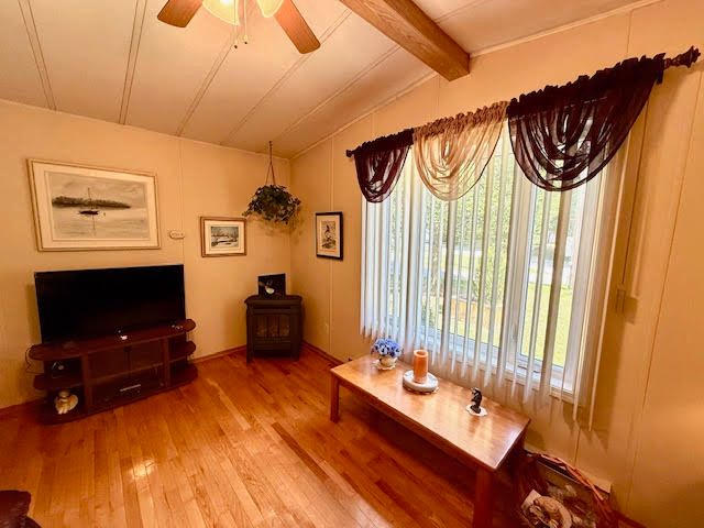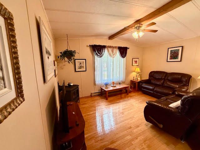 Welcome to this charming 2-bedroom mobile home on leased land, offering comfort and functionality in a peaceful and private setting. The inviting living room features hardwood flooring and a cozy propane fireplace, while the bright eat-in kitchen is perfect for everyday meals. The spacious primary bedroom boasts a wall-to-wall closet, and the main bath conveniently combined with the laundry area. Step outside to enjoy a covered/enclosed patio overlooking a large private yard, ideal for outdoor relaxation or entertaining. A rare find, this property includes a back-to-back double garage (9. 15m x 4. 55m) and an oversized driveway with parking for at least 10 vehicles. A wonderful opportunity for buyers seeking space, comfort, and exceptional value! Access to all of campground facilities including a restaurant, salt water pool, pond and beach area, petanque, shuffleboard, pickle ball court, beach volleyball and even a park. Planned activities every weekend of the summer.