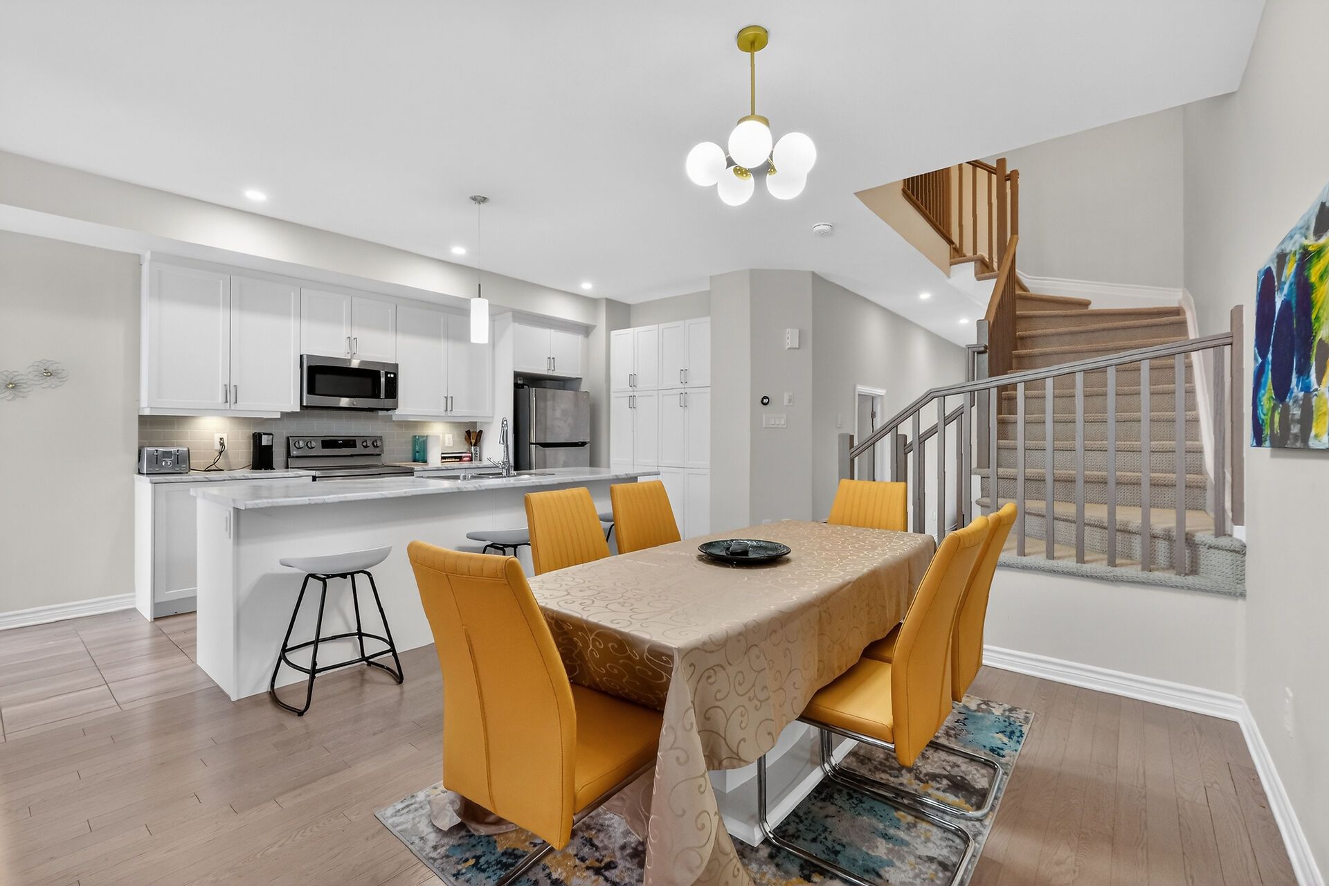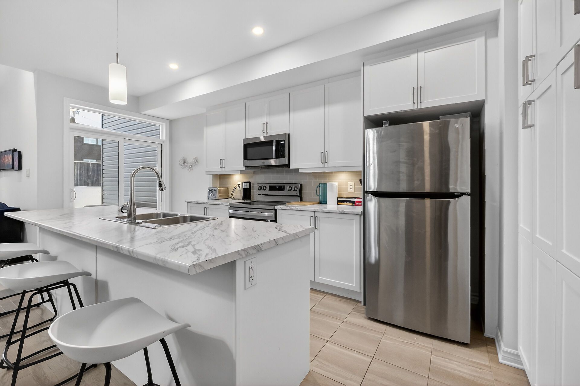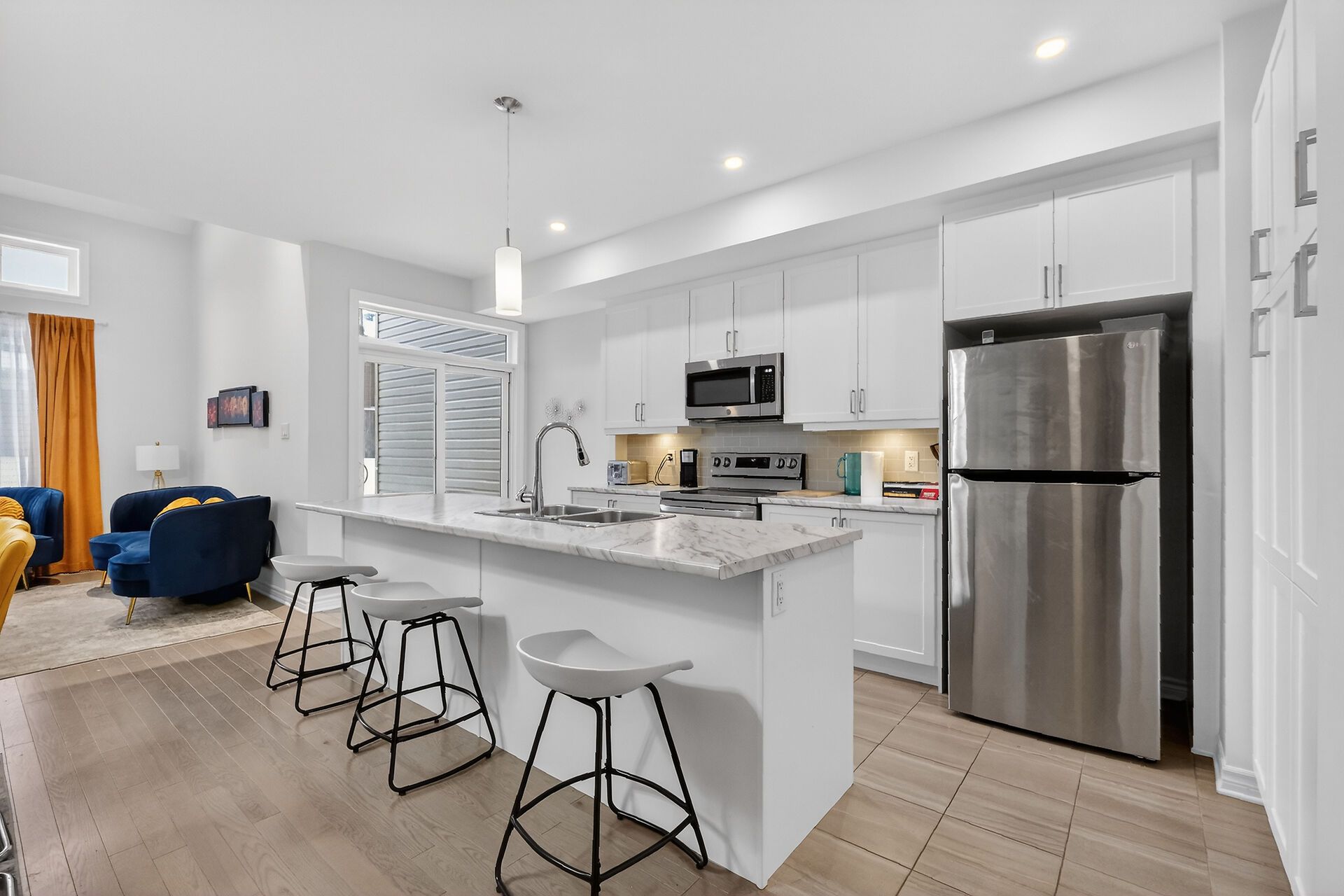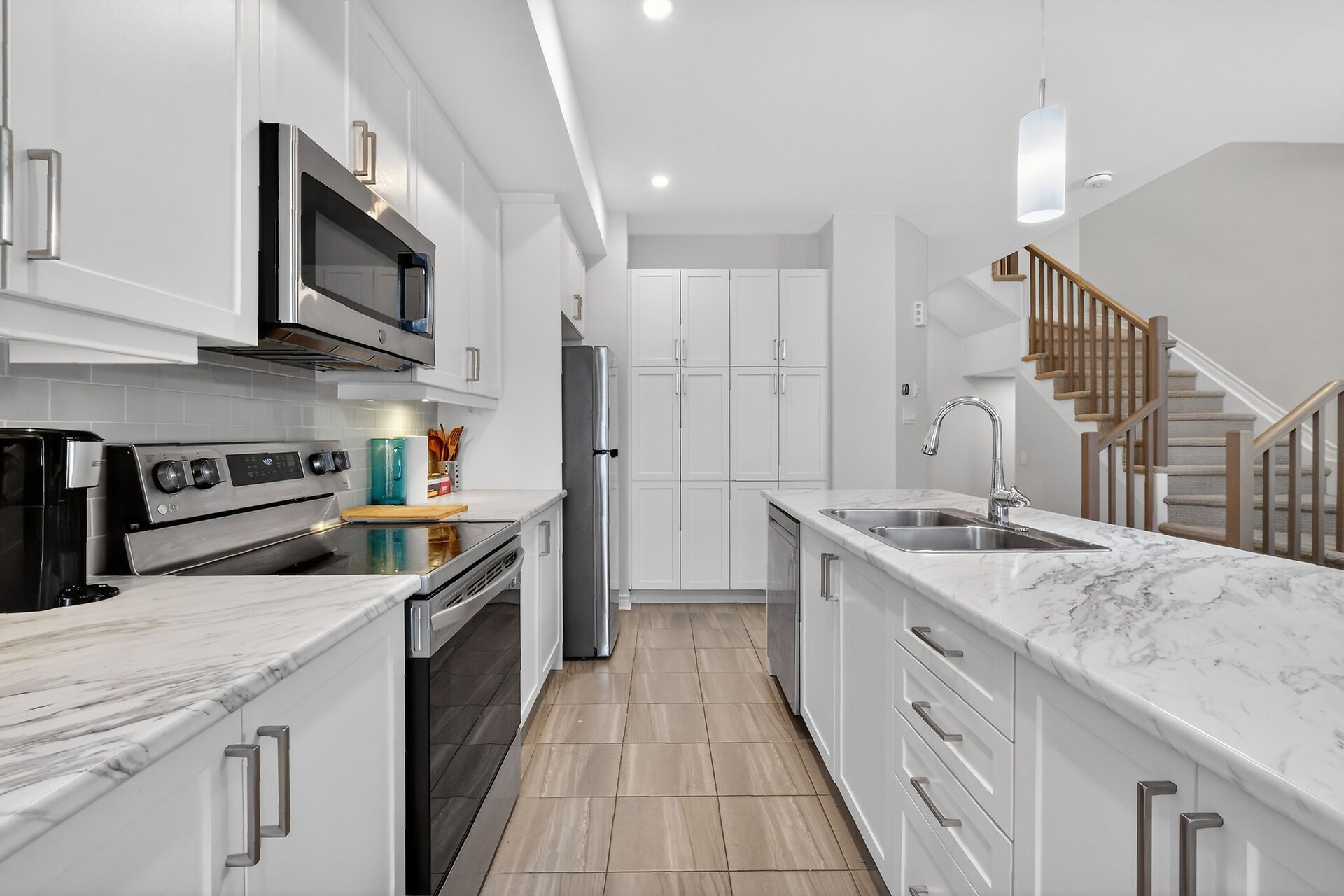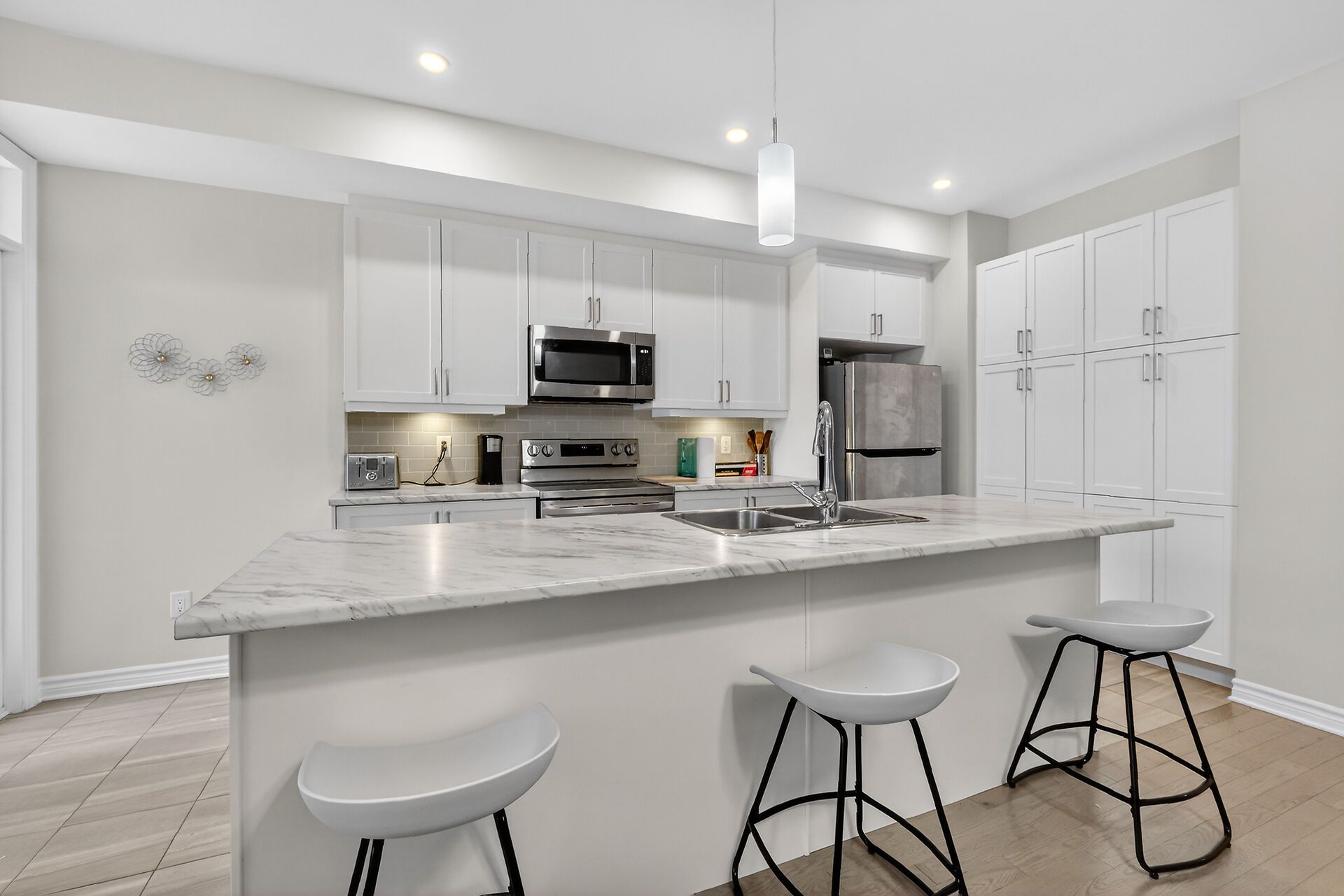 This stunning four-bedroom, three-bathroom townhouse feels like a single-family home in both space and design, seamlessly blending modern upgrades with comfort. Here's a look at its features:main floor- foyer: a welcoming entrance that sets a positive tone.- powder room:convenient for guests.-living room: a spacious area perfect for relaxation and gatherings, highlighted by a unique ceiling design.- kitchen: upgraded with soft-close drawers, under-cabinet lighting, and a seamless cabinetry look. Beautiful pantry significantly enhance both aesthetic s and functionality of kitchen.- flooring: a stylish mix of red oak engineered hardwood and tile throughout. Second floor- primary bedroom: features an ensuite with a four-piece setup, including double sinks and a spacious walk-in closet.- additional bedrooms: two more bedrooms provide ample space for family or guests.- linen closet: for easy organization of essentials.- third bathroom: a well-appointed three-piece washroom. Basement- recreation room: ideal for entertainment and hobbies.- additional bathroom: a three-piece washroom enhances functionality. Location advantages- close to rockland golf club and walmart for convenient shopping.- nearby rockland district high school is great for families.- restaurants and amenities enrich leisure opportunities. This home combines generous living space with modern conveniences in a prime location, making it an excellent choice for families.