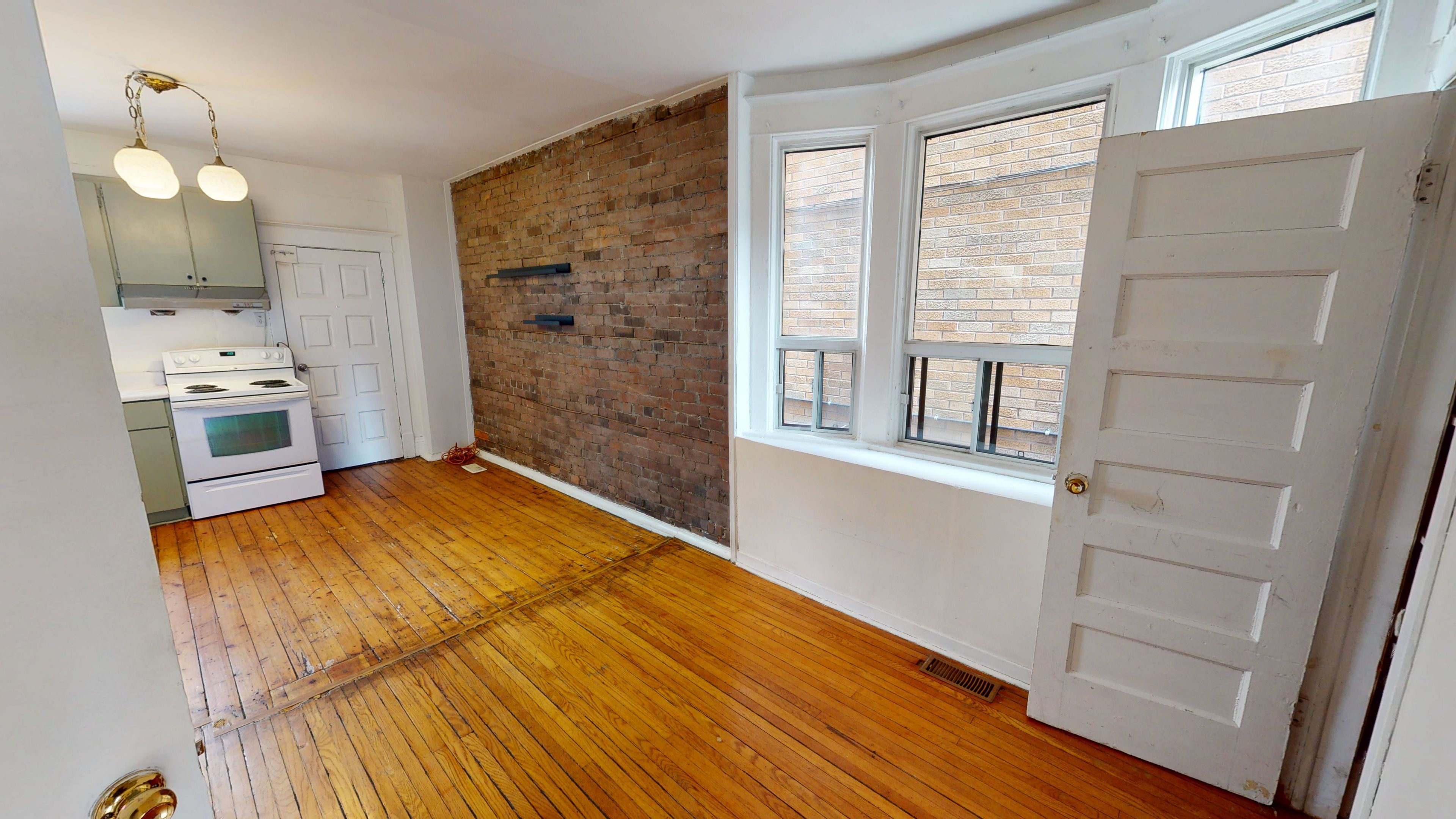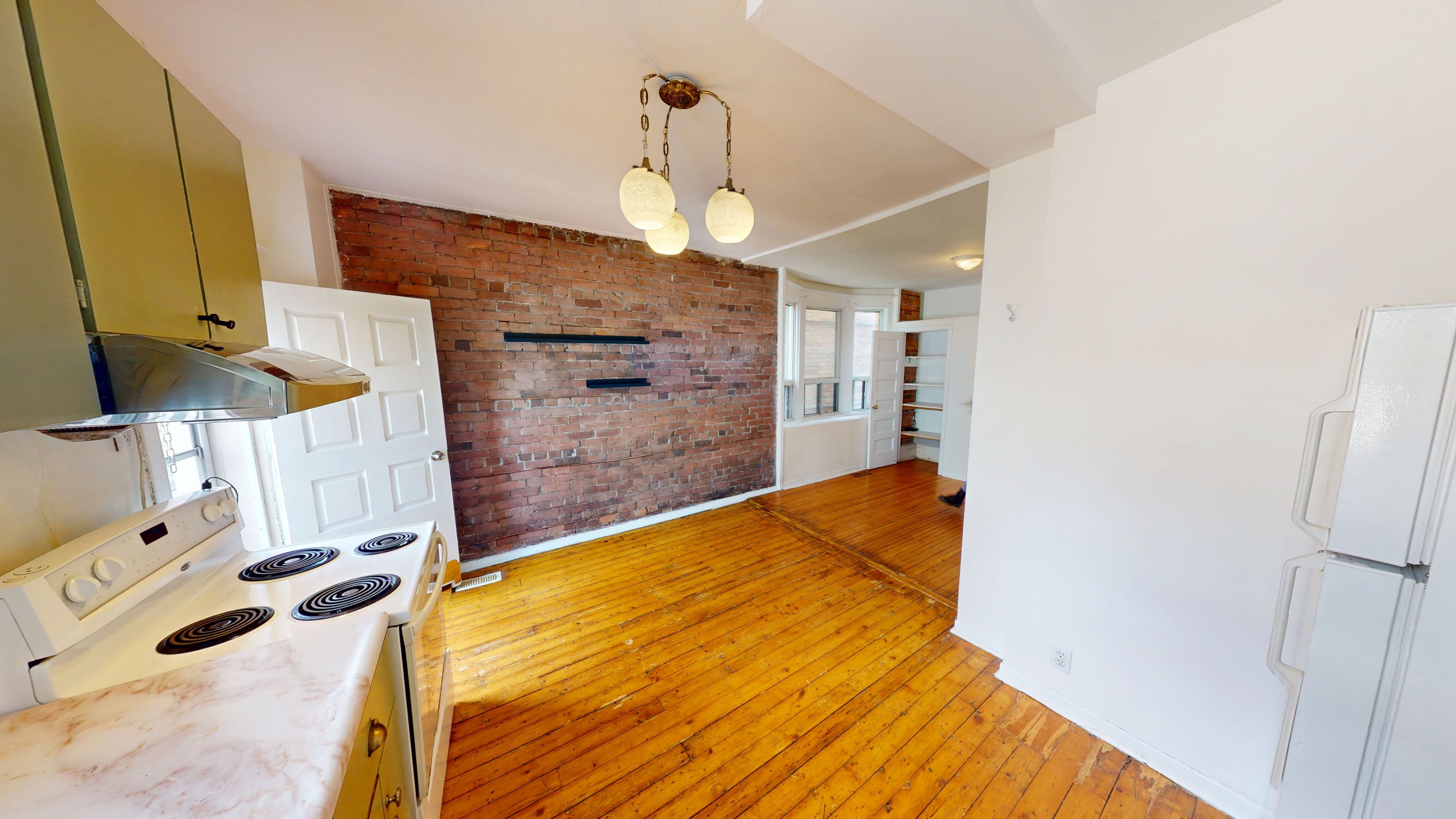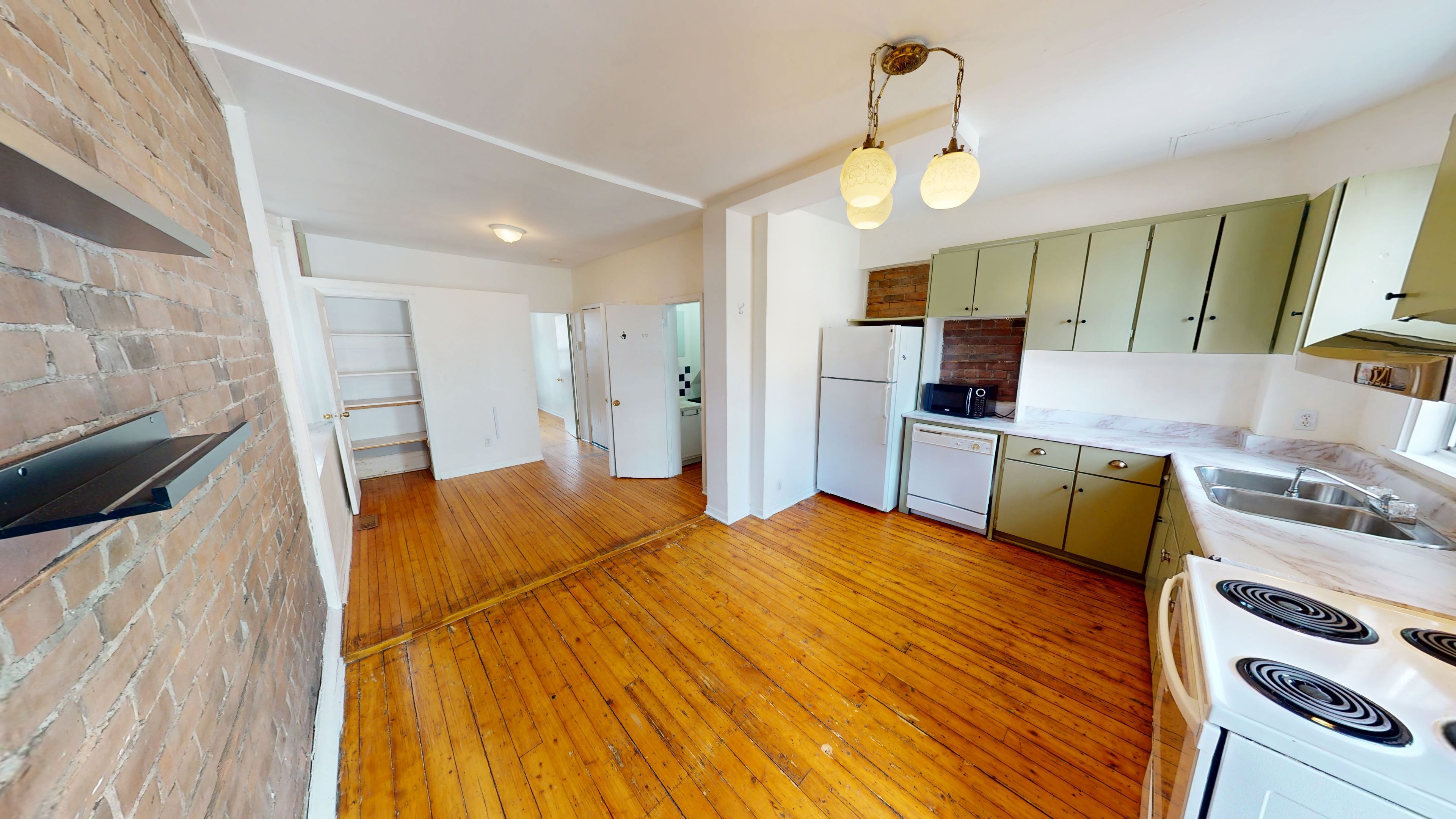 • Charming exposed brick and pine flooring throughout.