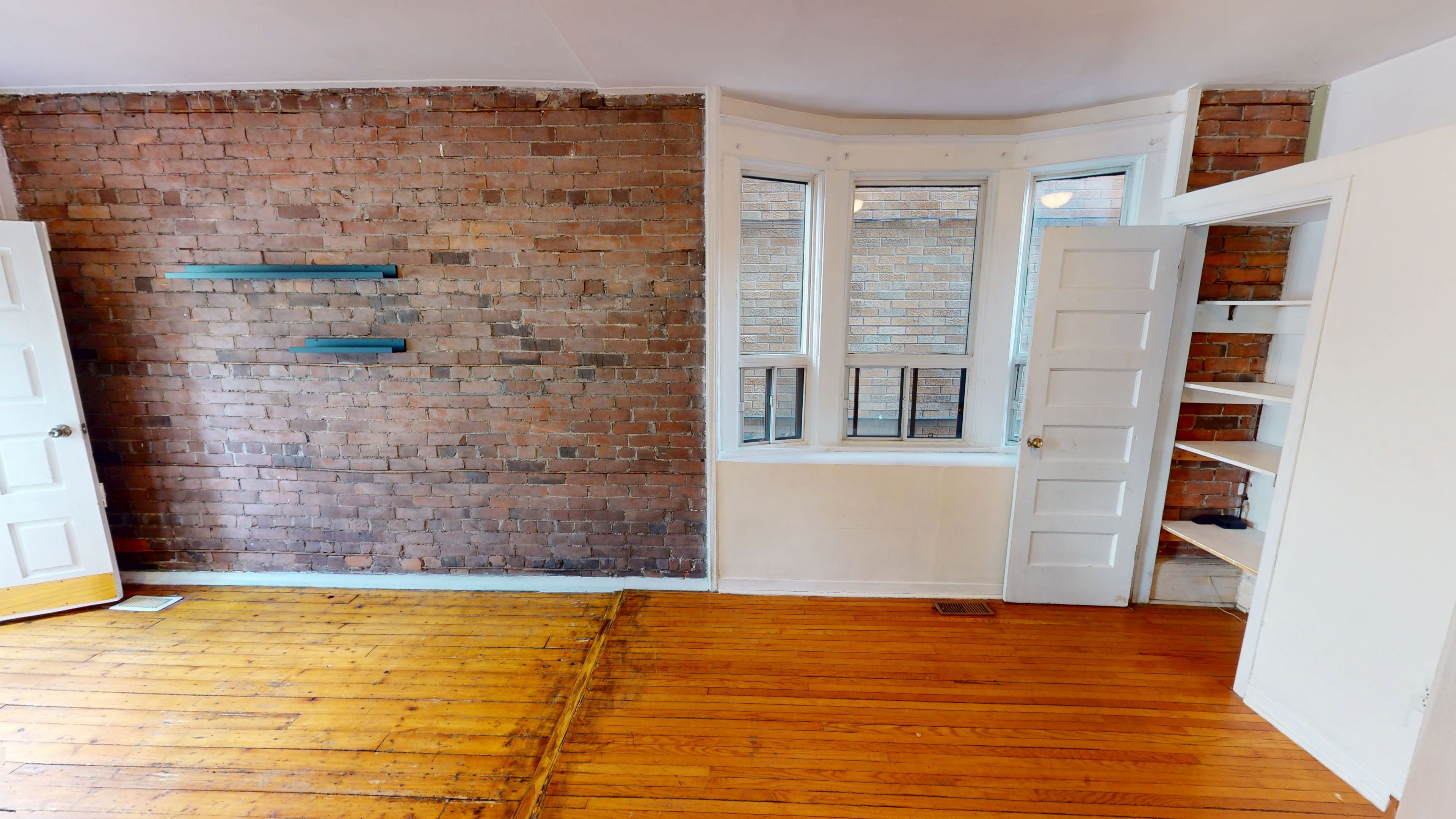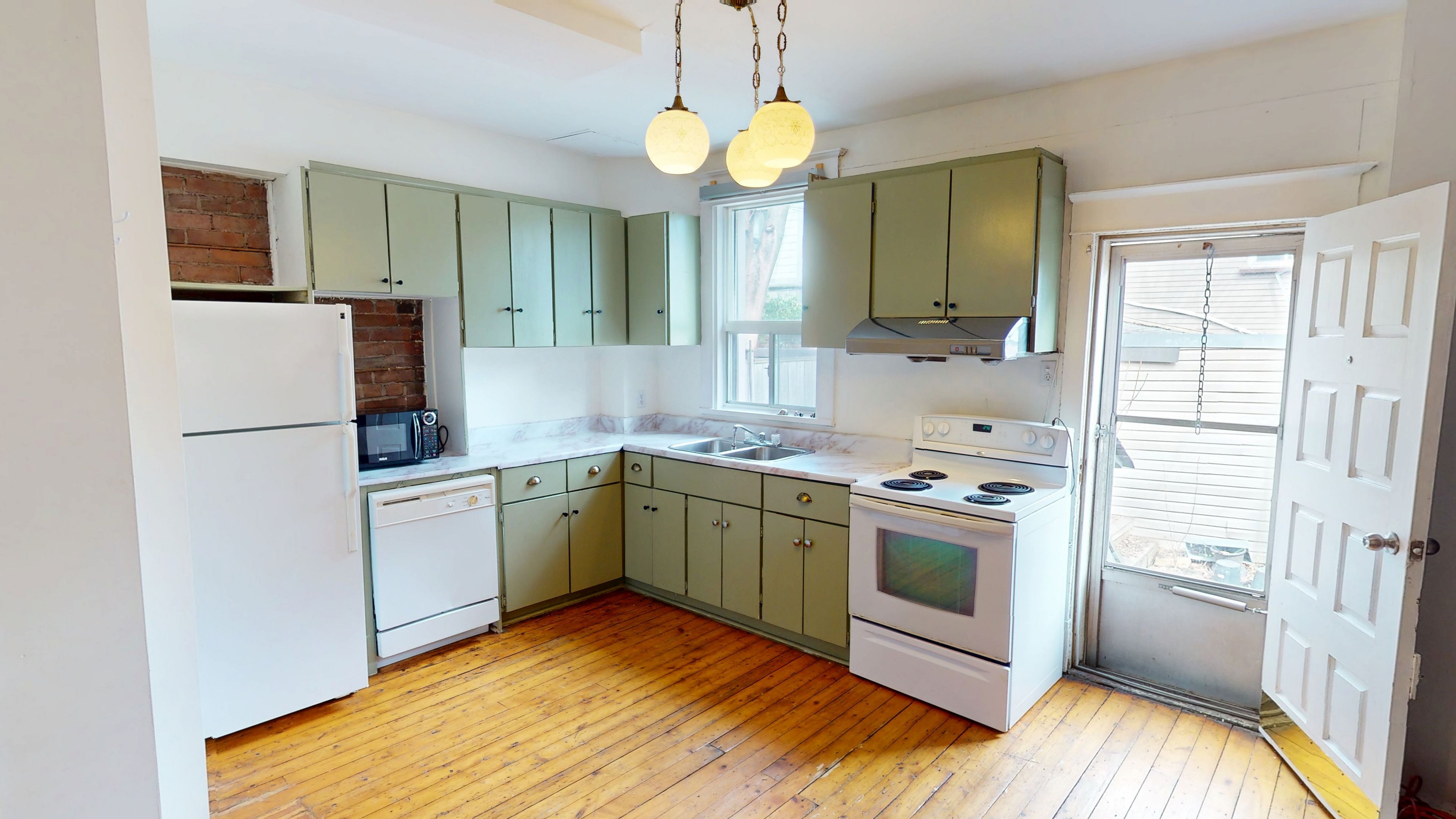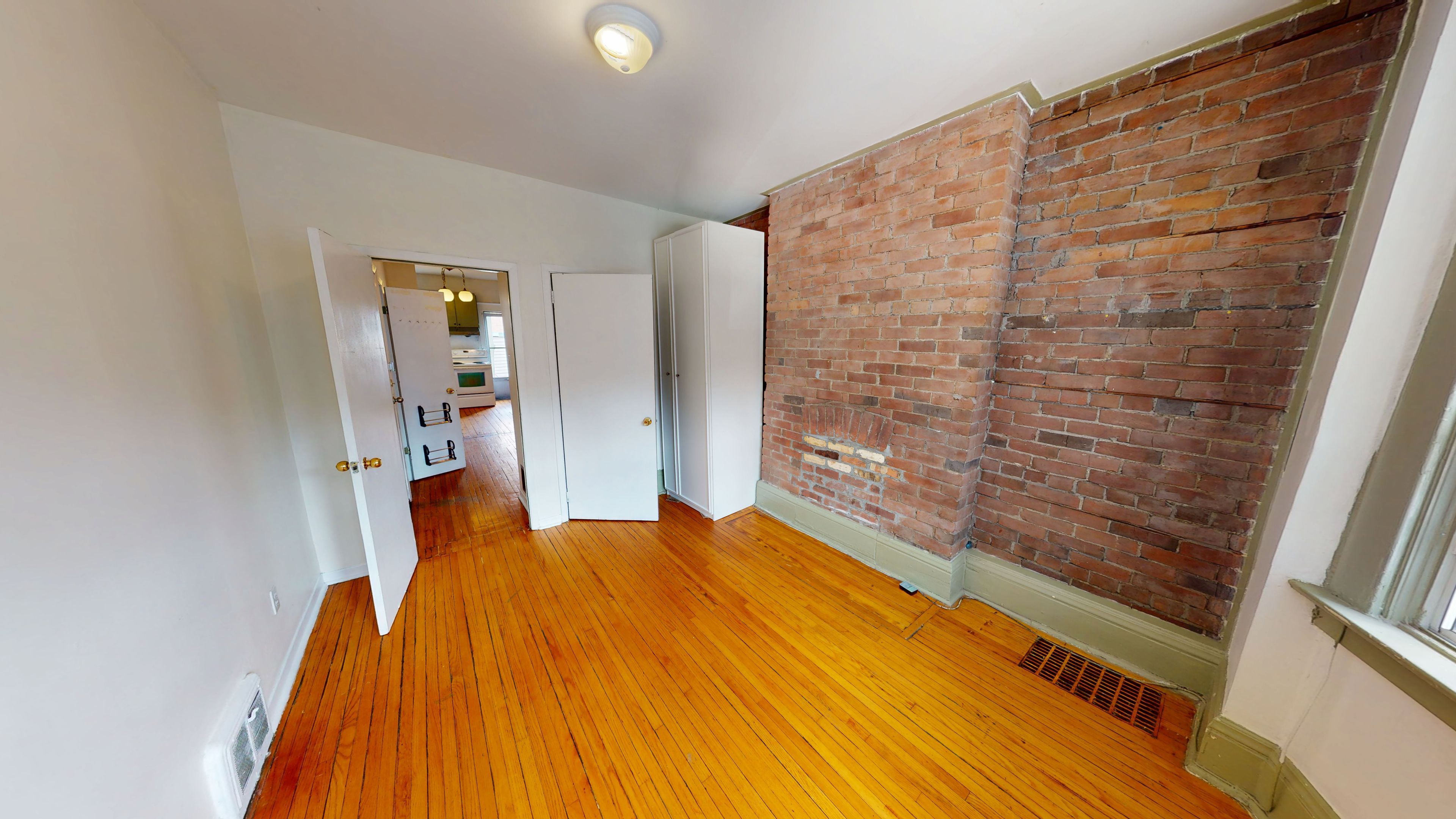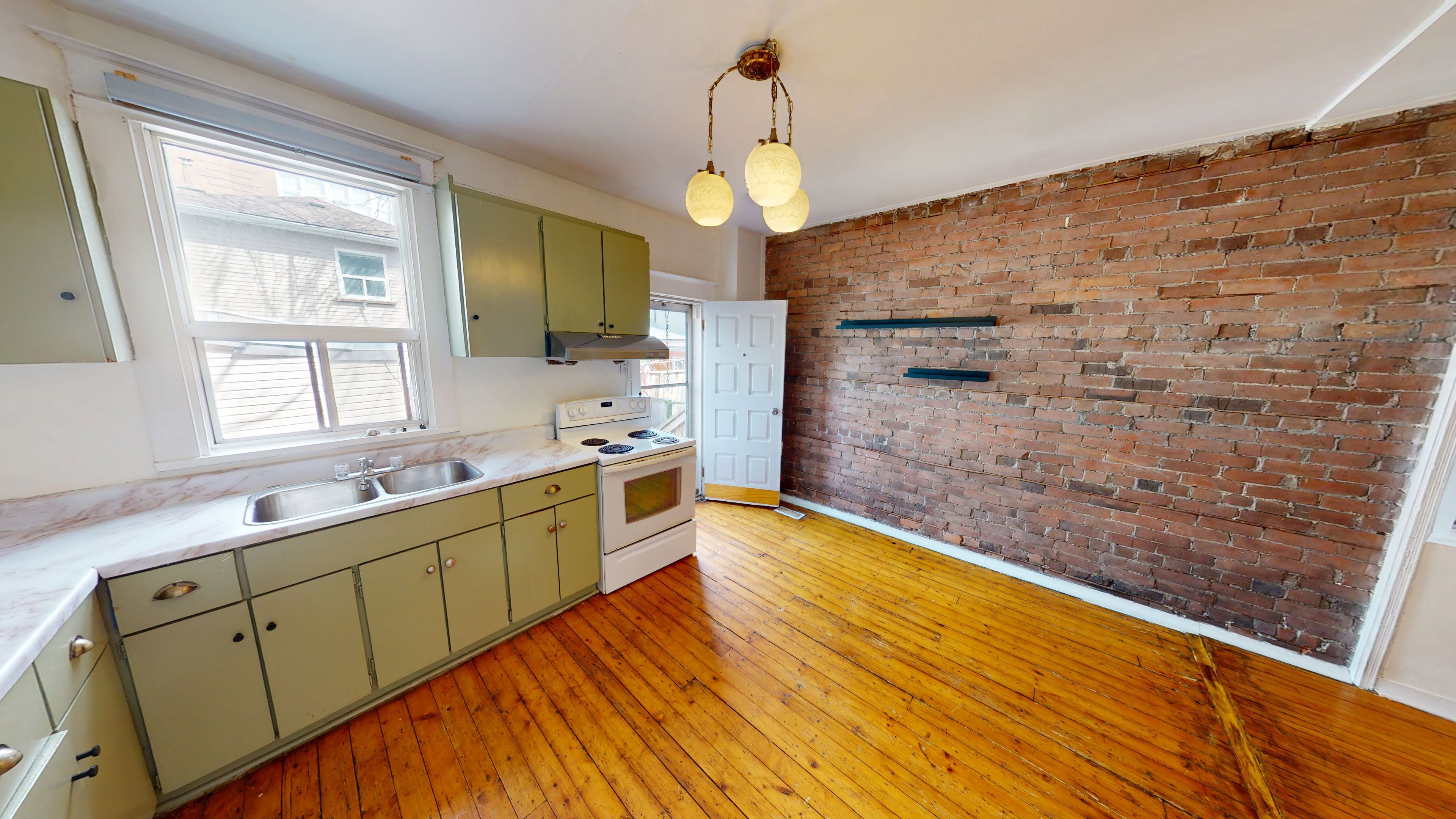 • Charming exposed brick and pine flooring throughout.