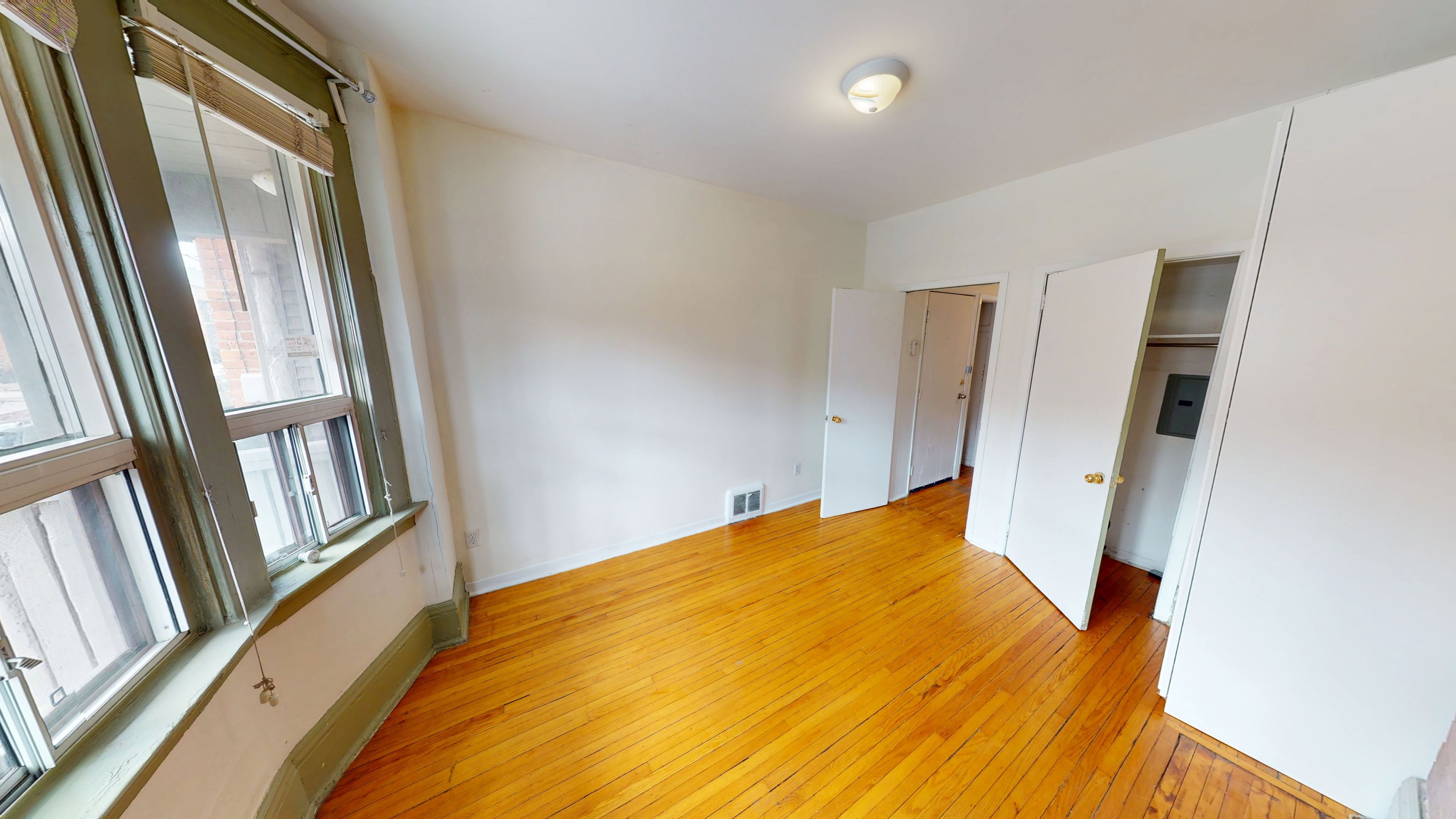 • Living room features bay windows and natural light.
