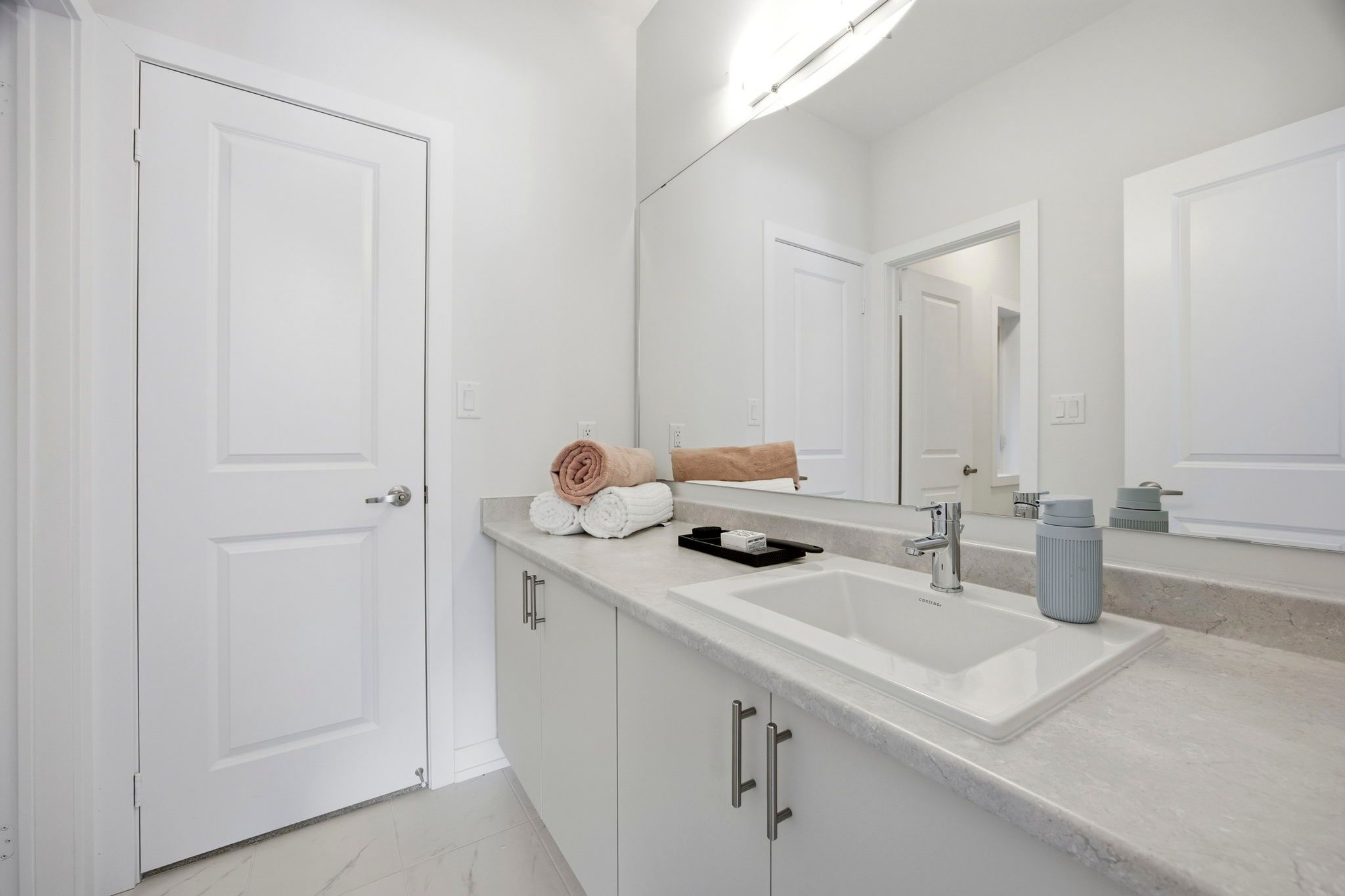 • High-end kitchen features quartz countertops, built-in appliances, and a large island.