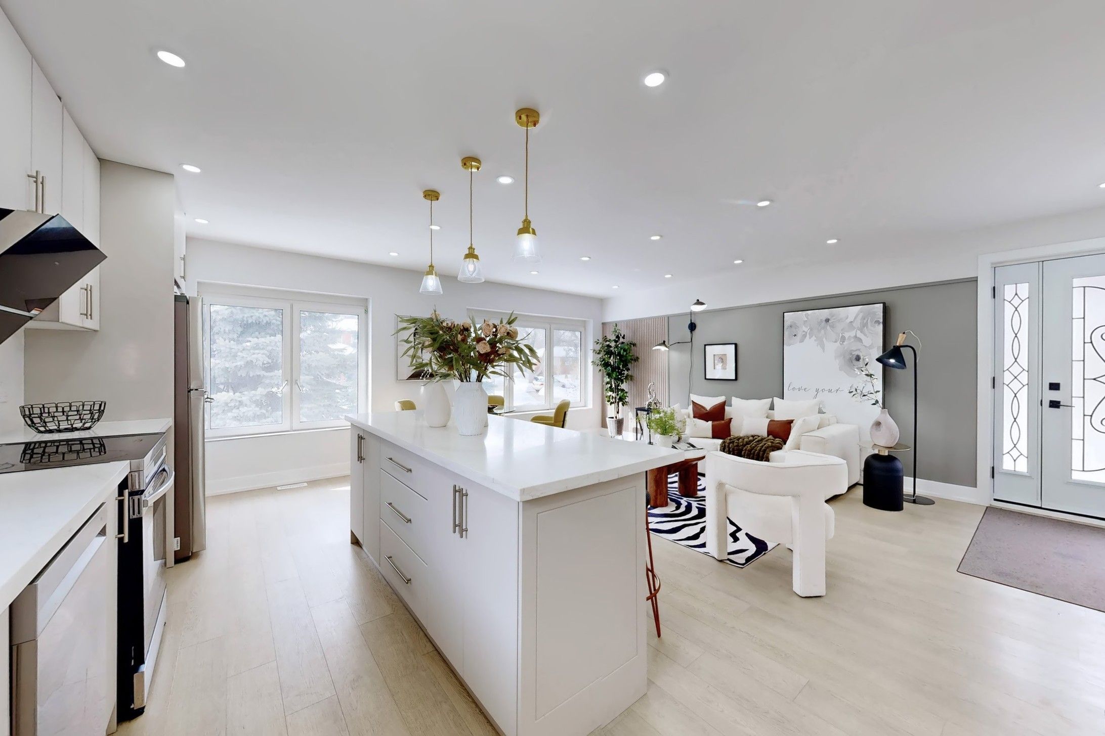 • Bright and open living areas with hardwood flooring and model mouldings.