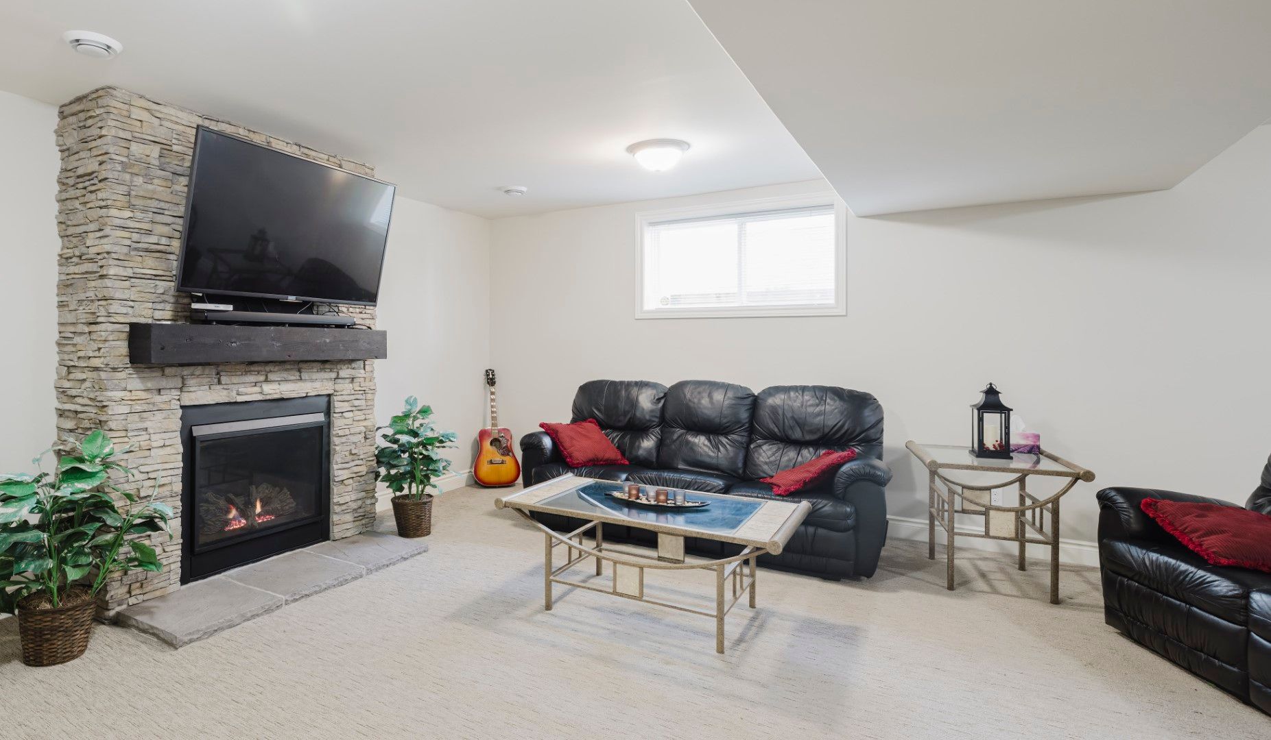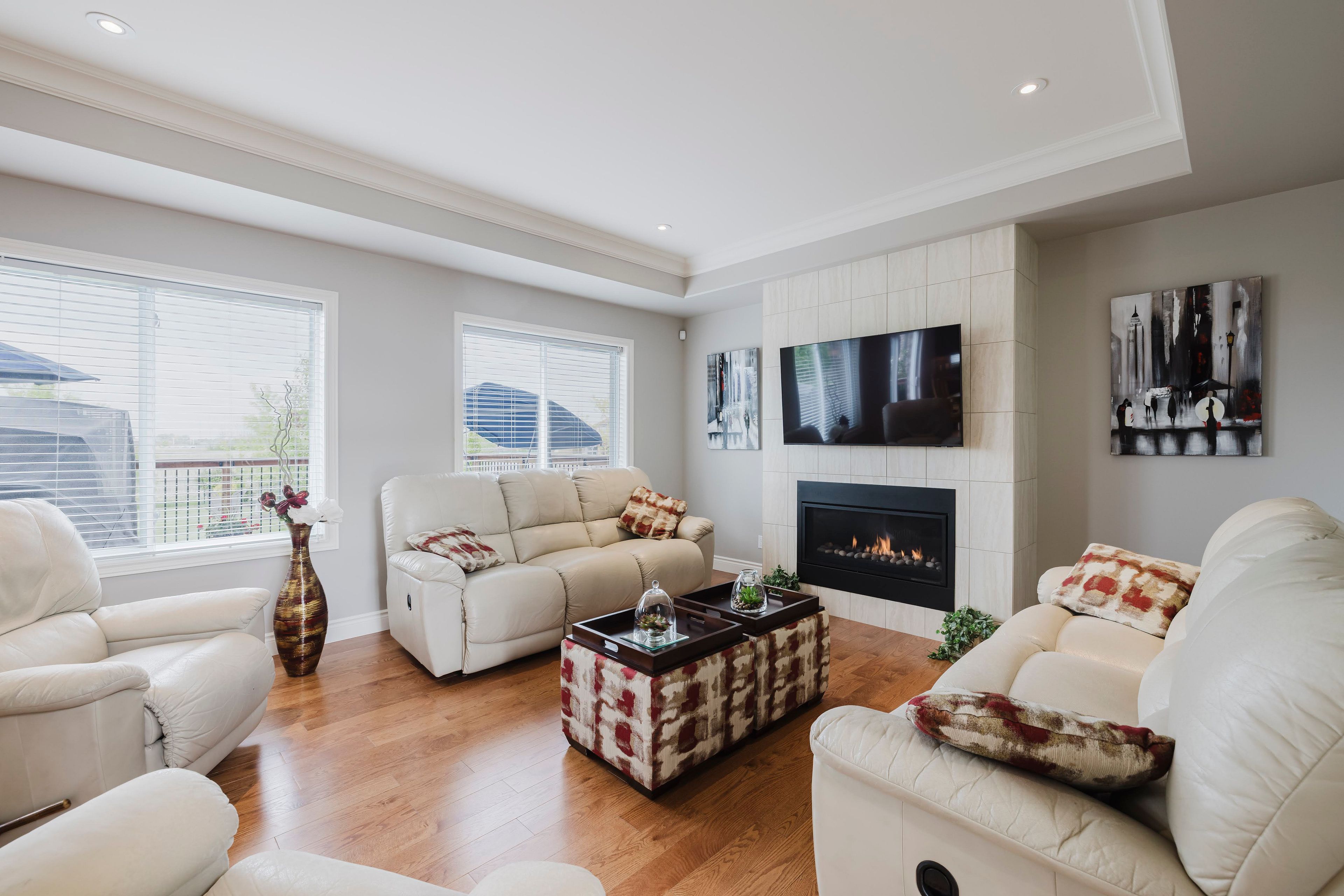 • Open concept living area with gas fireplace and lovely garden views.