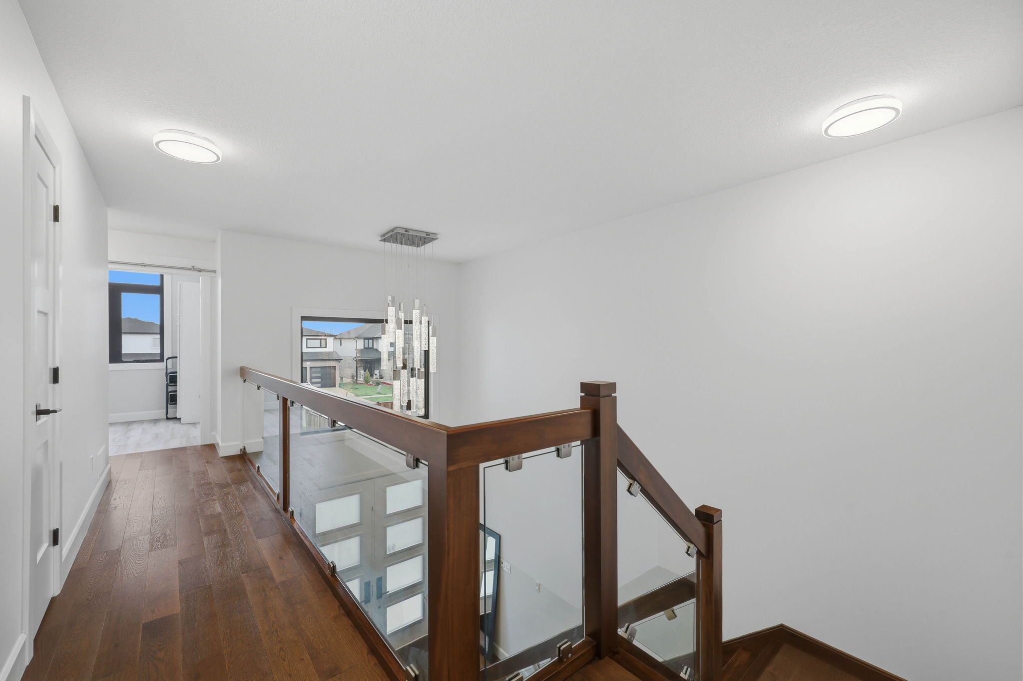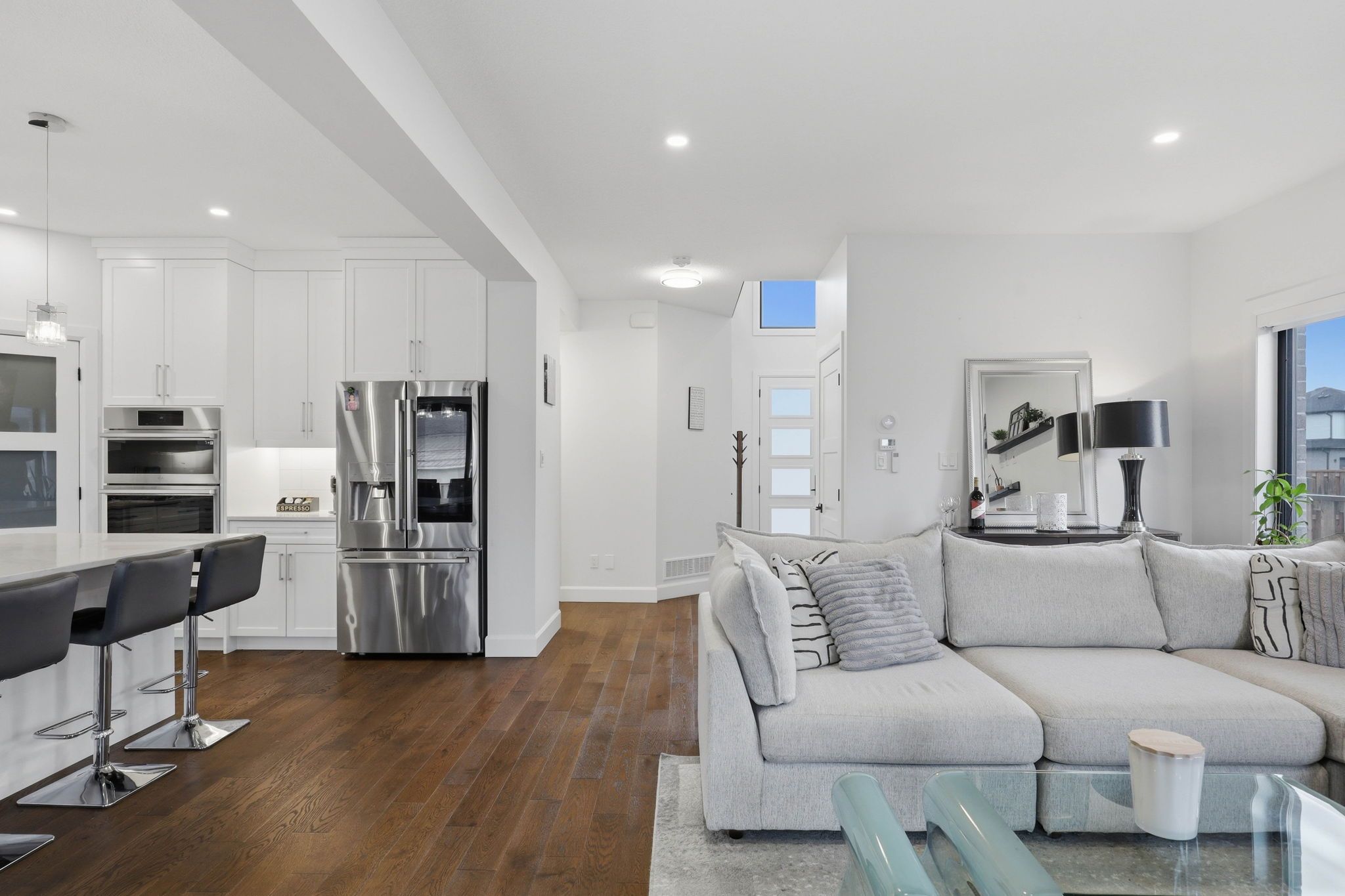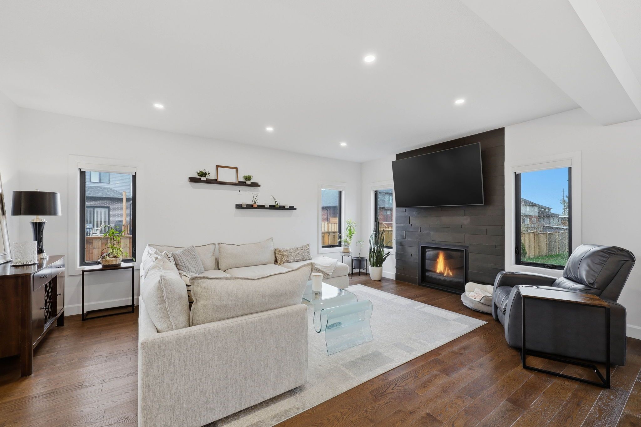 • Bright open concept main floor with large windows and a cozy fireplace.