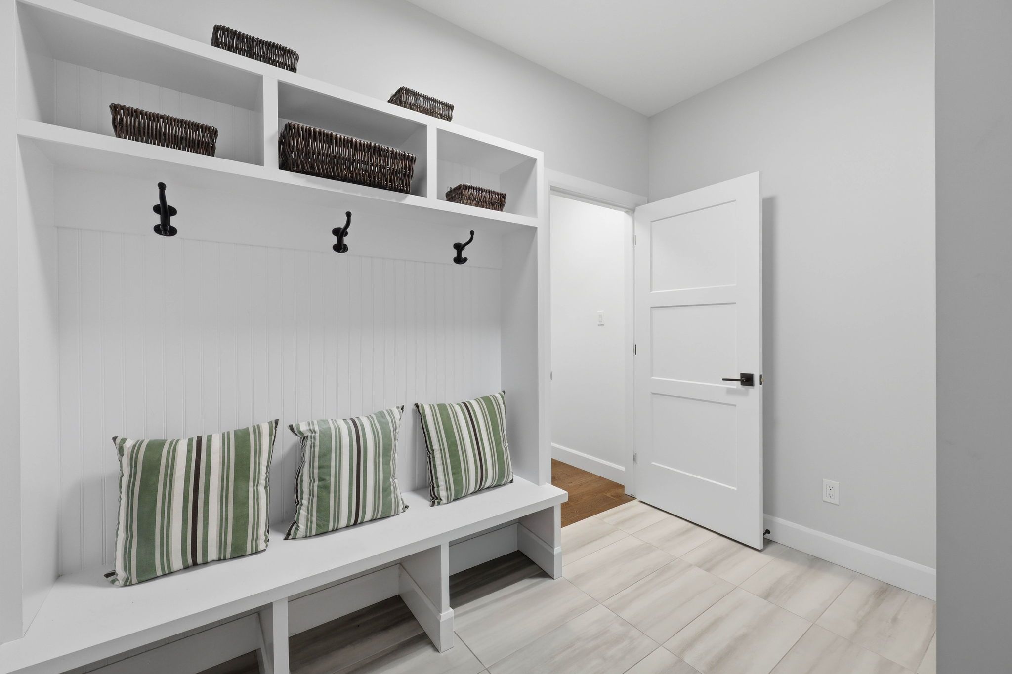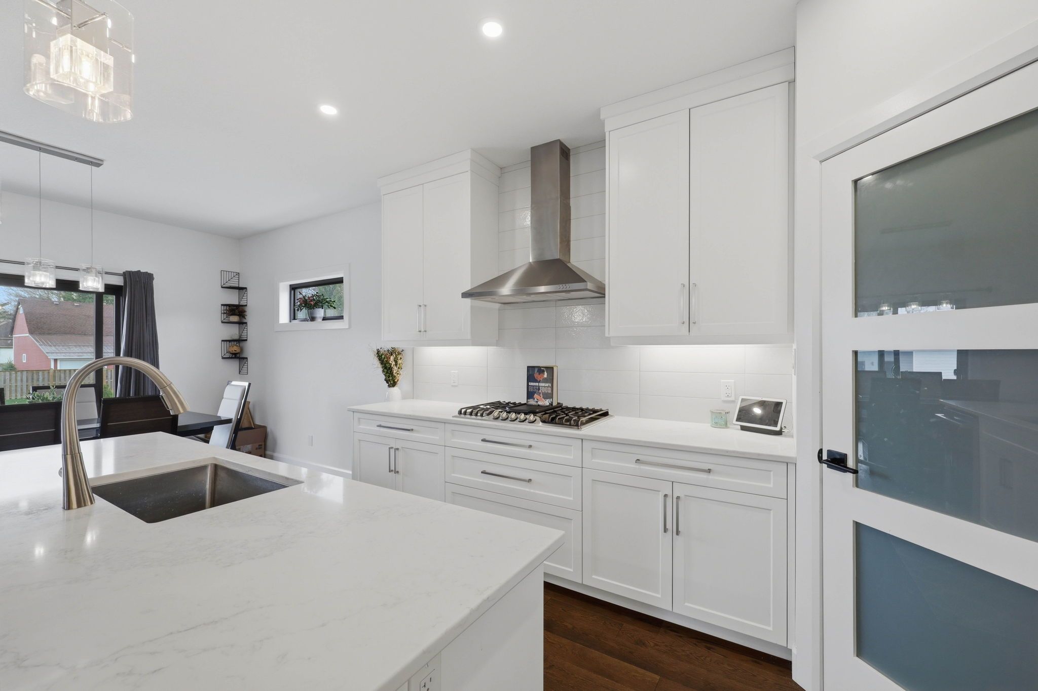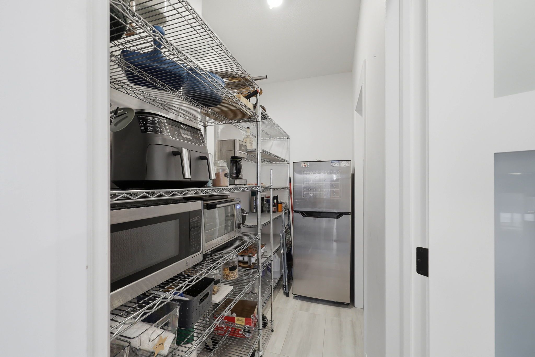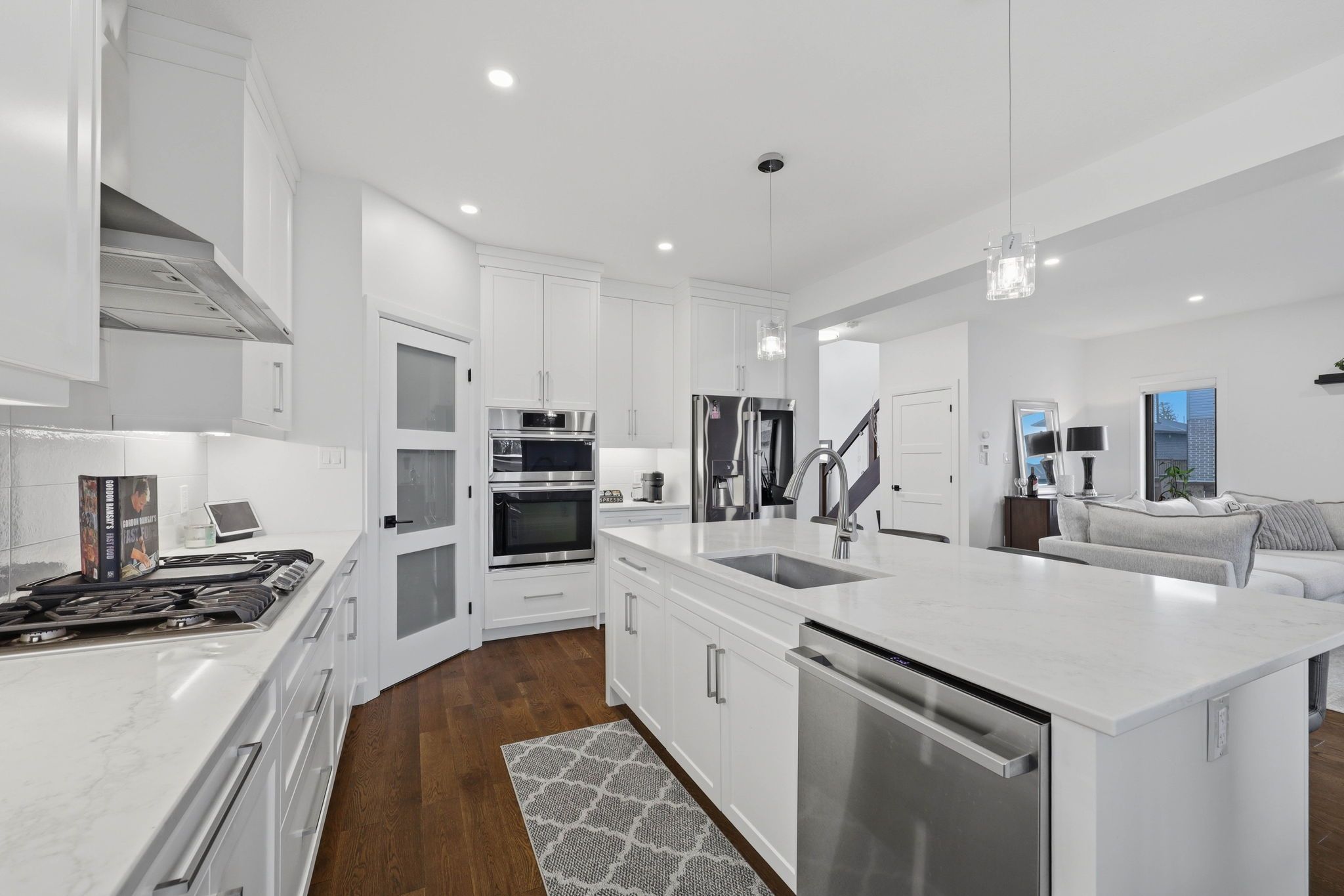 • Impressive kitchen features quartz countertops, a large island, and pantry access.