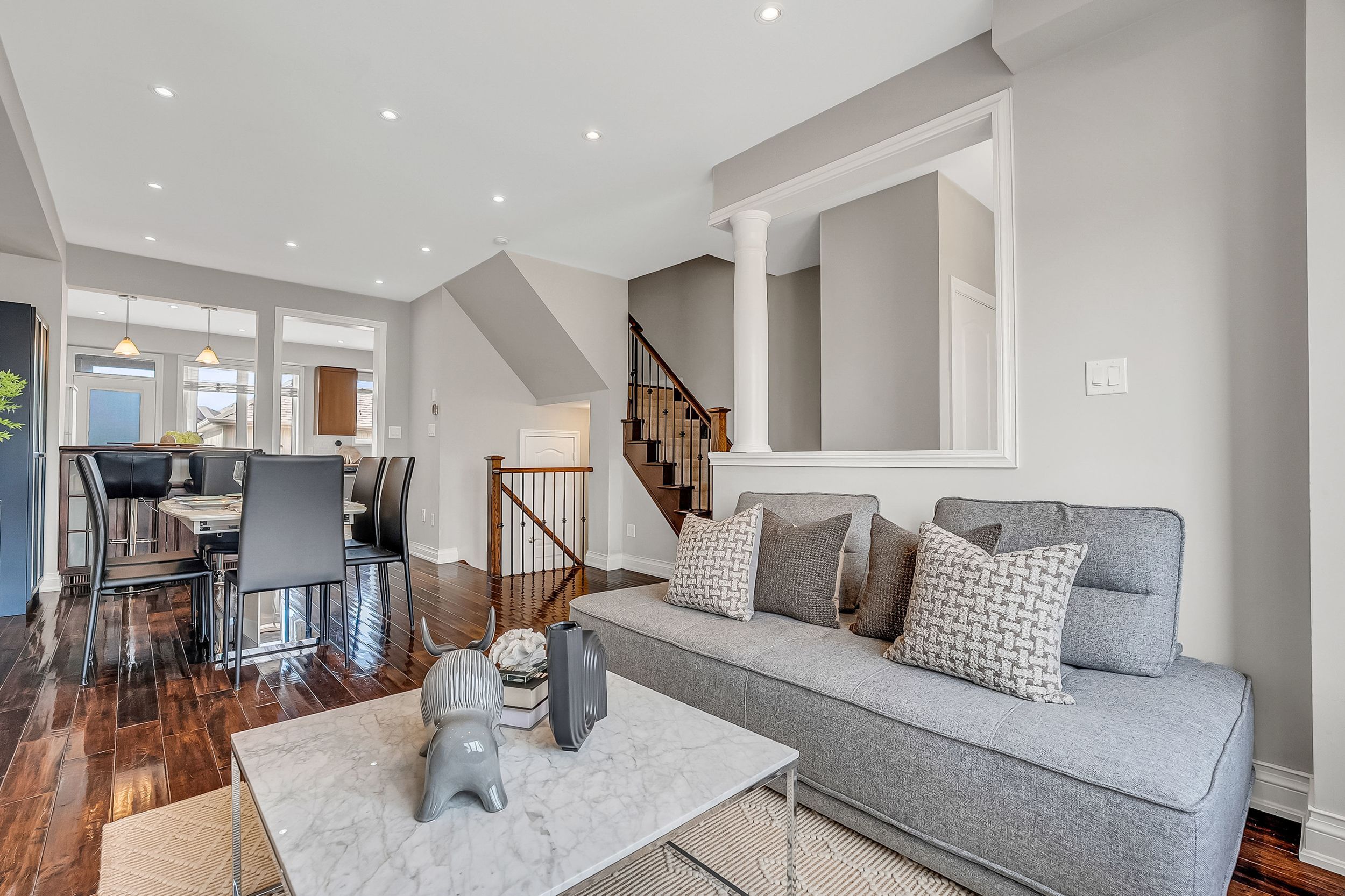 Iscover your dream home at 53 michelina this sun-filled, brick townhome offers the perfect blend of modern comfort and family-friendly living. Step inside to an inviting open-concept living and dining area highlighted by a cozy gas fireplace, rich maple hardwood floors, and soaring 9-foot ceilings on the main level. The upgraded kitchen boasts extended-height cabinetry and a spacious breakfast area-ideal for casual mornings or entertaining. Upstairs, three generously sized bedrooms feature upgraded flooring, accompanied by two full bathrooms. A finished basement provides a versatile rec room, laundry, and ample storage. Additional highlights include stainless steel appliances, central air(2023), central vacuum, well-maintained home . Best of all, it sits directly opposite a beautiful park in the award-winning grand cornell neighborhood-a vibrant, walkable new urbanist community with trails, nearby transit, shopping, excellent schools, and quick access to hwy 407 and rouge national park. Whether you're a first-time buyer, growing family, or investor, this move-in-ready gem promises an exceptional lifestyle in one of markham's most desirable pockets. Don't miss out-schedule your viewing today! Roof 2021, garage roof 2023.