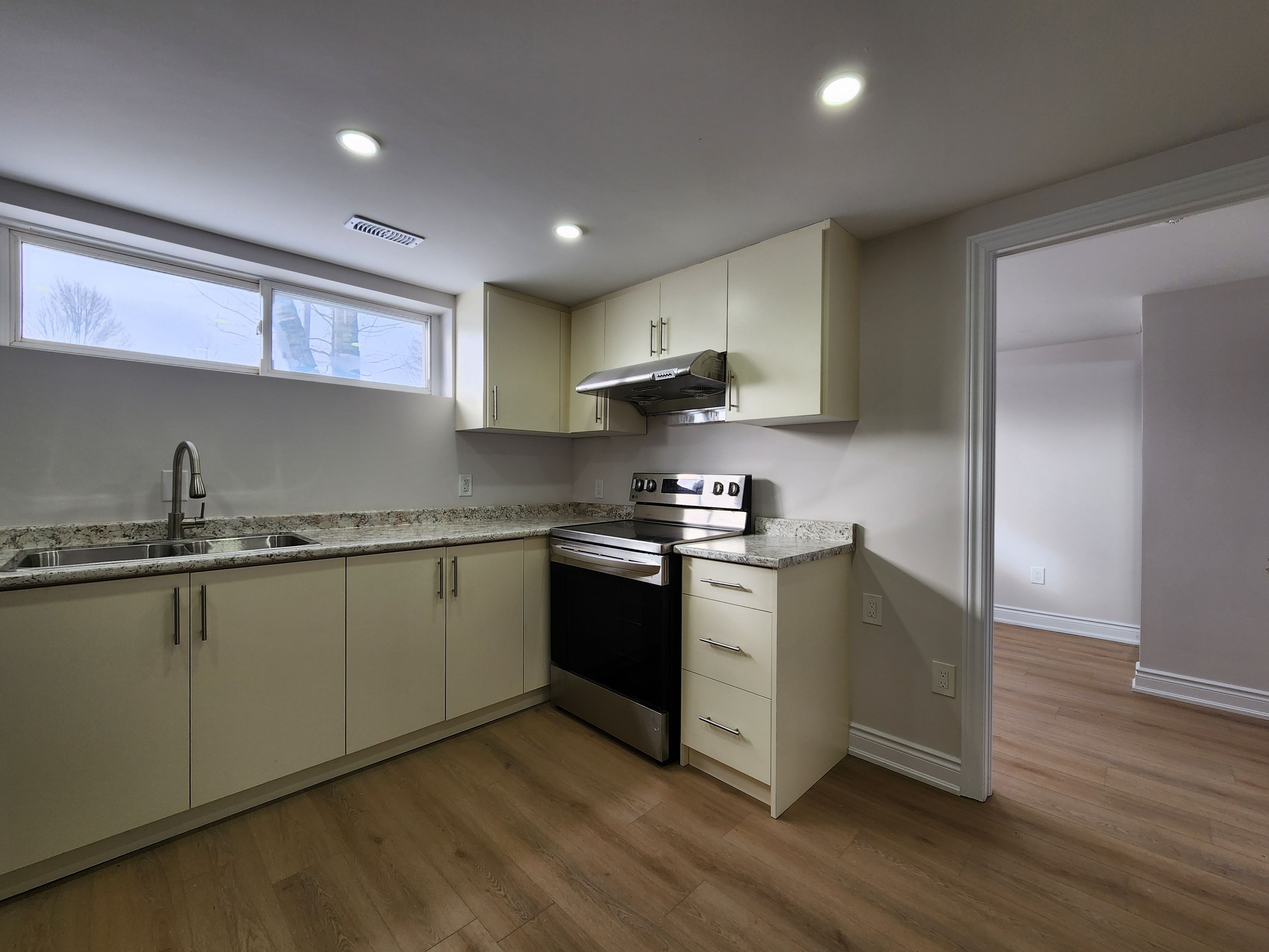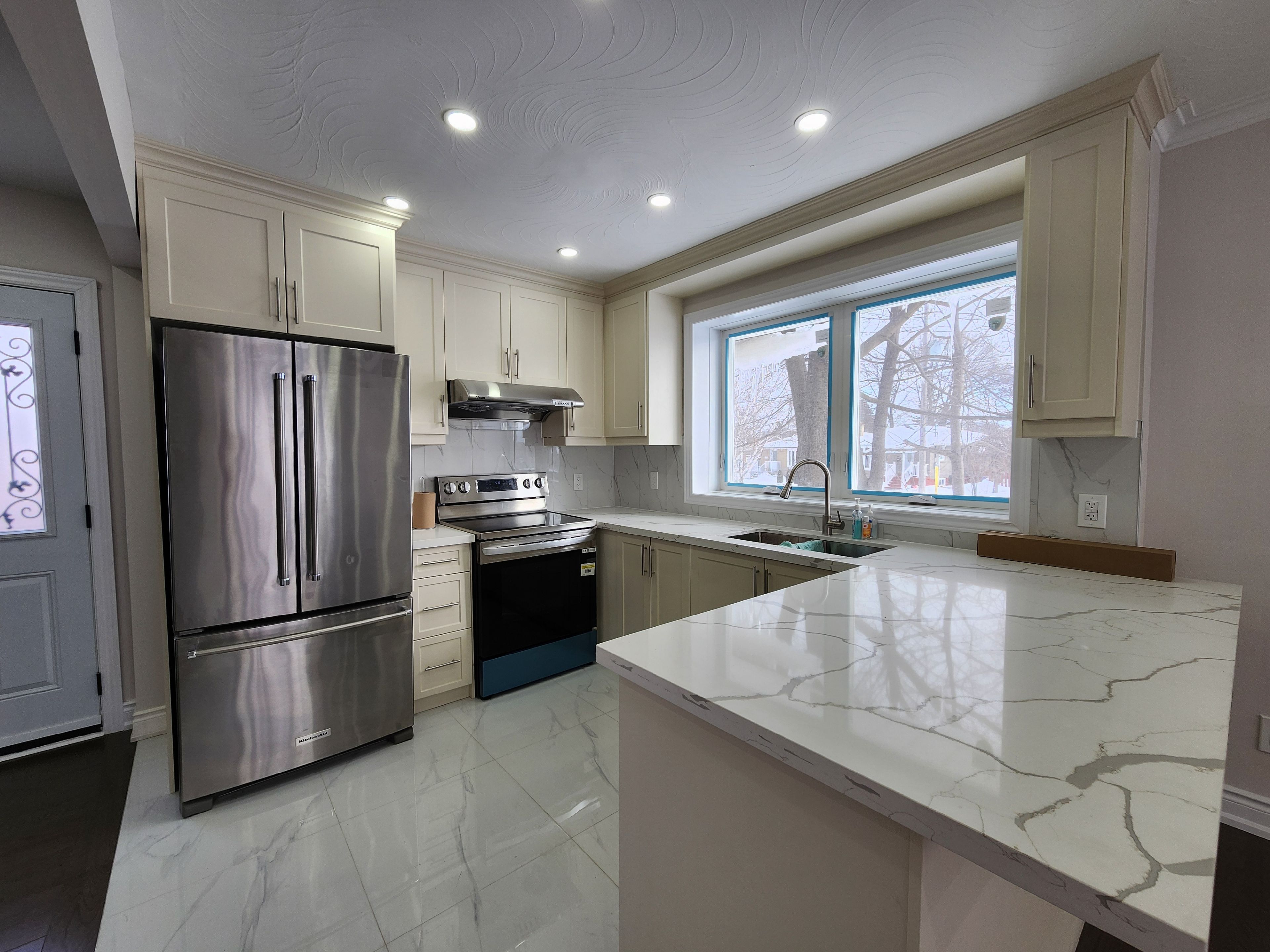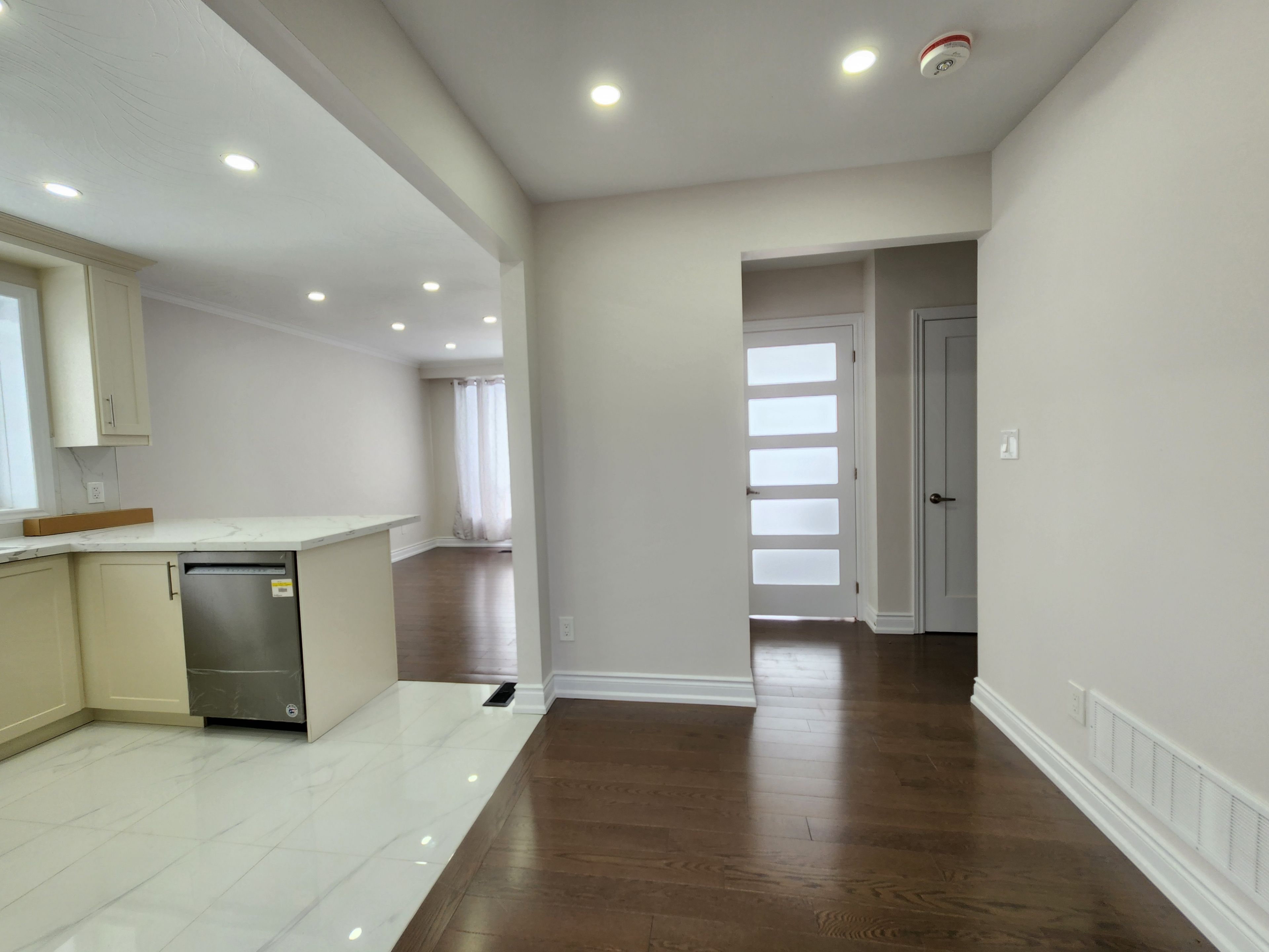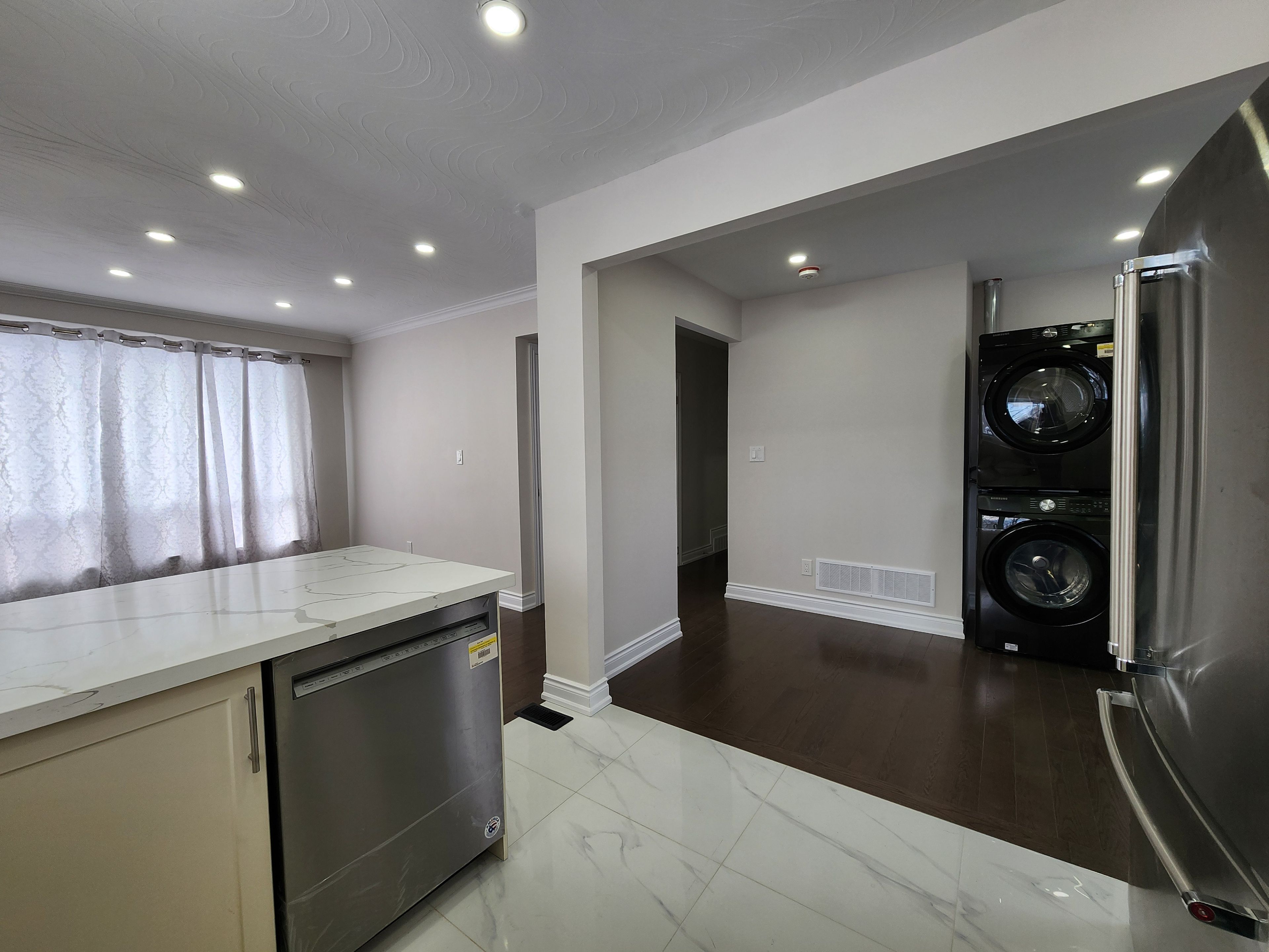 • Modern kitchen with quartz countertops and pot lights for functionality.