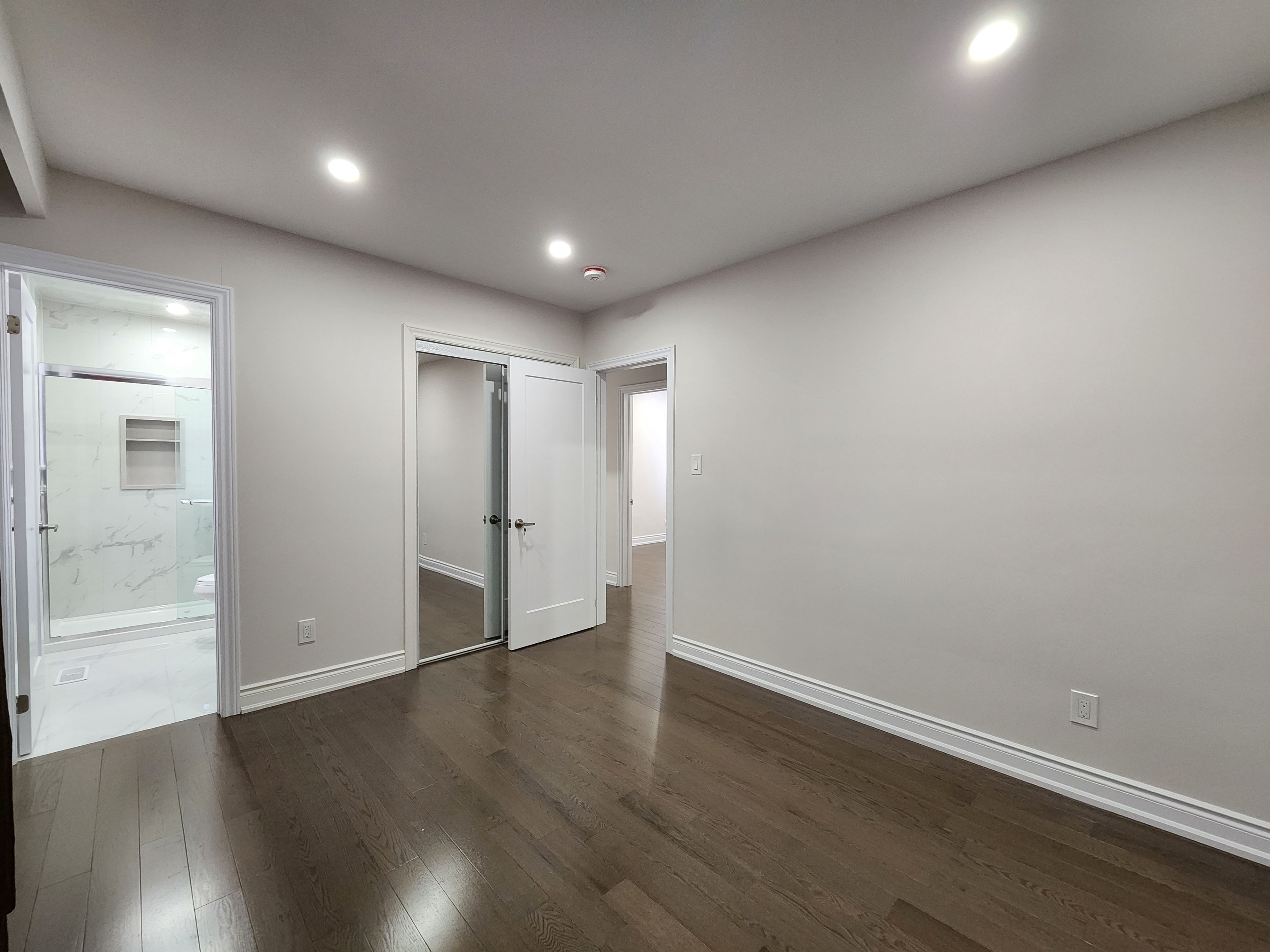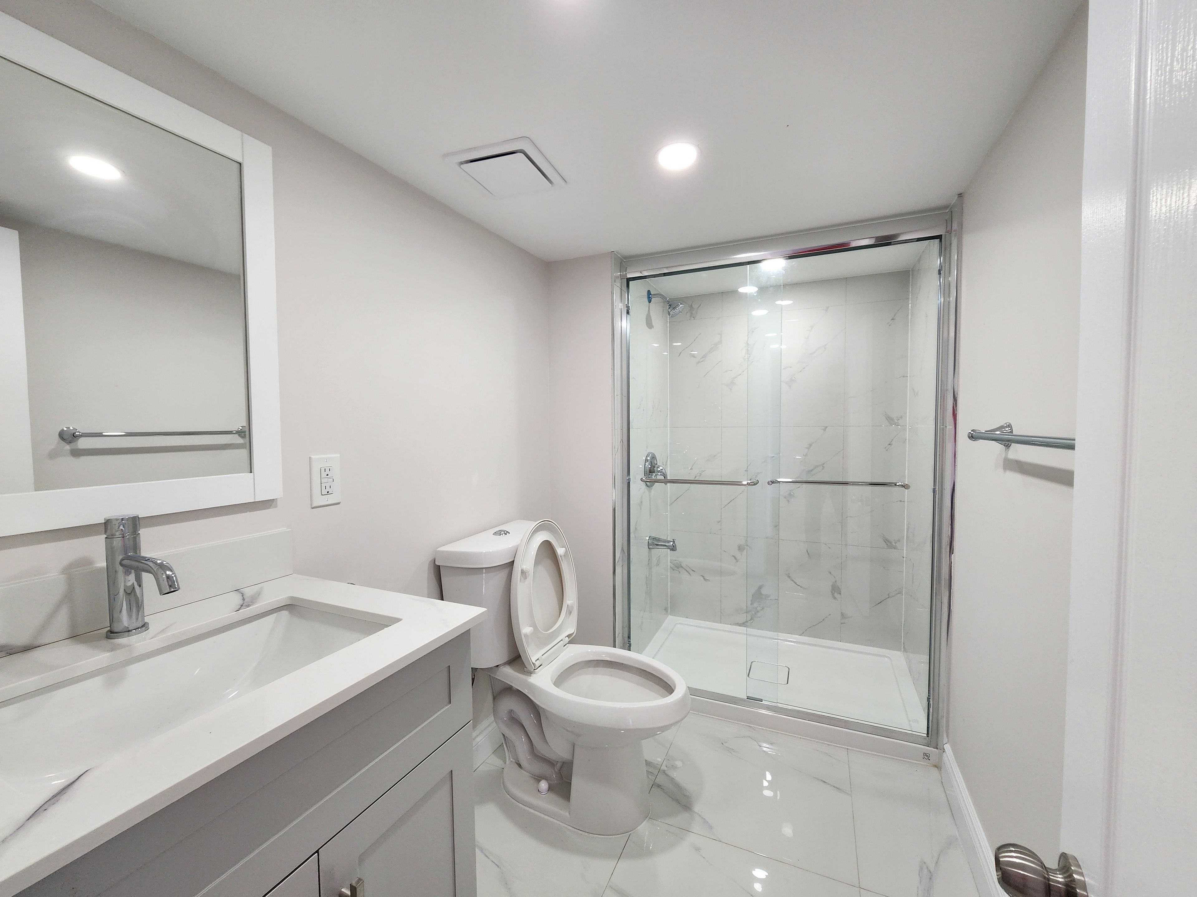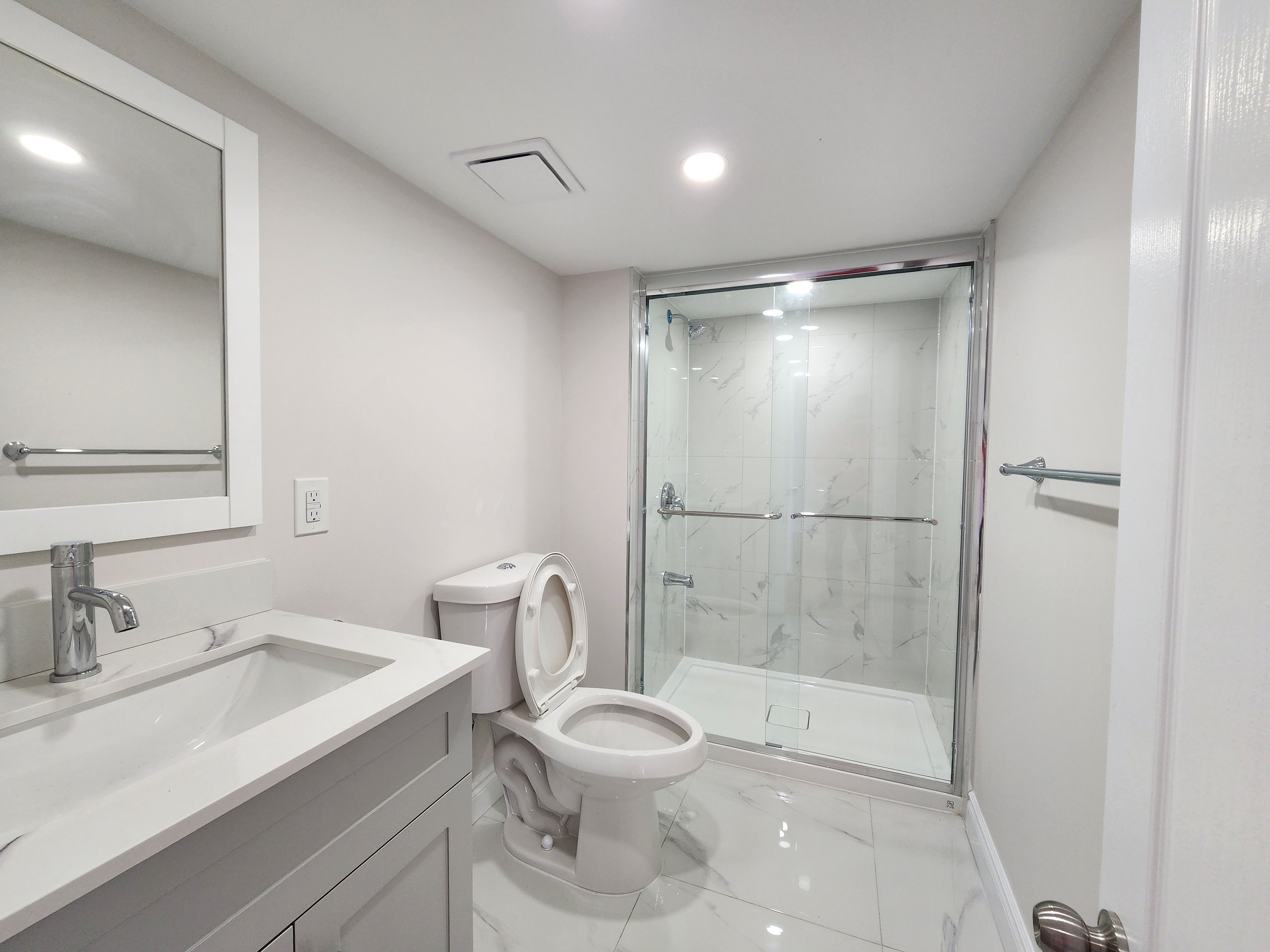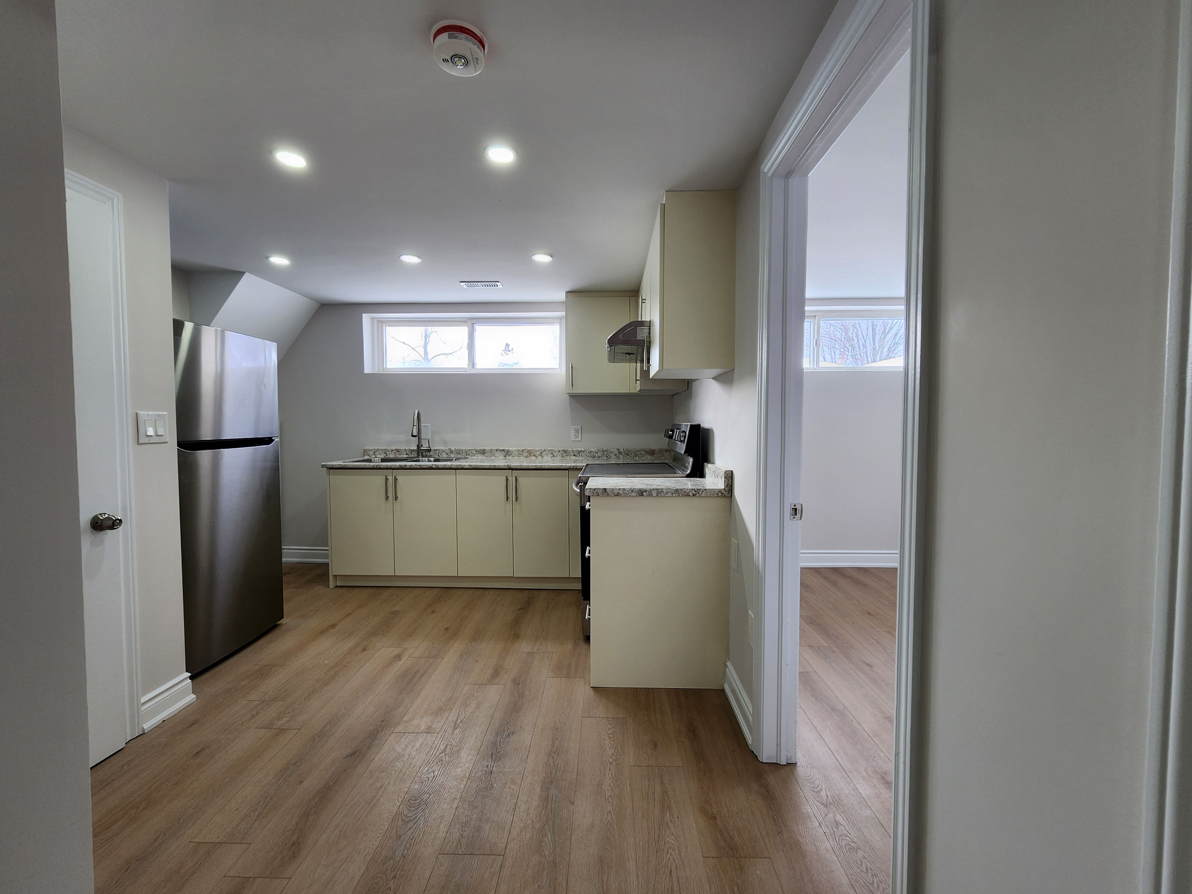 • Modern kitchen with quartz countertops and pot lights for functionality.