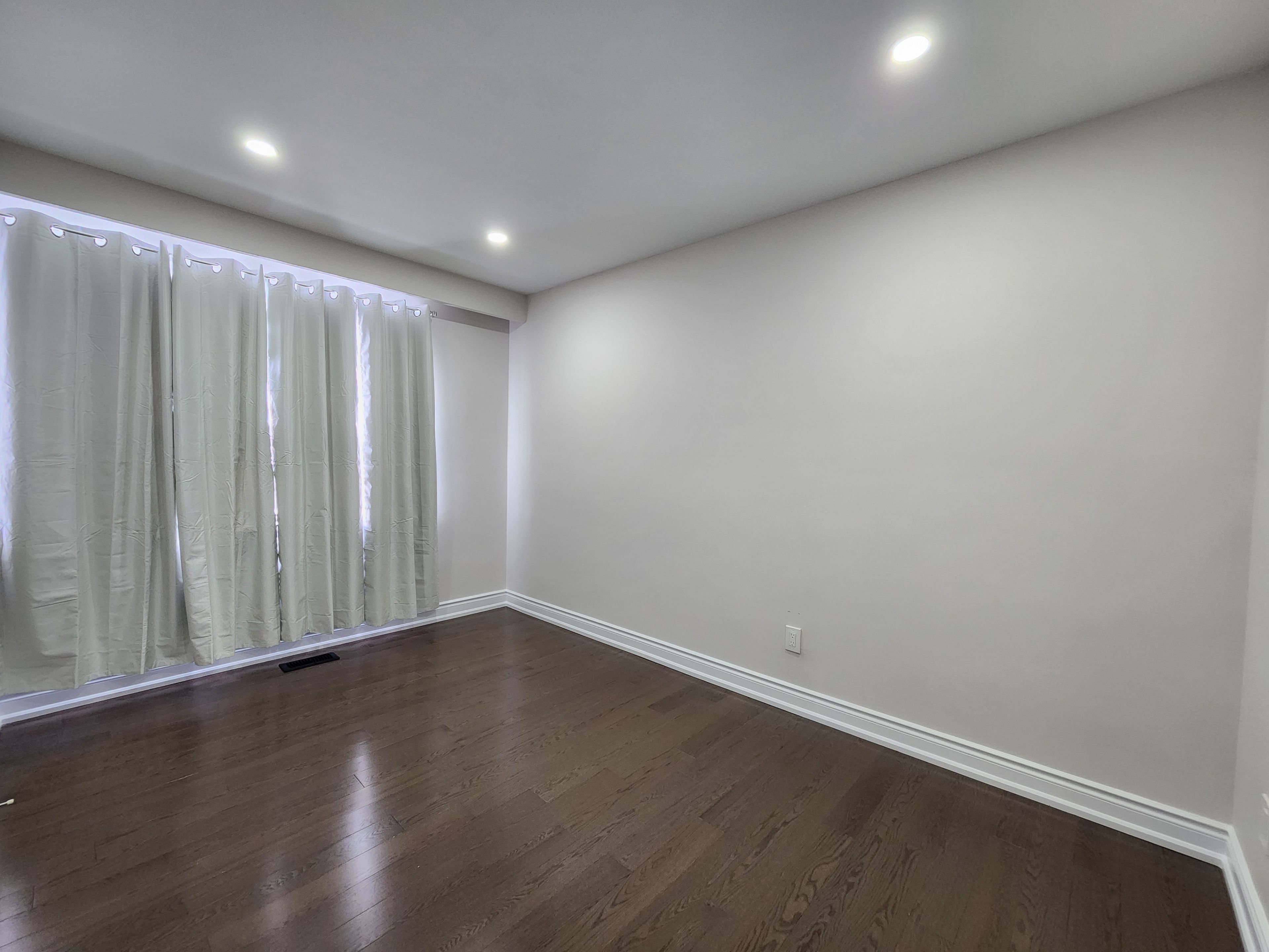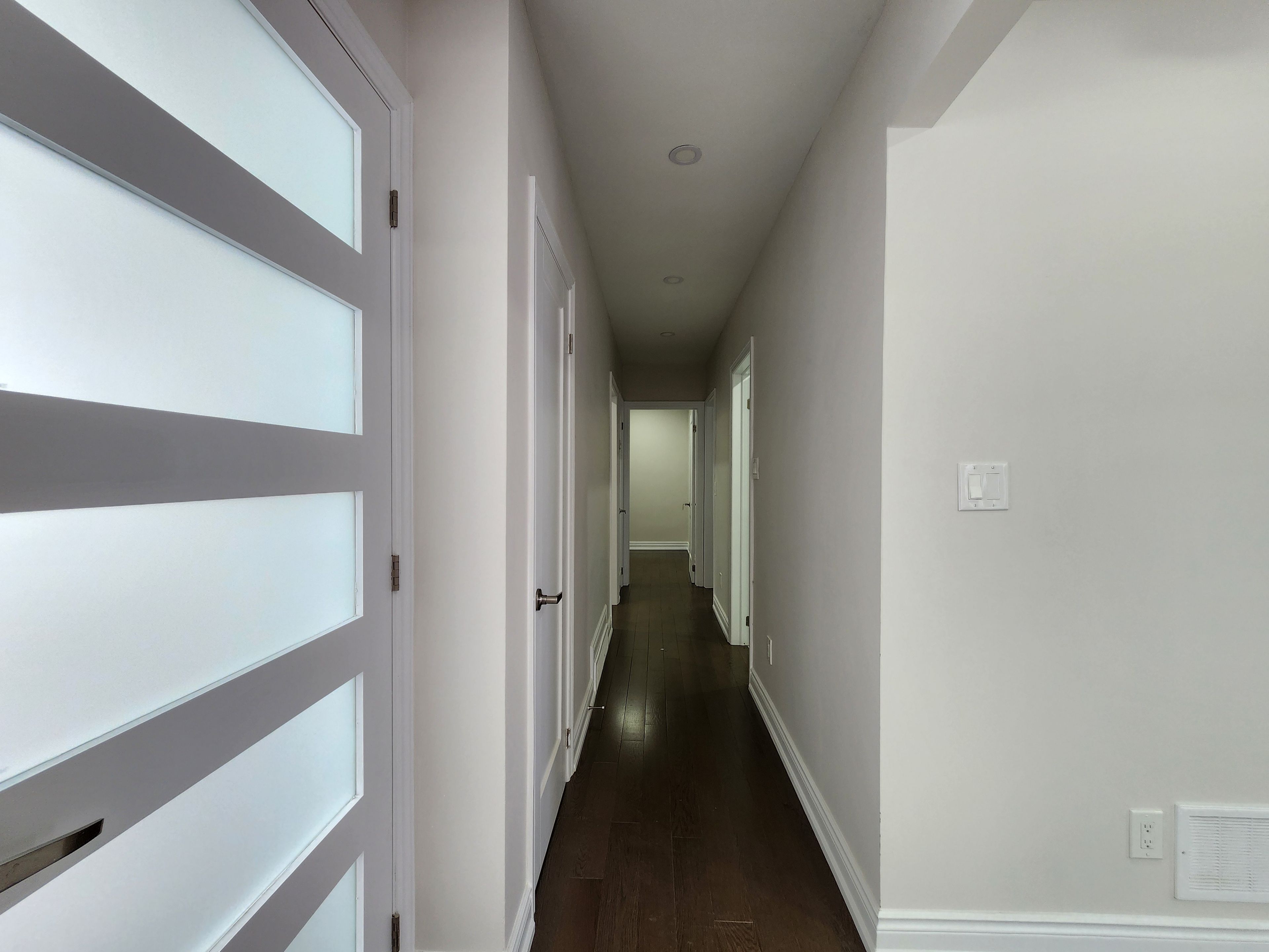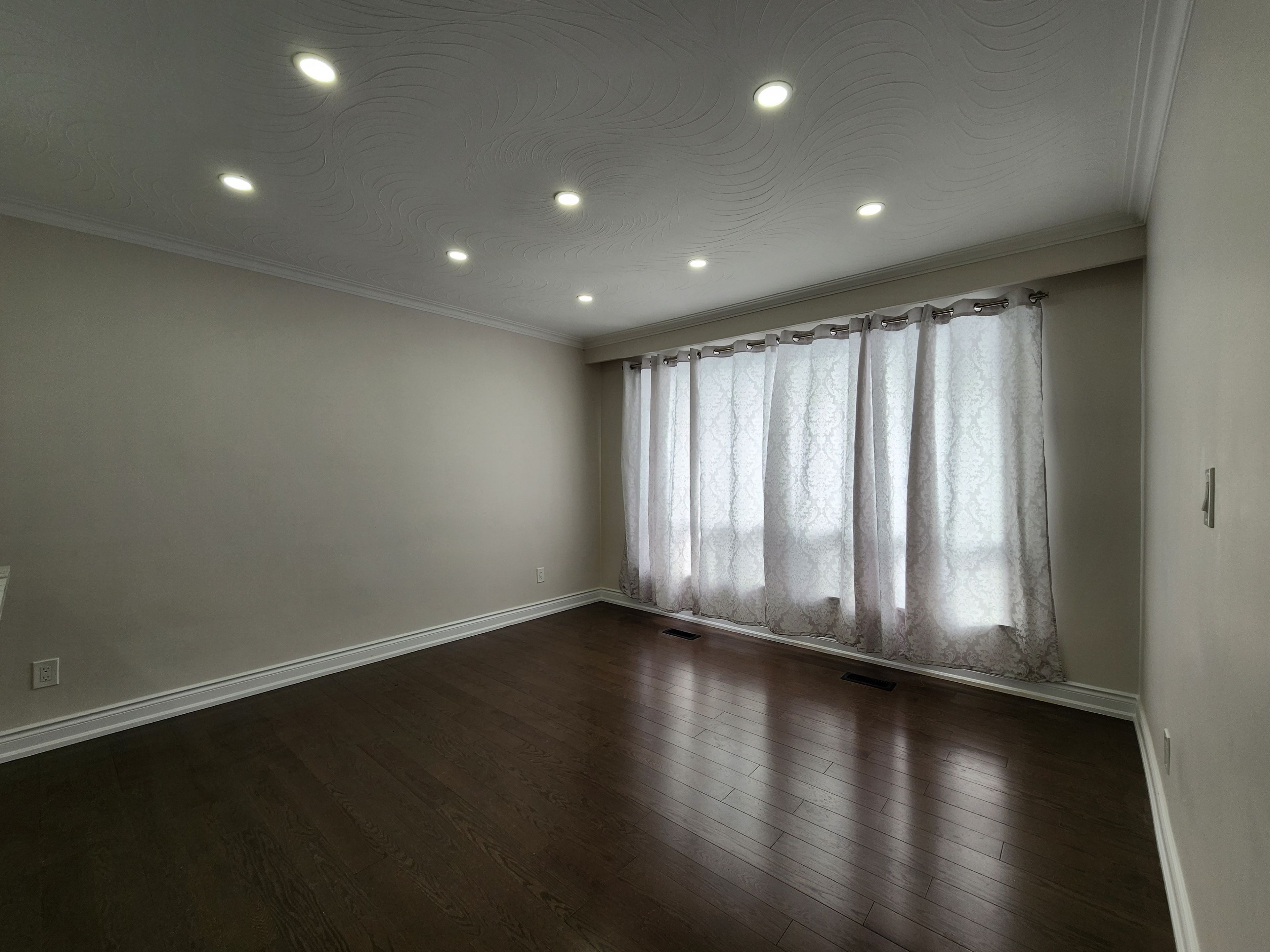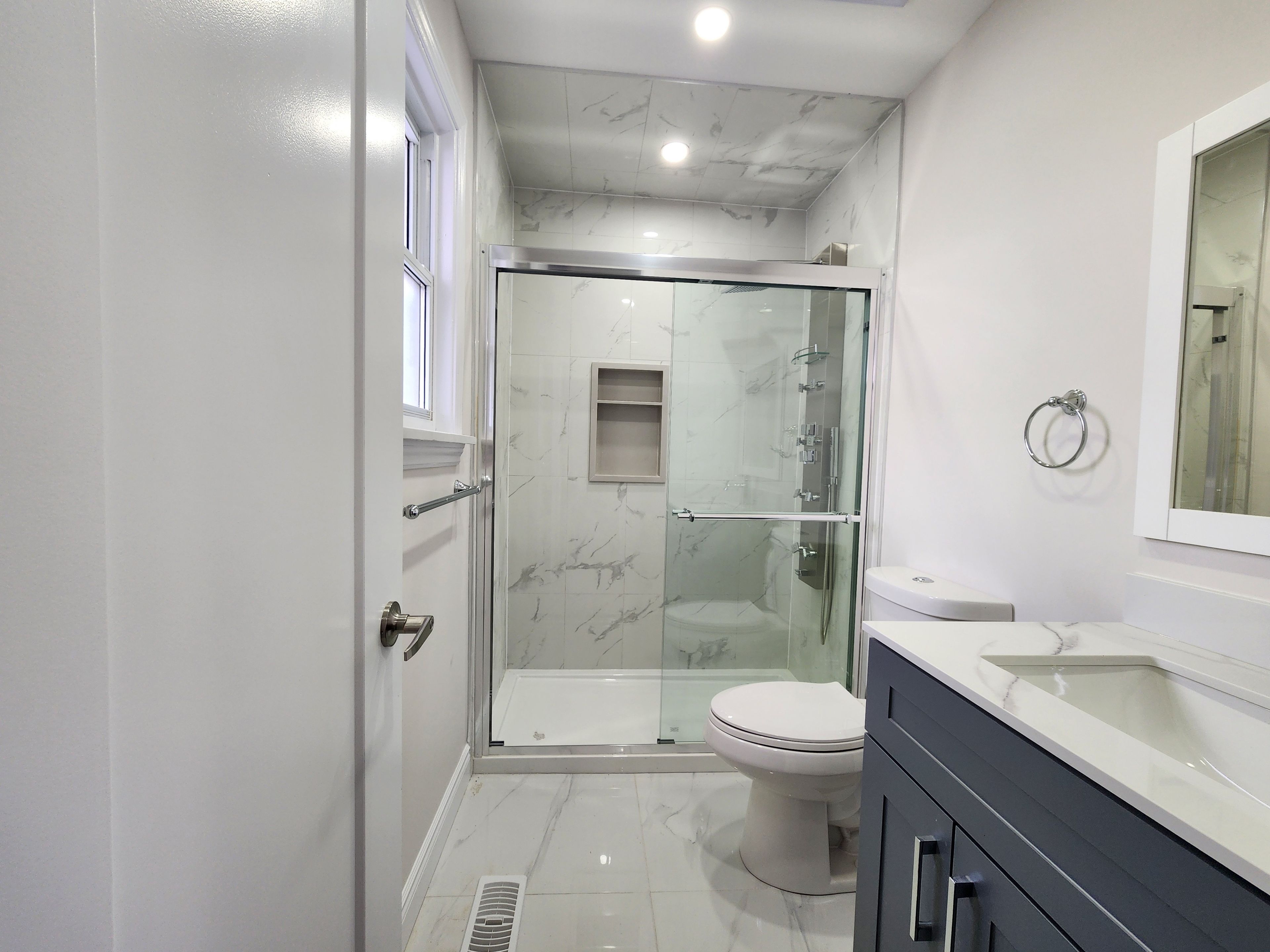 • Modern kitchen with quartz countertops and pot lights for functionality.