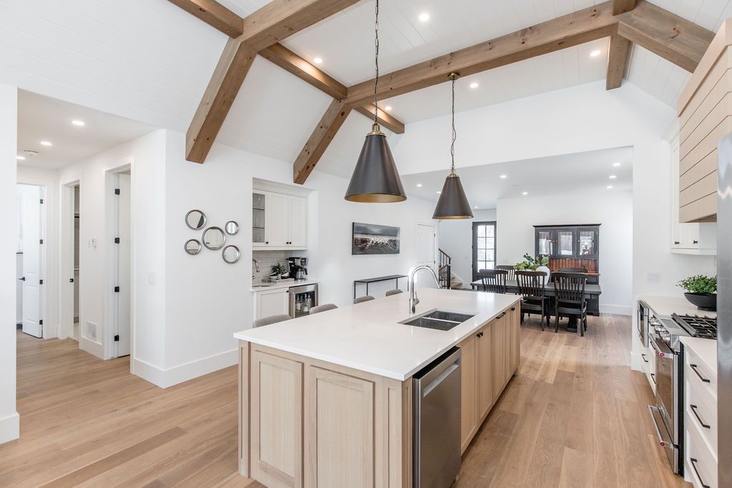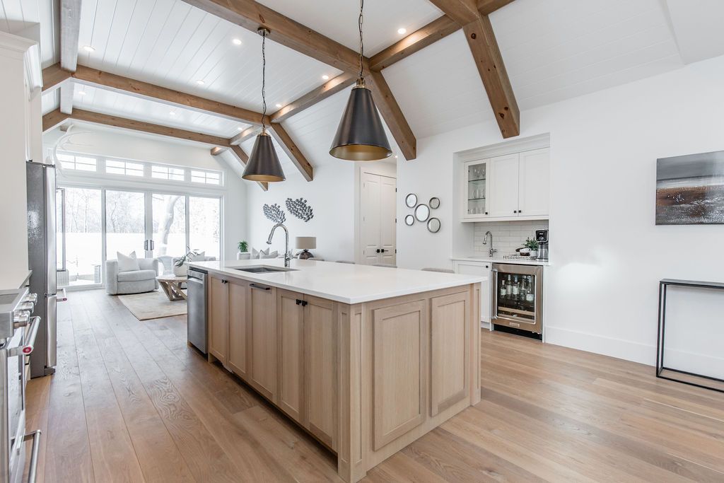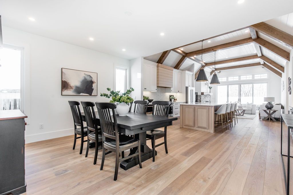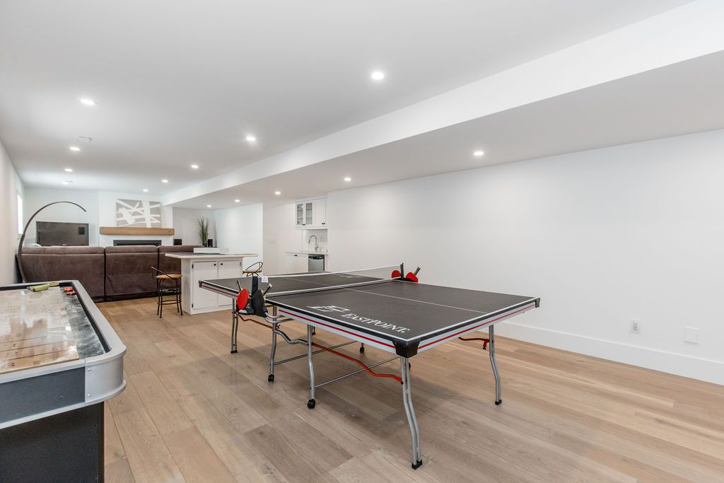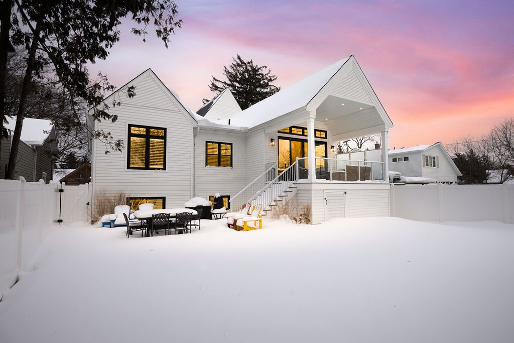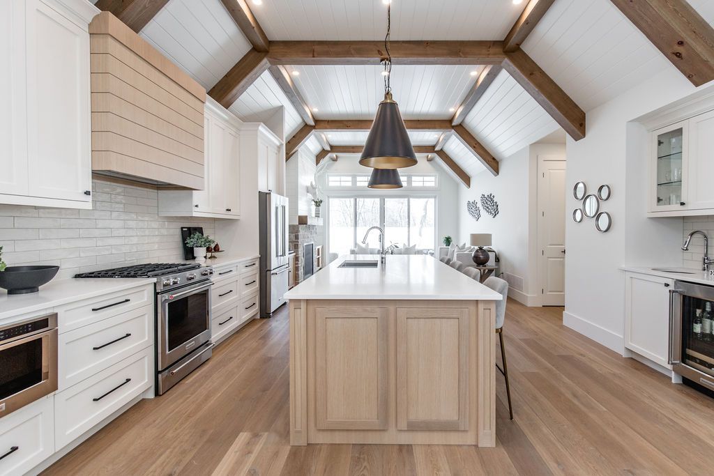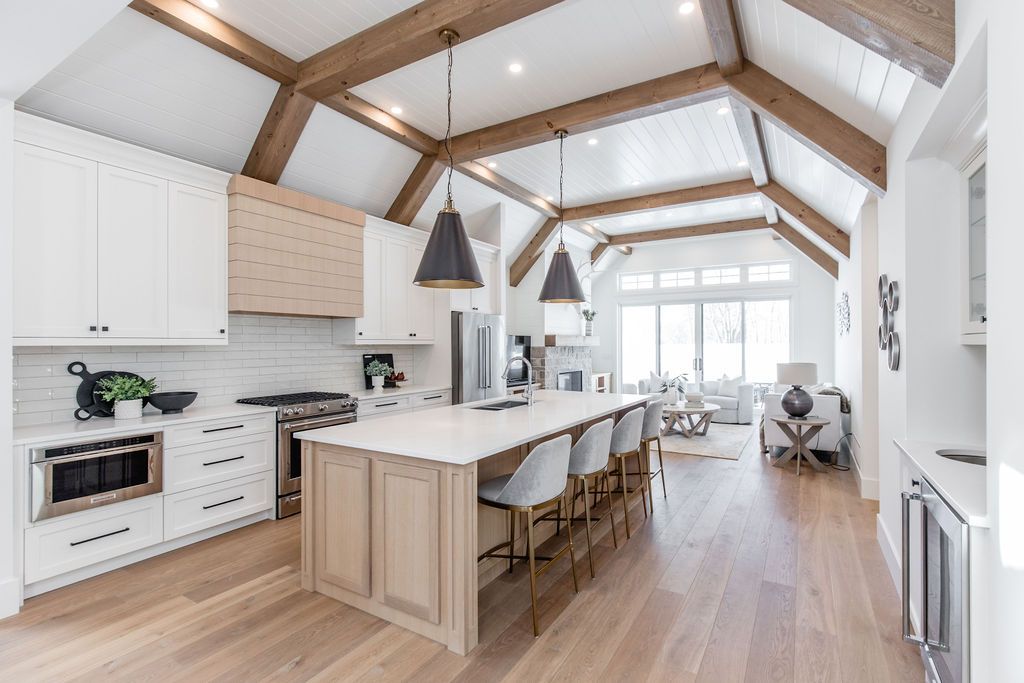 Fall in love with this spectacular custom-built vandermeer home just steps from georgian bay at sunset point, one of the area's most sought-after waterfront neighbourhoods. Offering over 3,700 sq ft of luxury living space, this 3+2 bedroom, 4 bathroom residence blends timeless craftsmanship with elevated modern finishes. Designed with 9-ft interior doors, upgraded hardware, wide-plank white oak hardwood flooring, and soaring 12-ft beamed cathedral ceilings with shiplap and pot lights, the home delivers an airy, open-concept layout ideal for both everyday living and entertaining. The gourmet designer kitchen features a statement centre island, stainless steel appliances, and a wet bar, seamlessly flowing into the dining and family rooms. The main-floor primary suite is a true retreat with a spa-inspired 5-piece ensuite, floating soaker tub, glass shower, heated floors, double quartz vanity, and walk-in closet. A second main-floor bedroom or office adds flexibility for guests or remote work. The upper loft family room and finished lower-level recreation room, both with gas fireplaces, offer multiple living spaces for families or multigenerational living. The basement includes two additional bedrooms, a wet bar, and rough-in for heated floors, making it ideal for guests or extended family. Enjoy summer evenings on the covered back deck, a fenced yard, and direct access from the mudroom/ski locker with inside garage entry, perfect for four-season living near the bay. With three gas fireplaces, central air, central vacuum, and premium finishes throughout, this home offers luxury, comfort, and location in equal measure.