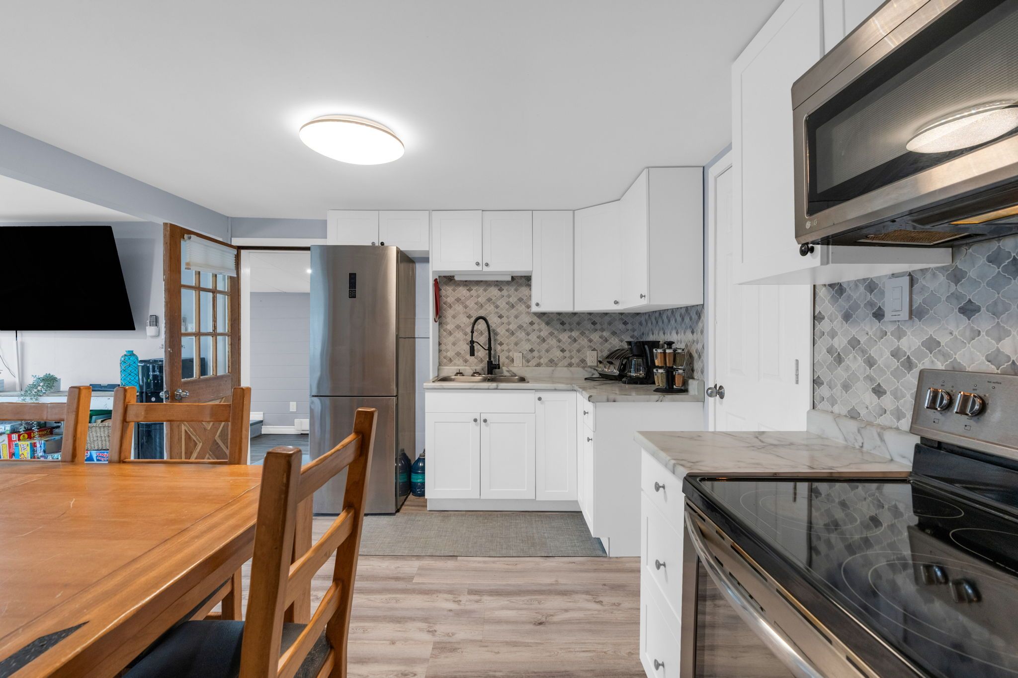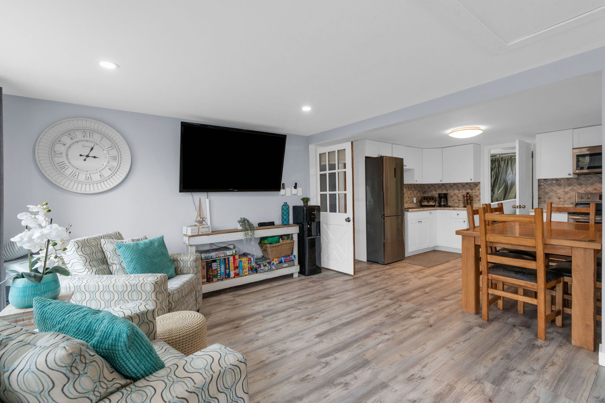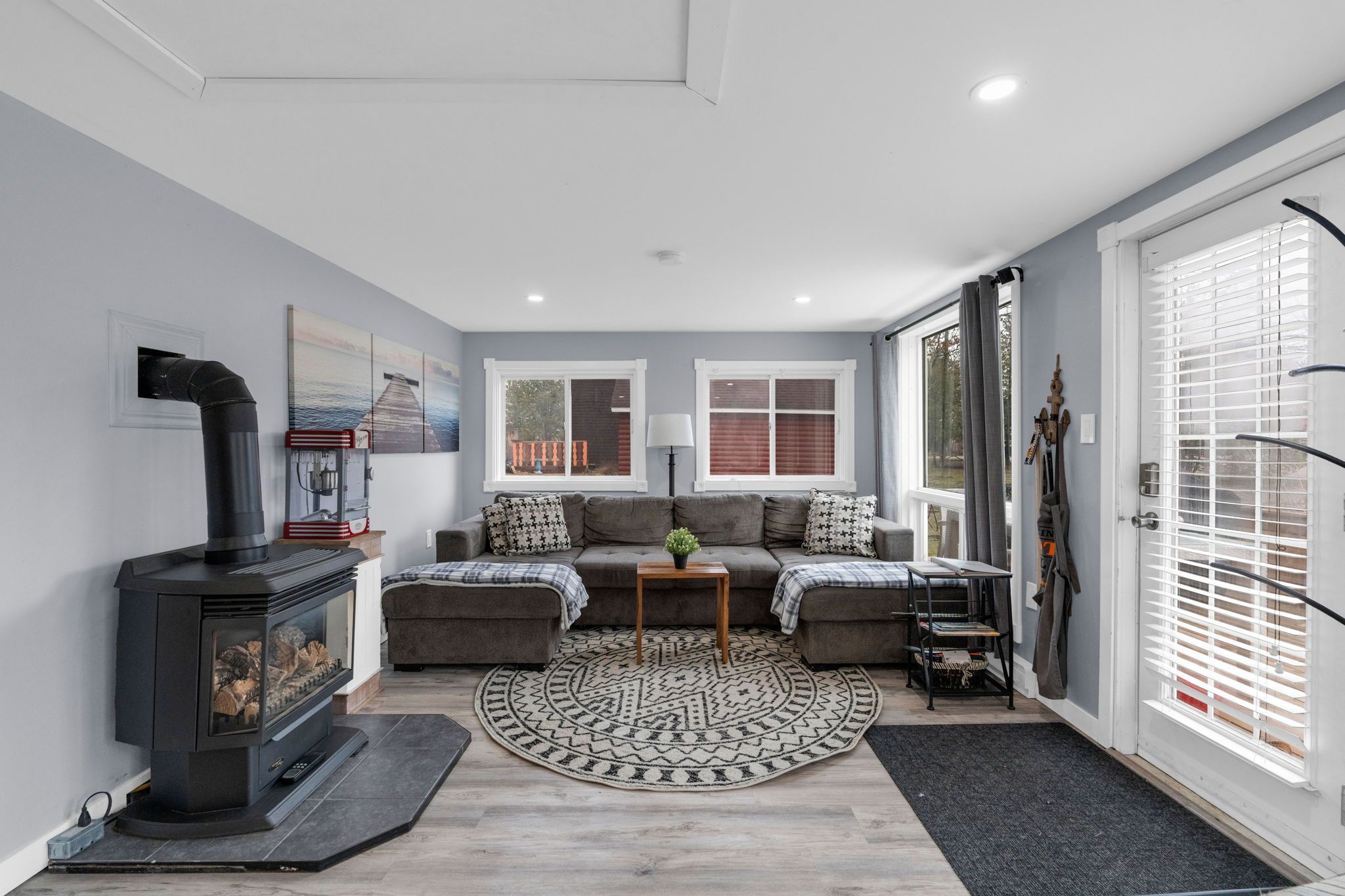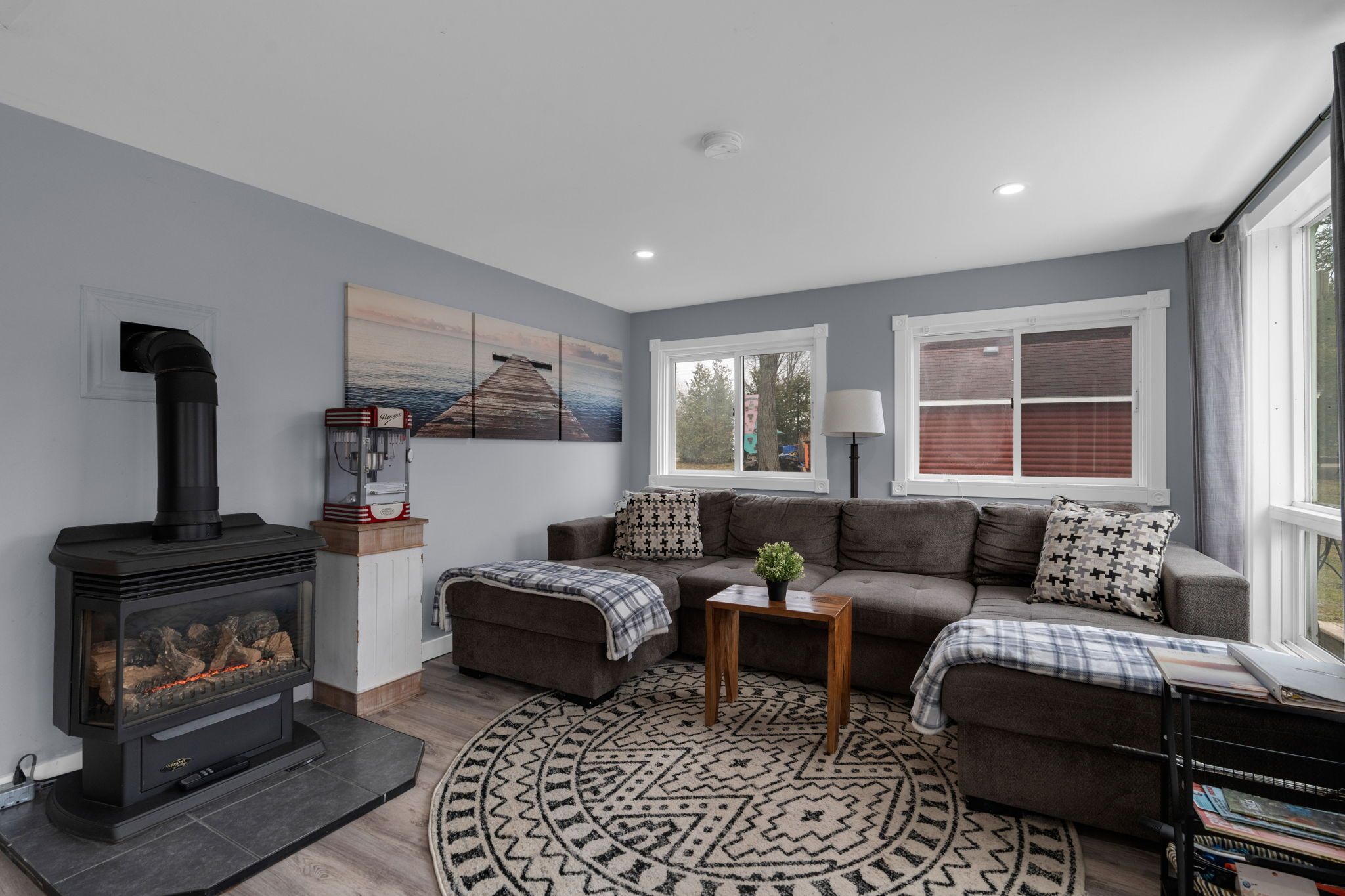 • Bright living area with cozy gas fireplace and open kitchen layout.