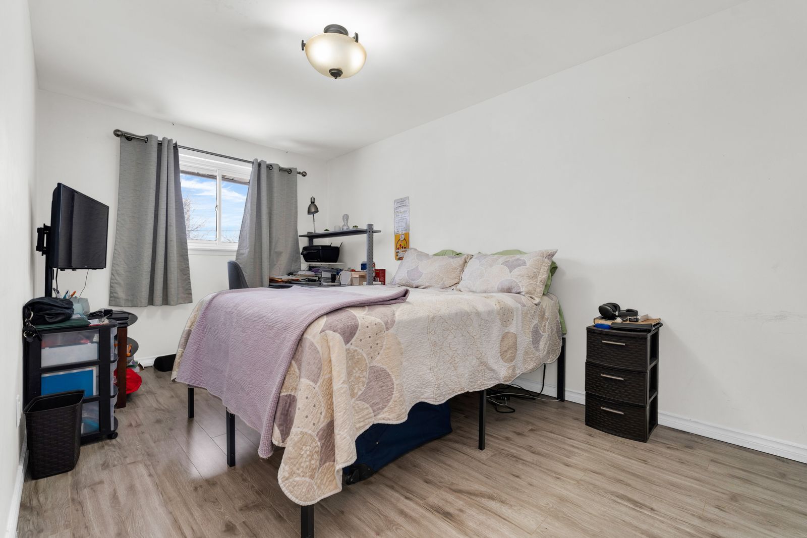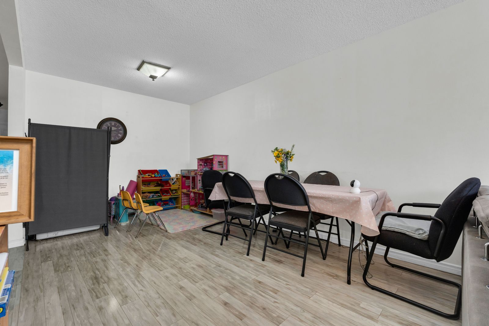 • Bright open-concept living space with large windows and an electric fireplace.