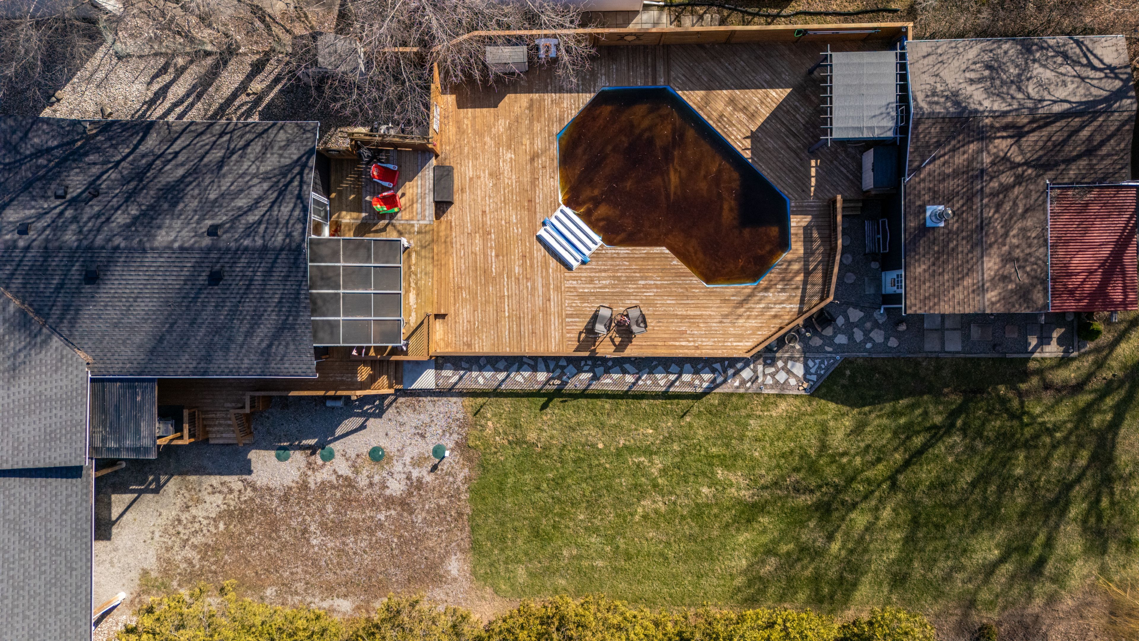 • Spacious one-acre lot with a massive deck and heated saltwater pool.