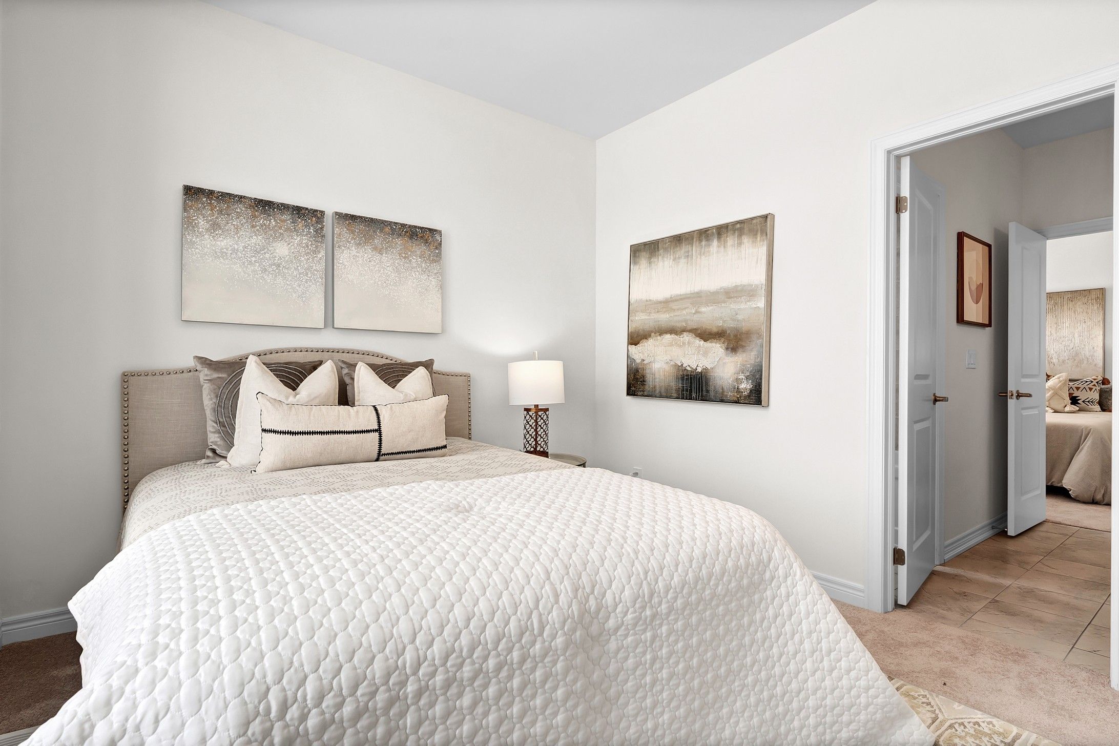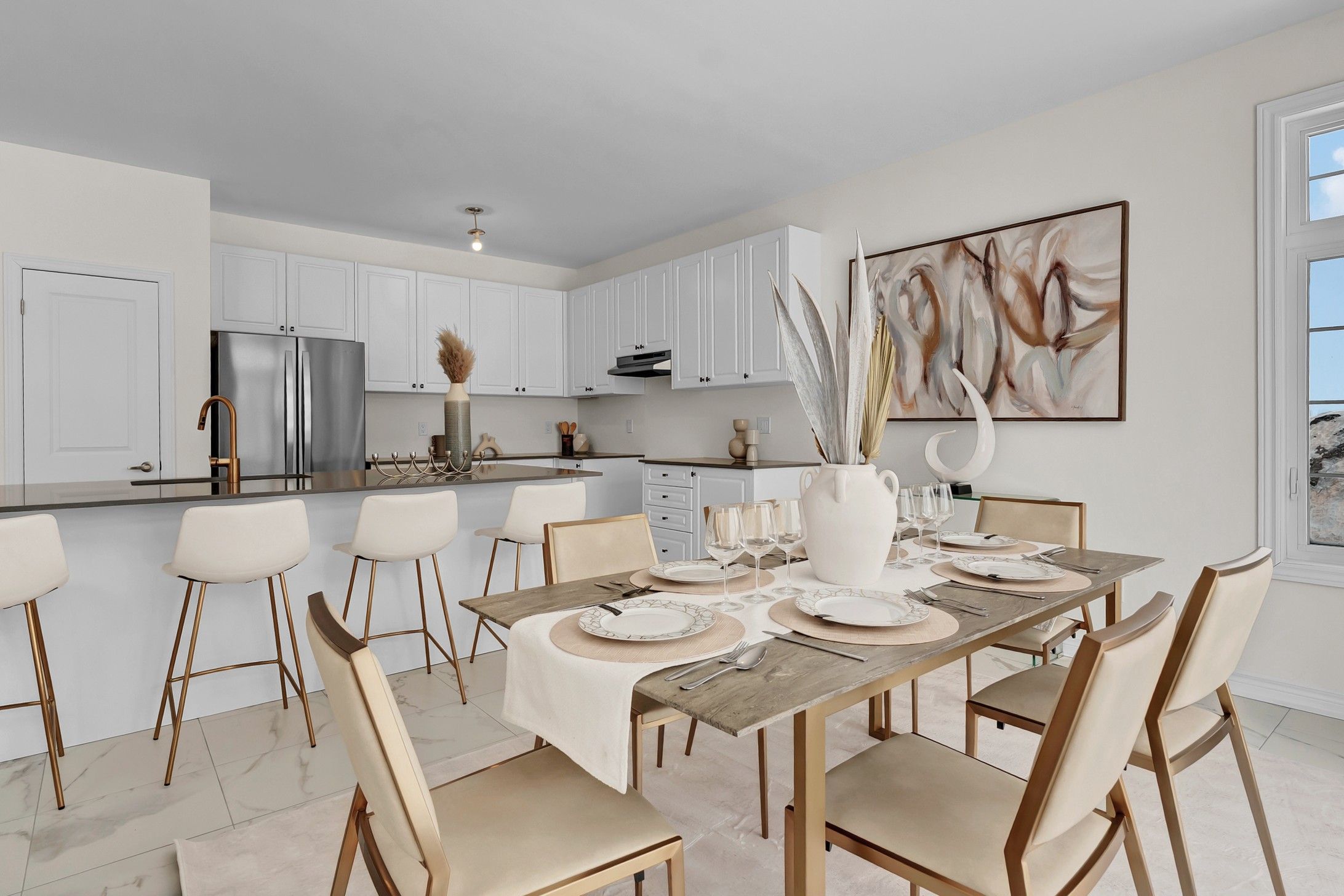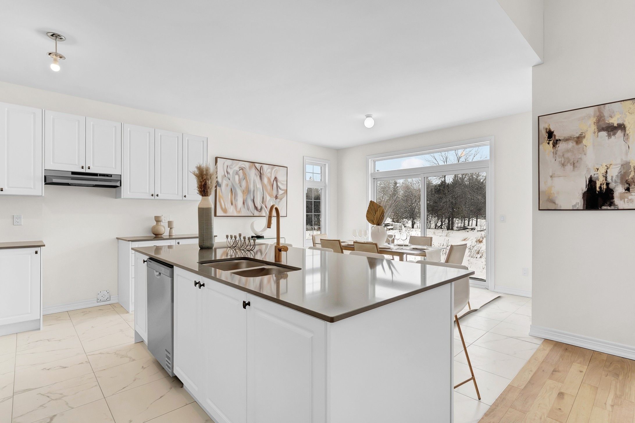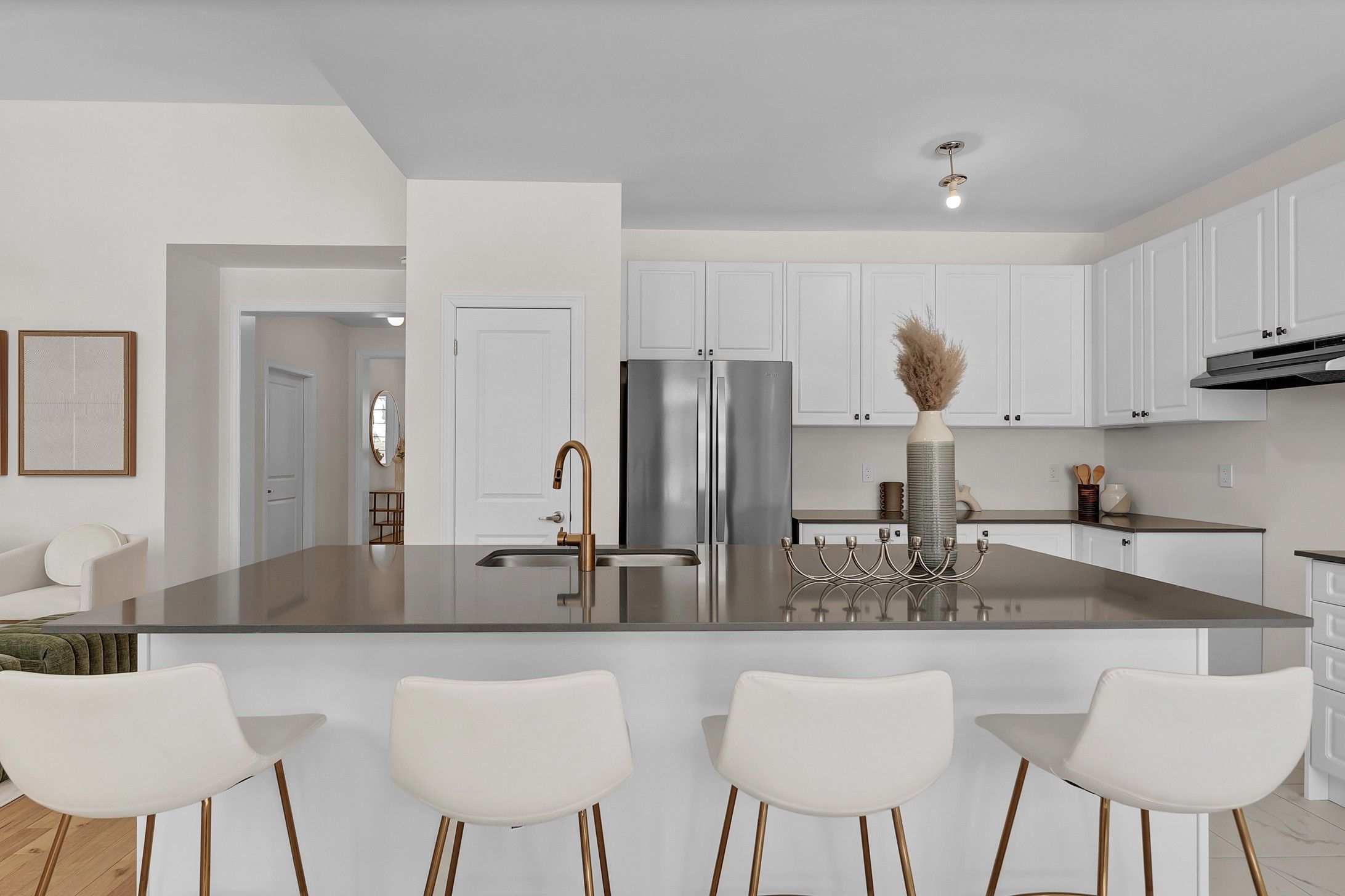 • Upscale kitchen with quartz countertops and custom cabinetry.