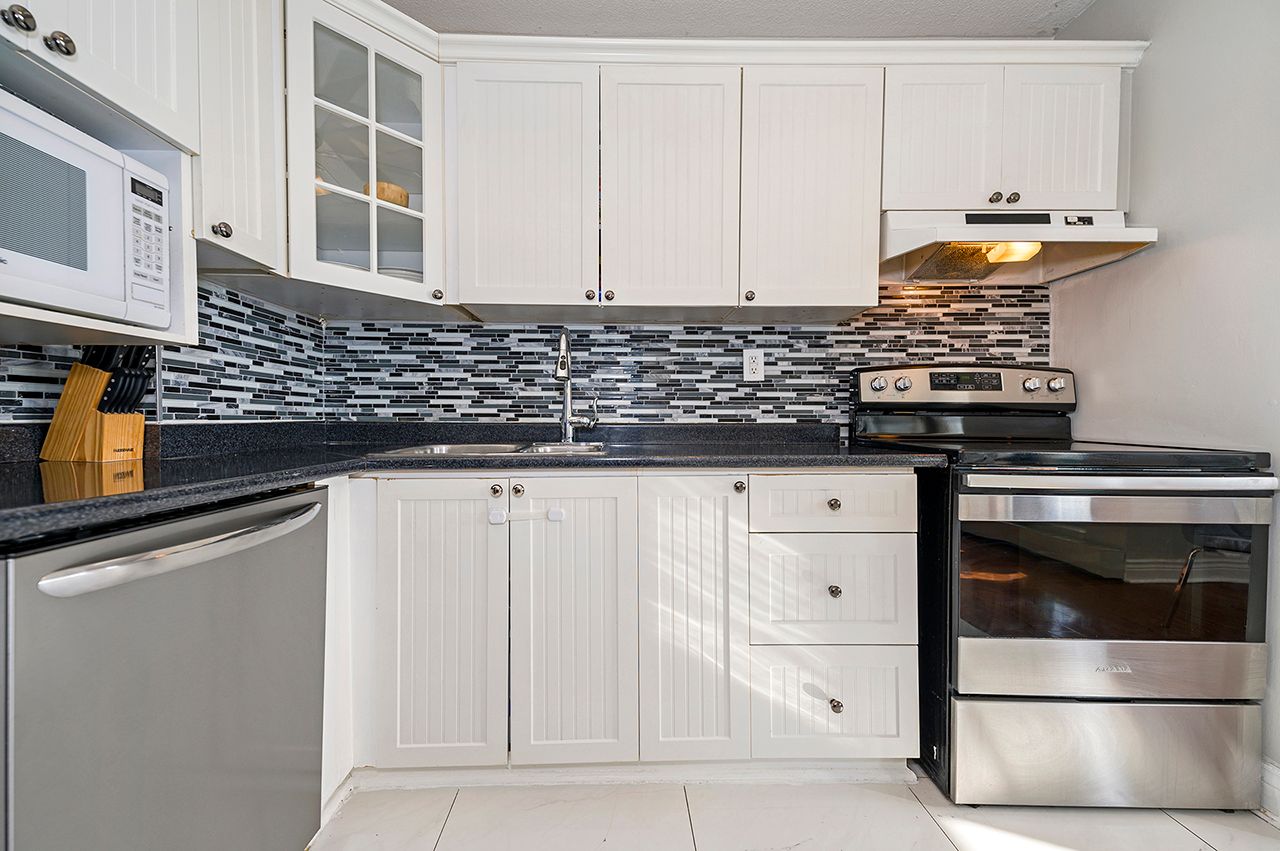 • Modern kitchen featuring stainless steel appliances and a stylish backsplash.
