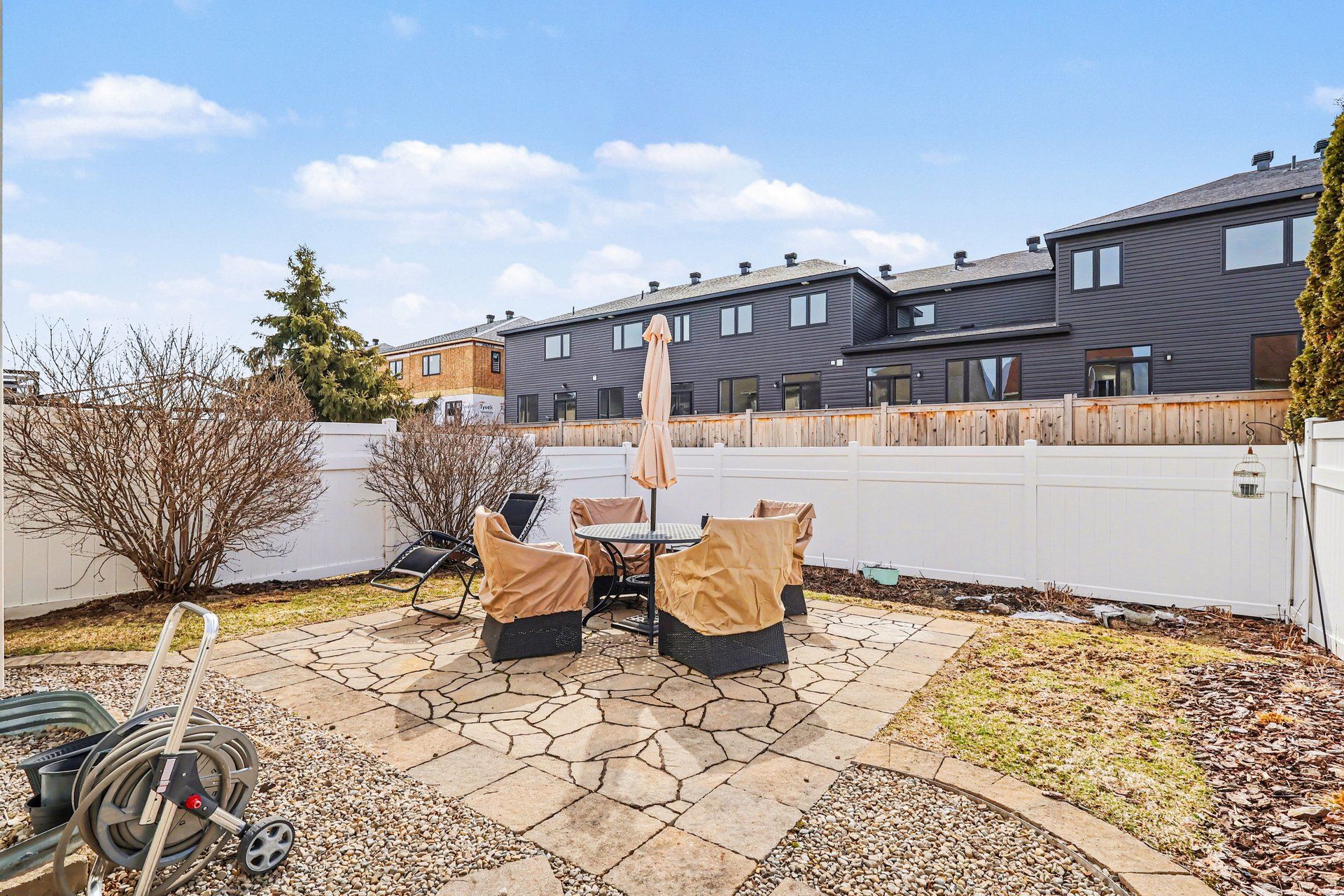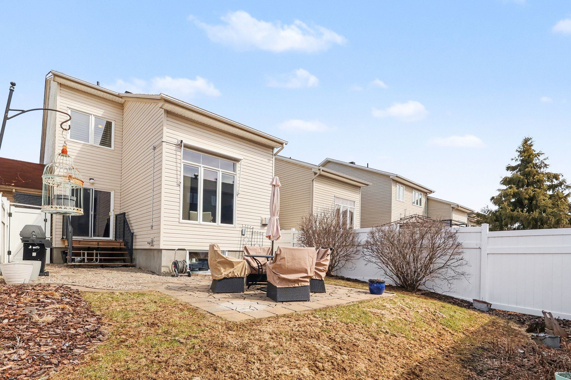 • PVC fenced backyard with a stone patio, perfect for outdoor enjoyment.