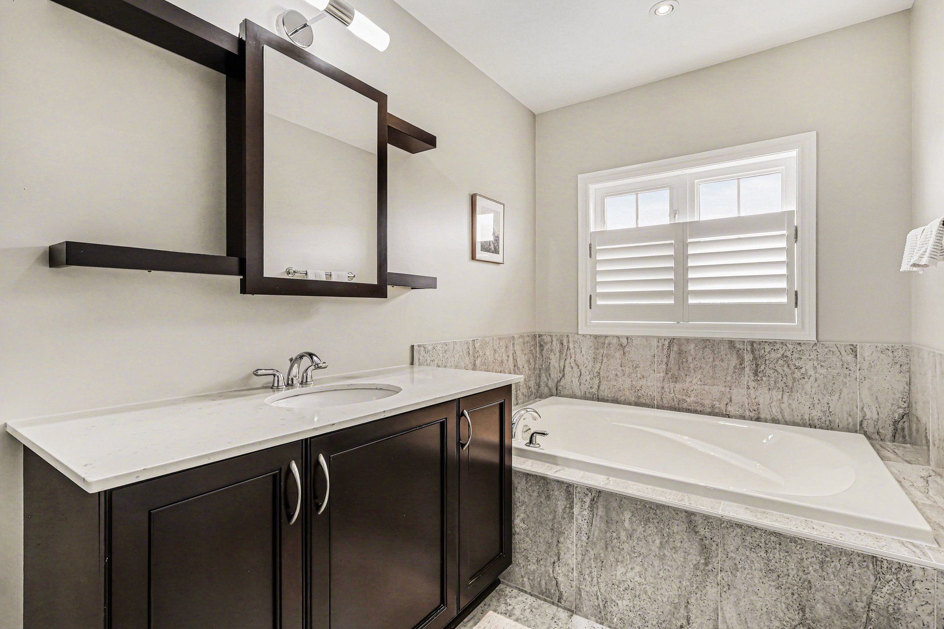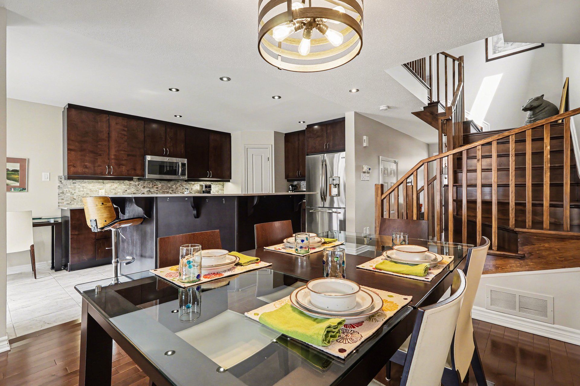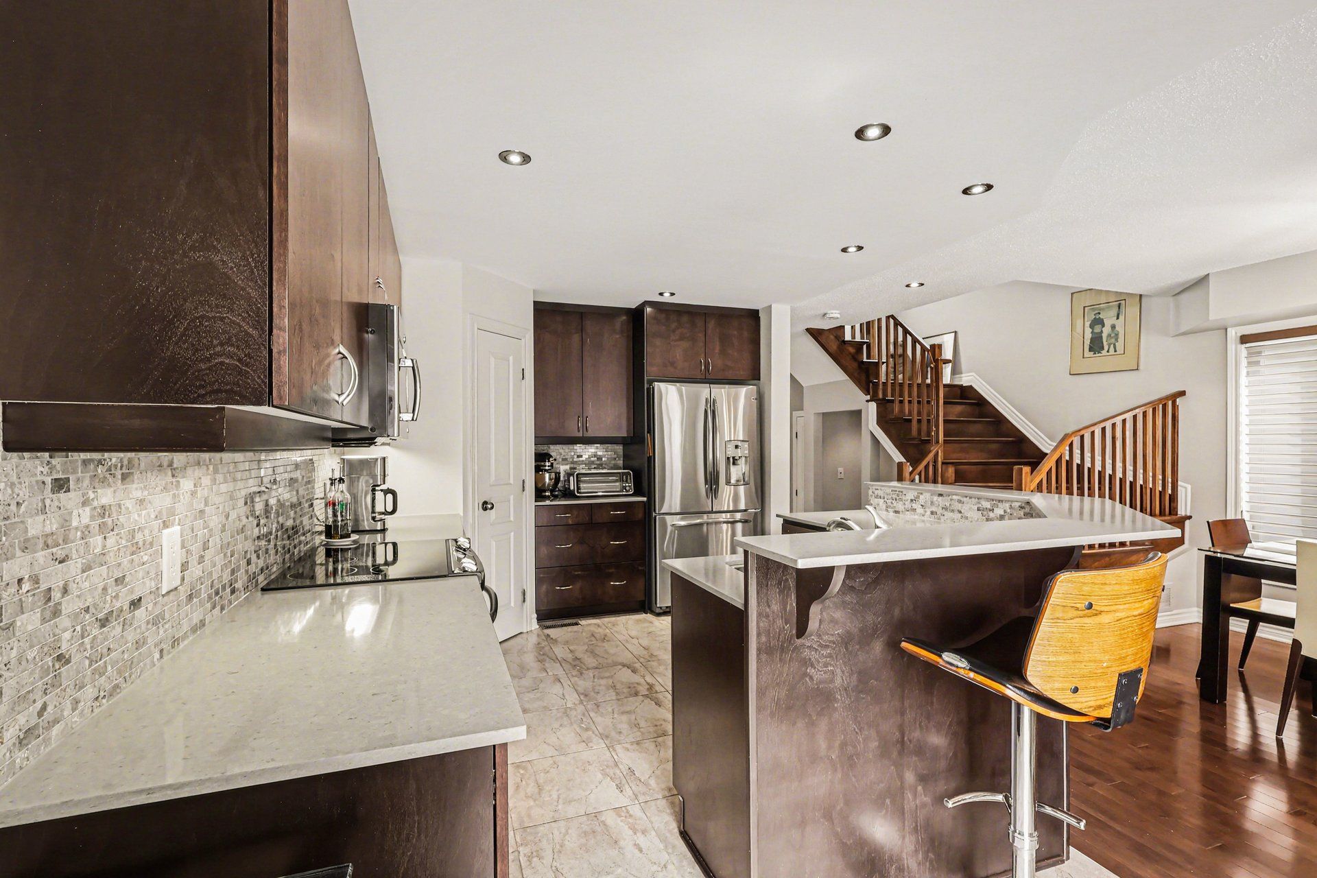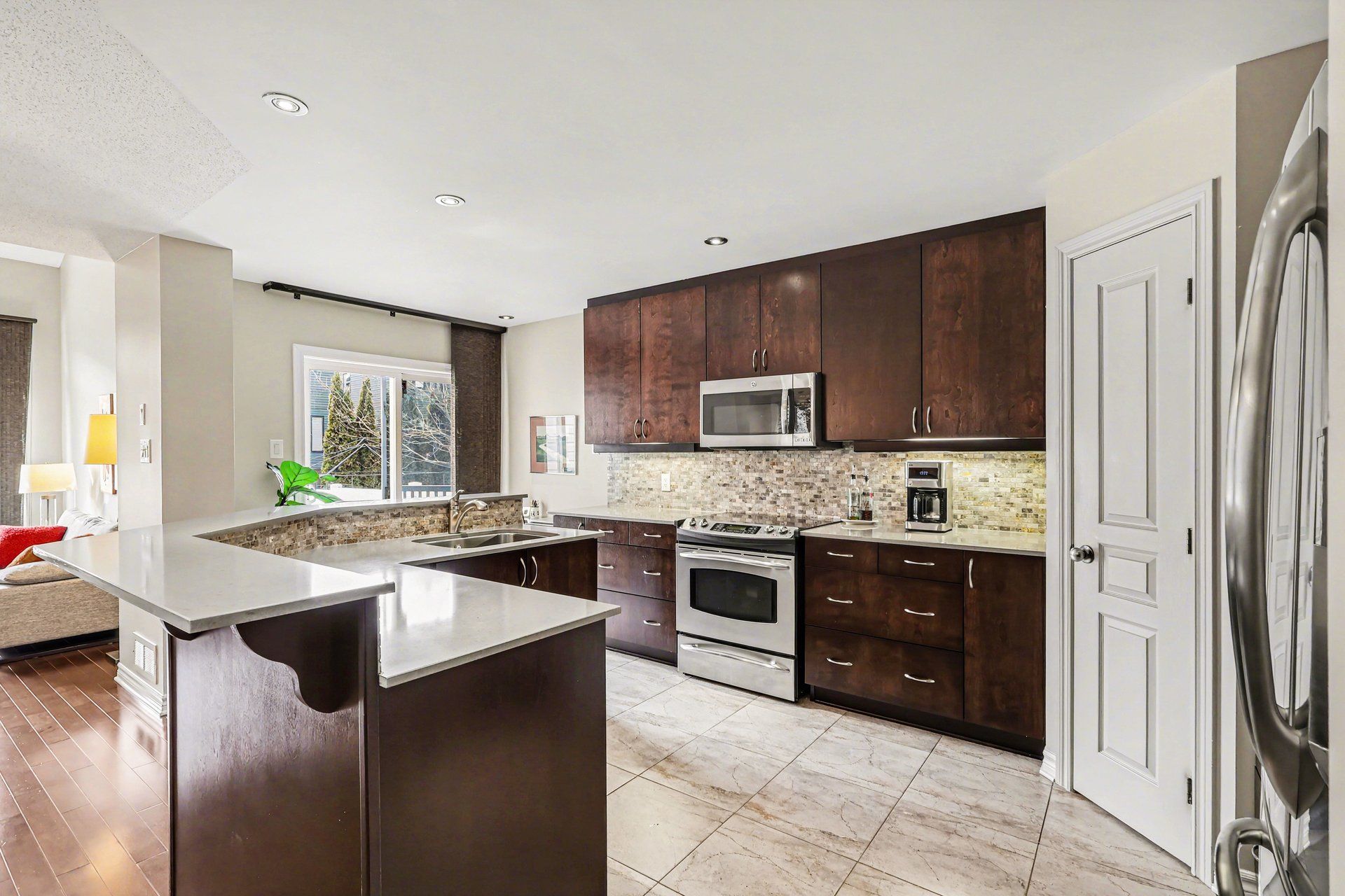 • Renovated open concept kitchen with quartz countertops and stainless steel appliances.