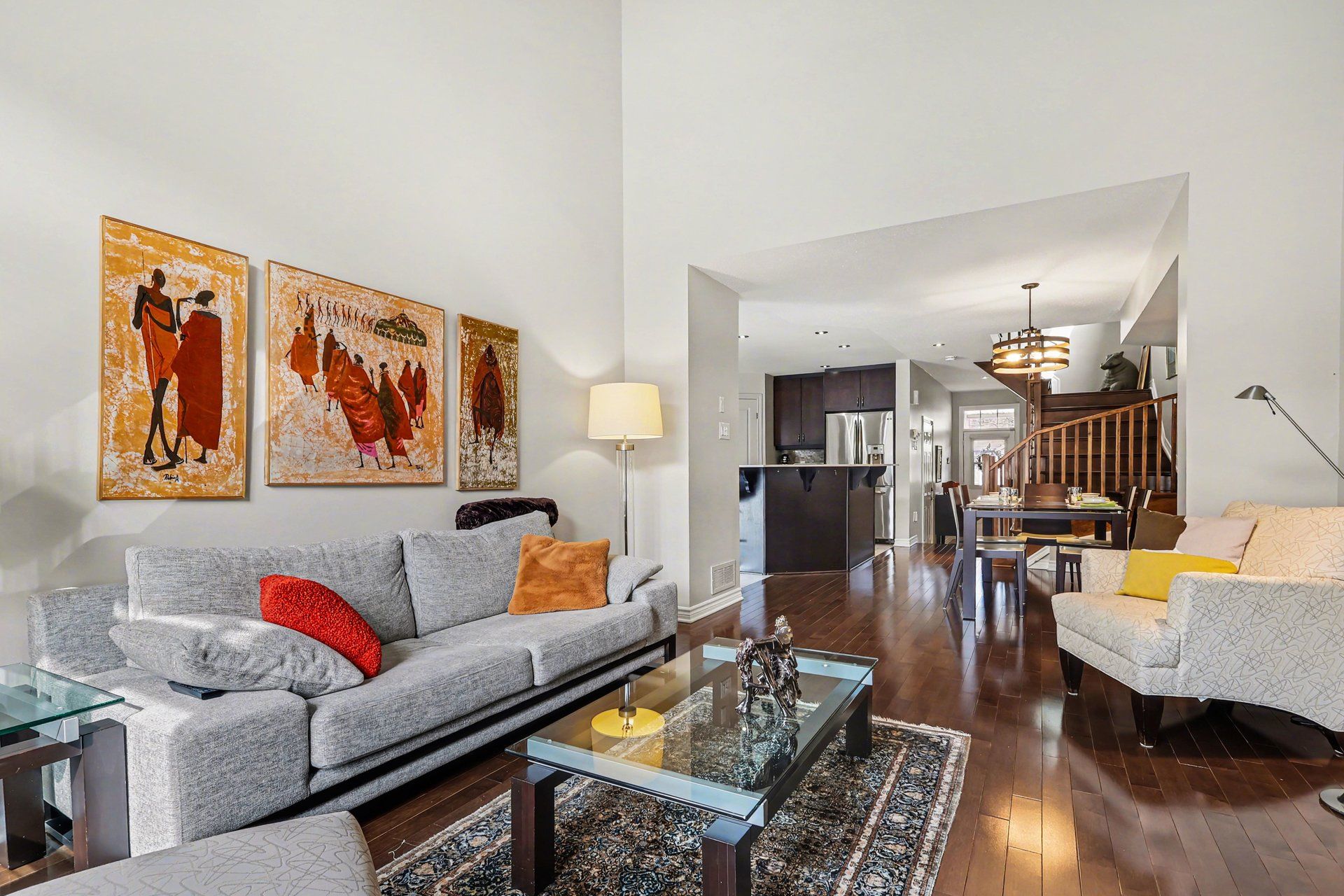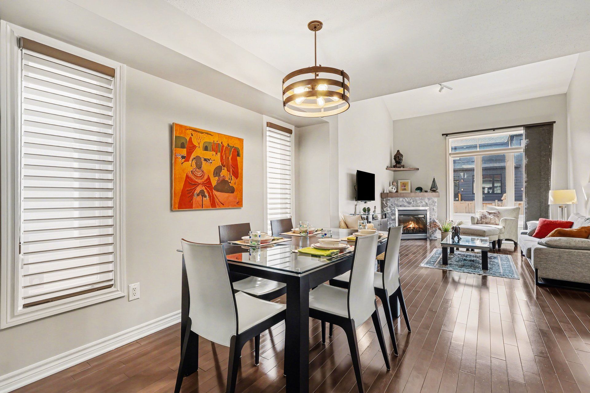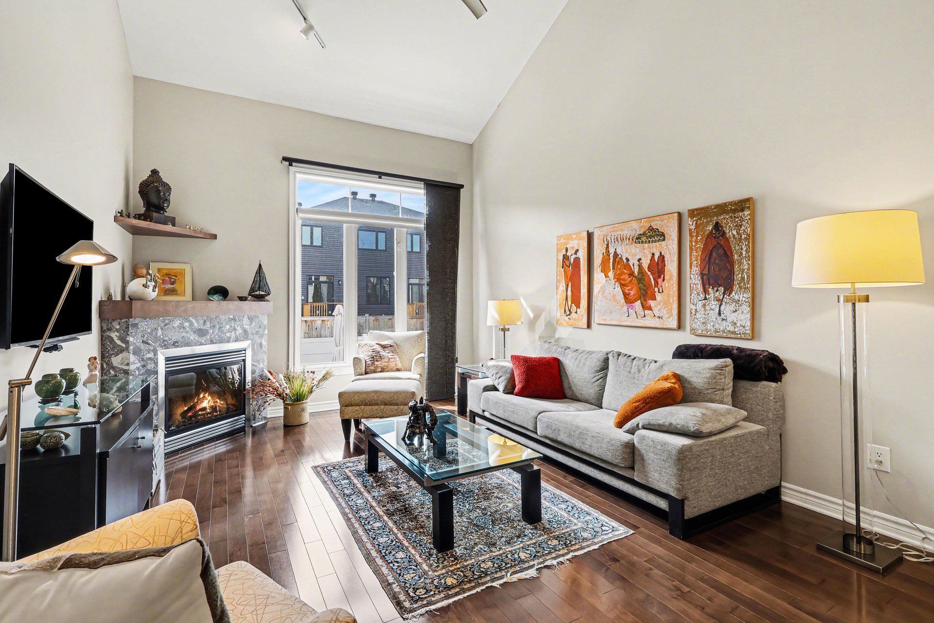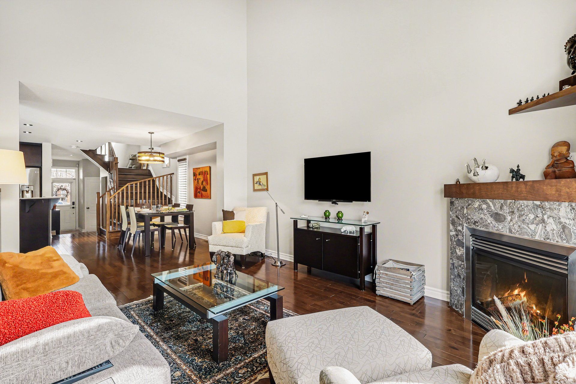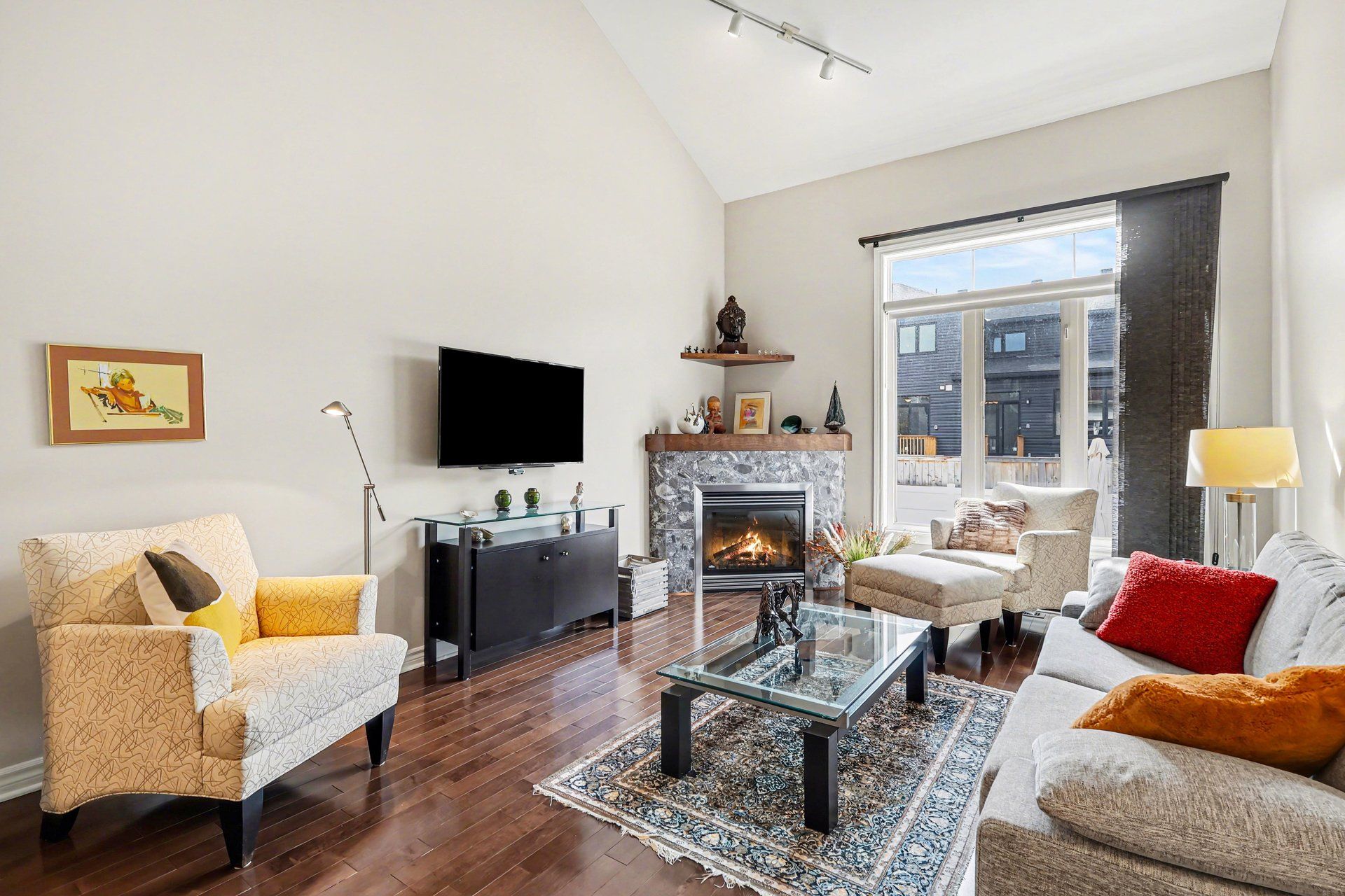 • High vaulted ceilings in living room with updated gas fireplace.