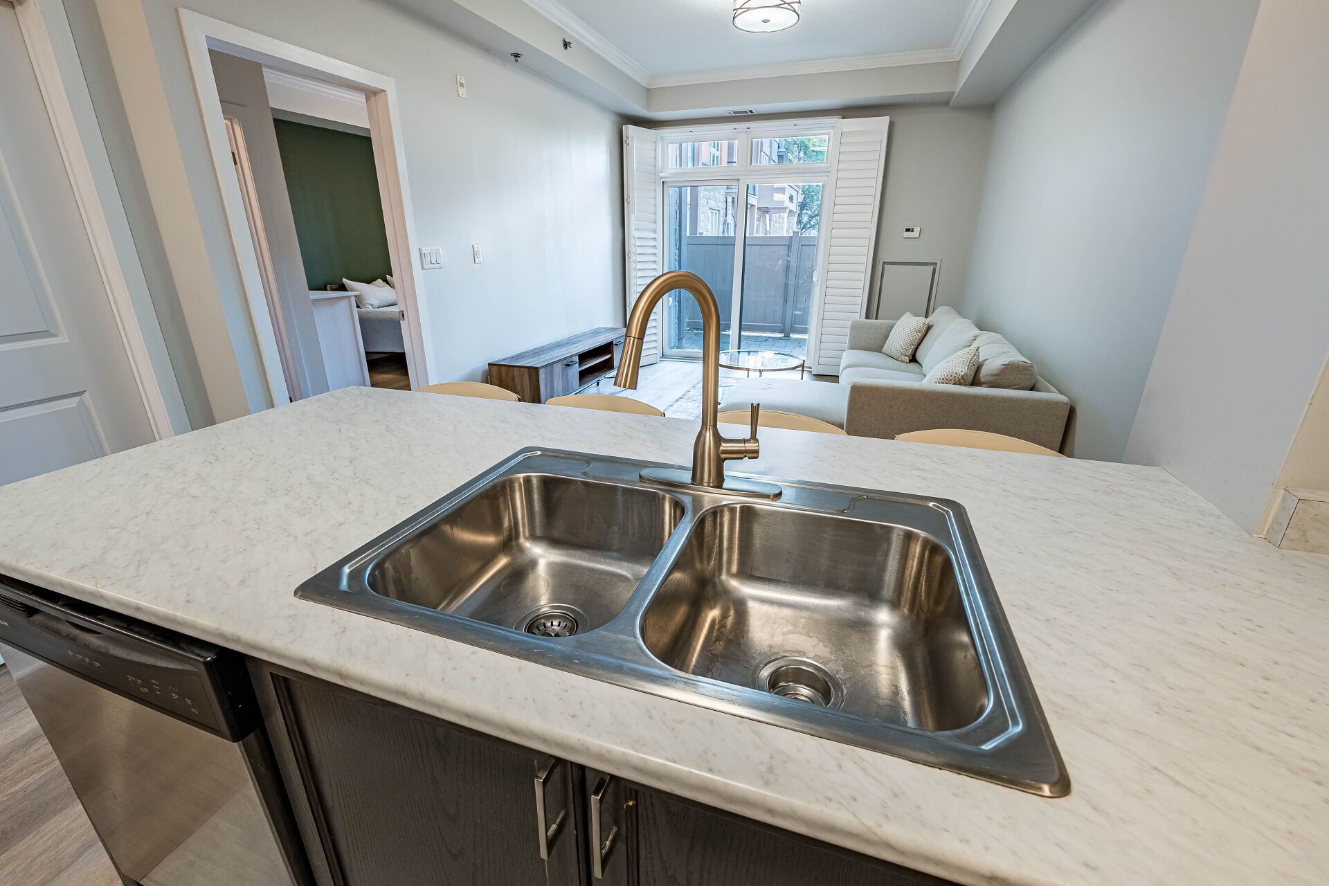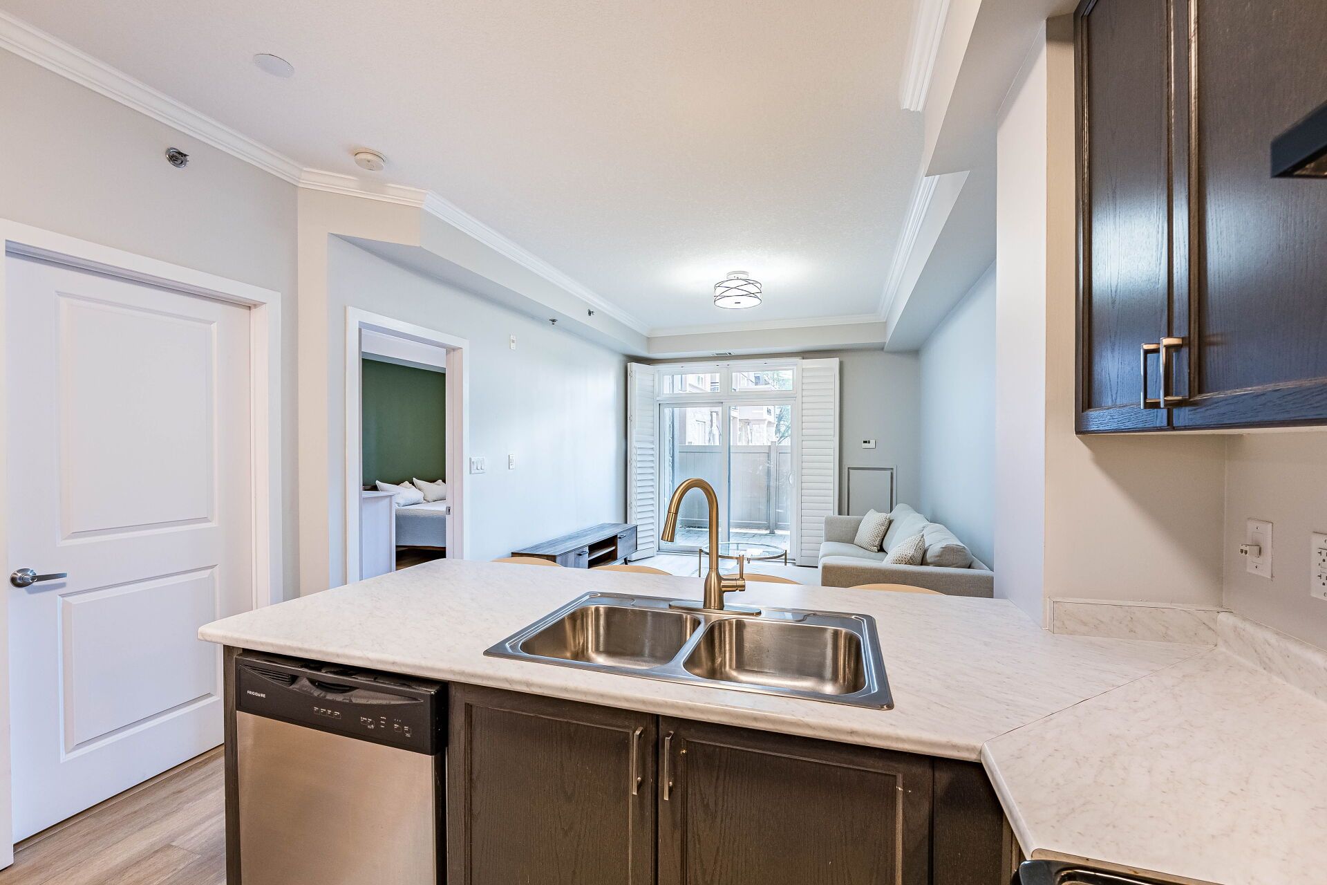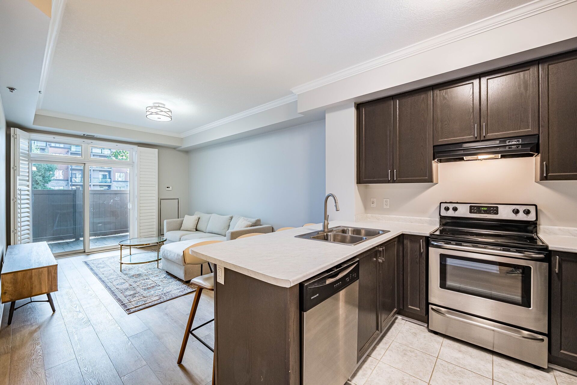 Welcome to the haven your perfect ground-floor retreat! Step into this beautifully maintained, move-in-ready 1-bedroom + den condo featuring soaring 9-foot ceilings and a walkout to your own private patio. This unit includes parking and a locker for added convenience. Enjoy a modern open-concept kitchen with ample cabinet and counter space ideal for cooking and entertaining. One of the best 1+den layouts in the building, offering a spacious den that can easily function as a home office, dining area, or kids playroom. The primary bedroom is generously sized and features a walk-in closet. Recent upgrades include new flooring throughout, and the ensuite laundry has been thoughtfully recessed to create extra in-unit storage. Plus, your locker unit is conveniently located on the same floor, just down the hallway. Situated just steps from bronte creek provincial park, you'll have access to scenic trails and green spaces. Commuters will love the easy access to qew, appleby go station, and highway 407.