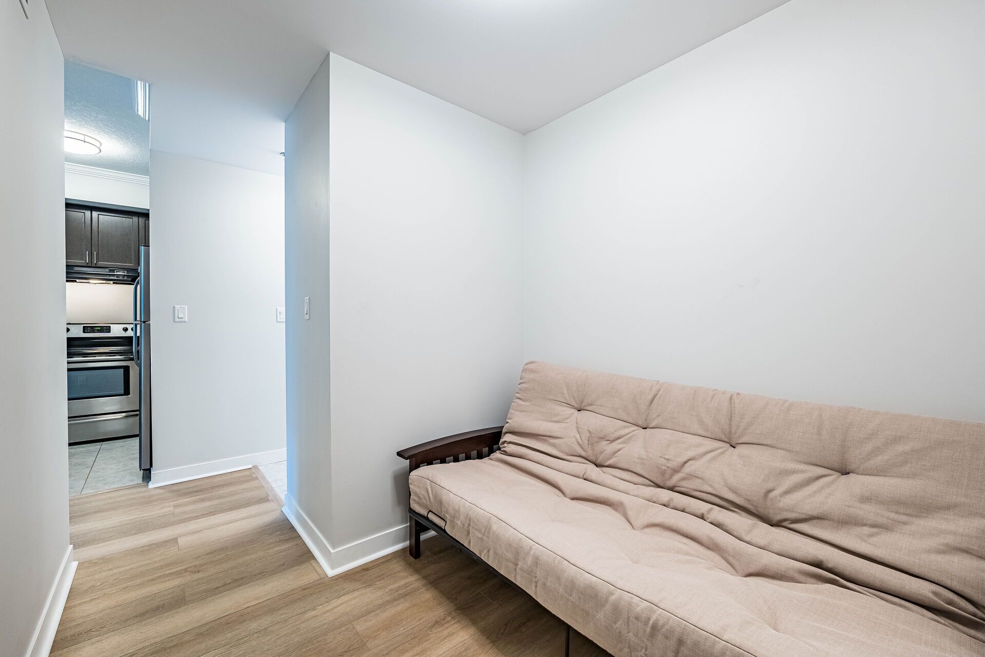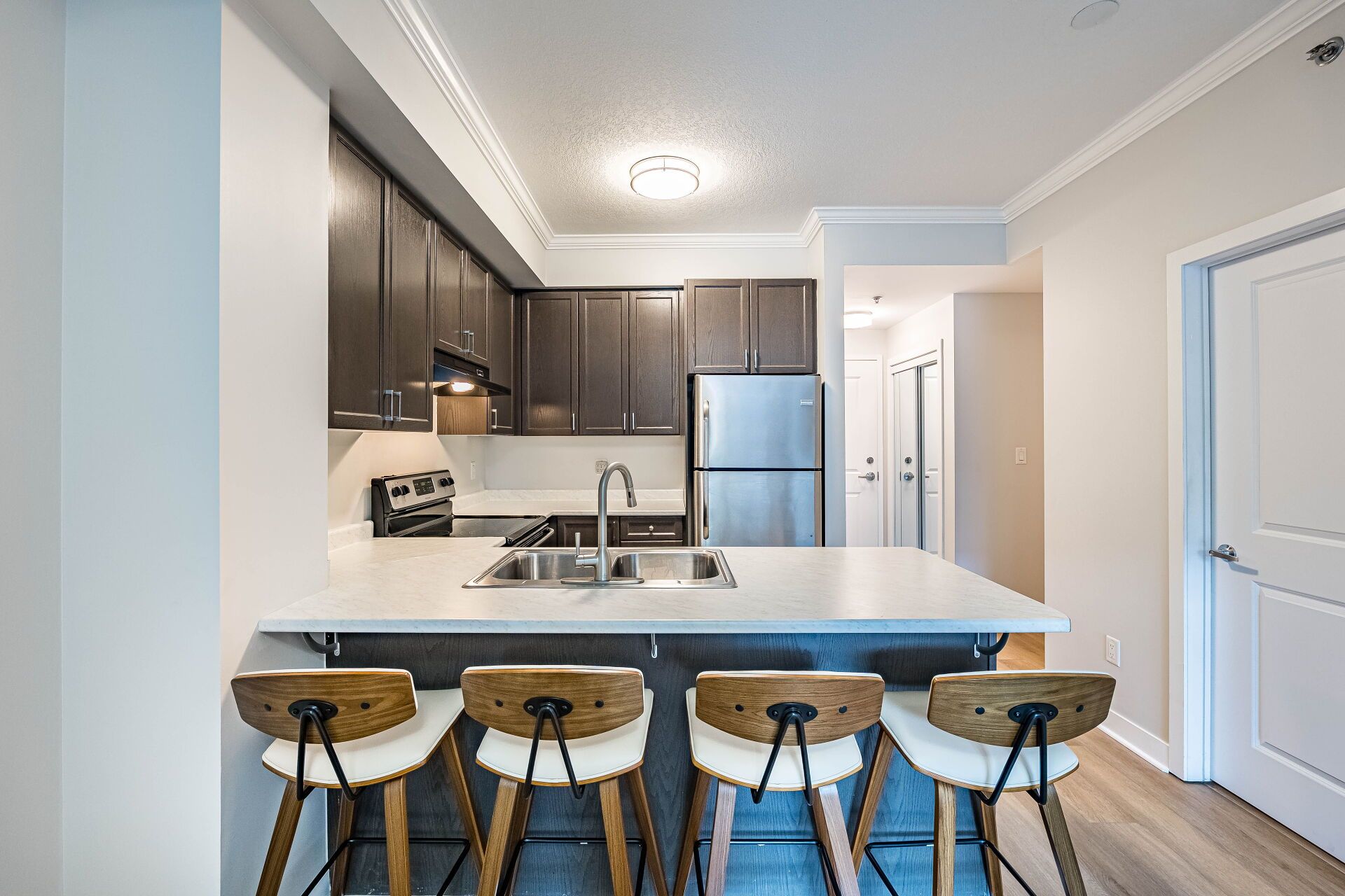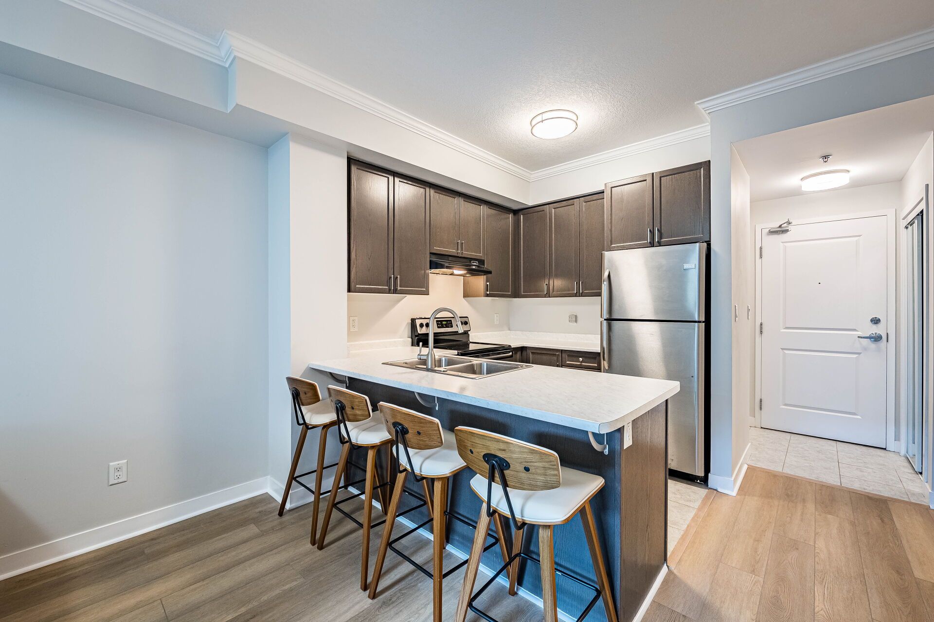 Welcome to the haven your perfect ground-floor retreat! Step into this beautifully maintained, move-in-ready 1-bedroom + den condo featuring soaring 9-foot ceilings and a walkout to your own private patio. This unit includes parking and a locker for added convenience. Enjoy a modern open-concept kitchen with ample cabinet and counter space ideal for cooking and entertaining. One of the best 1+den layouts in the building, offering a spacious den that can easily function as a home office, dining area, or kids playroom. The primary bedroom is generously sized and features a walk-in closet. Recent upgrades include new flooring throughout, and the ensuite laundry has been thoughtfully recessed to create extra in-unit storage. Plus, your locker unit is conveniently located on the same floor, just down the hallway. Situated just steps from bronte creek provincial park, you'll have access to scenic trails and green spaces. Commuters will love the easy access to qew, appleby go station, and highway 407.