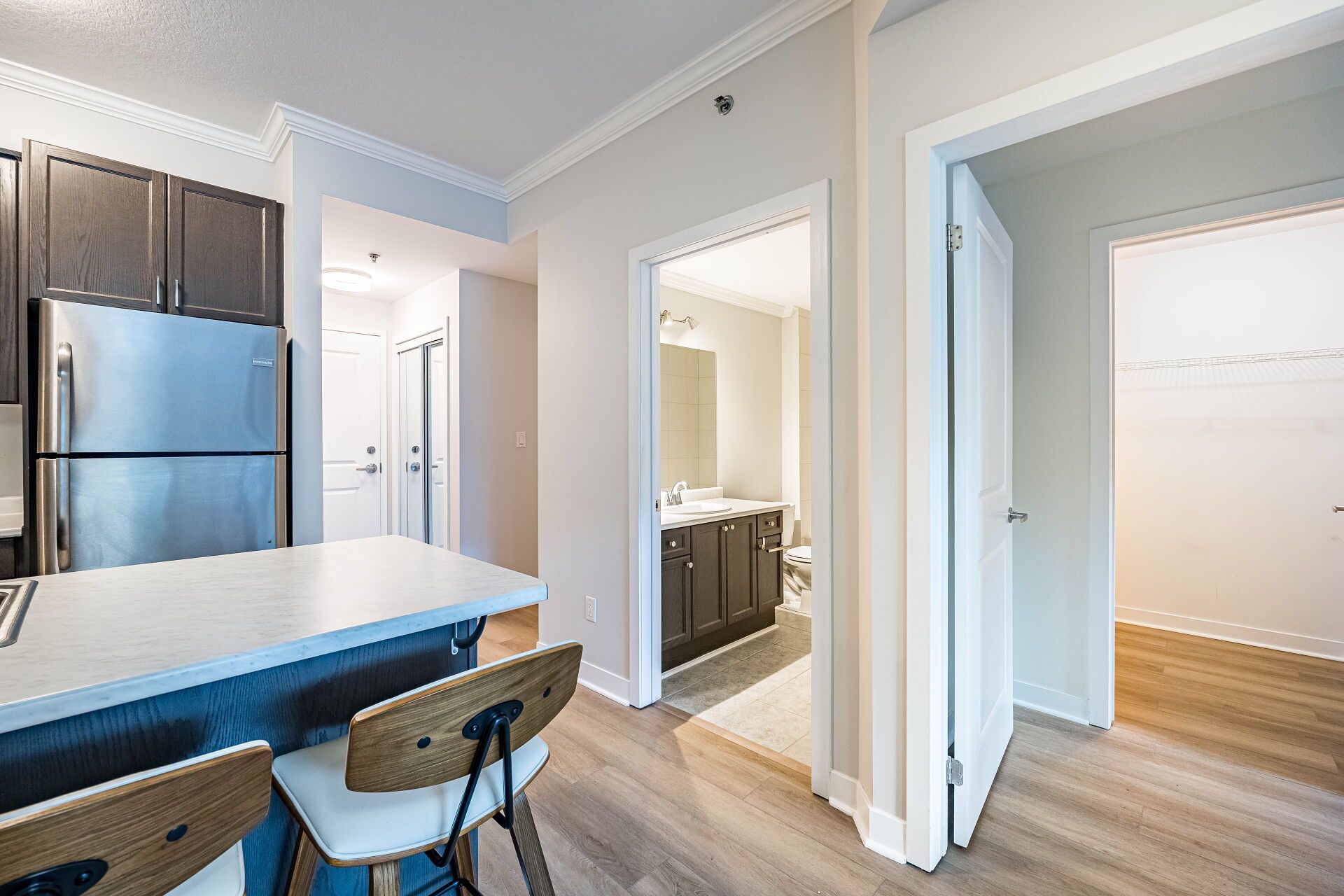 • Modern open-concept kitchen with plenty of cabinet and counter space.