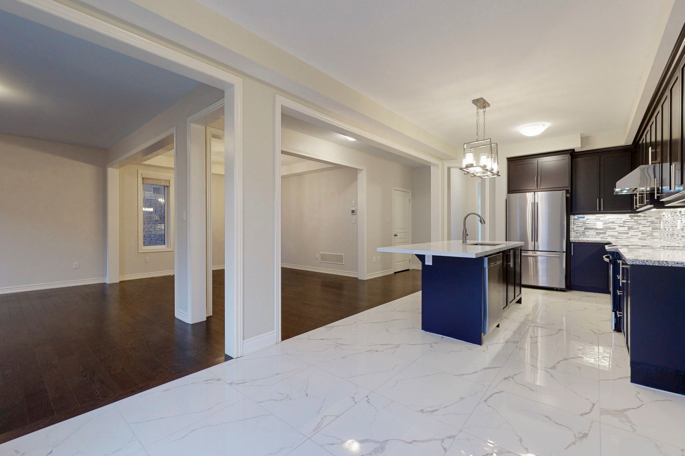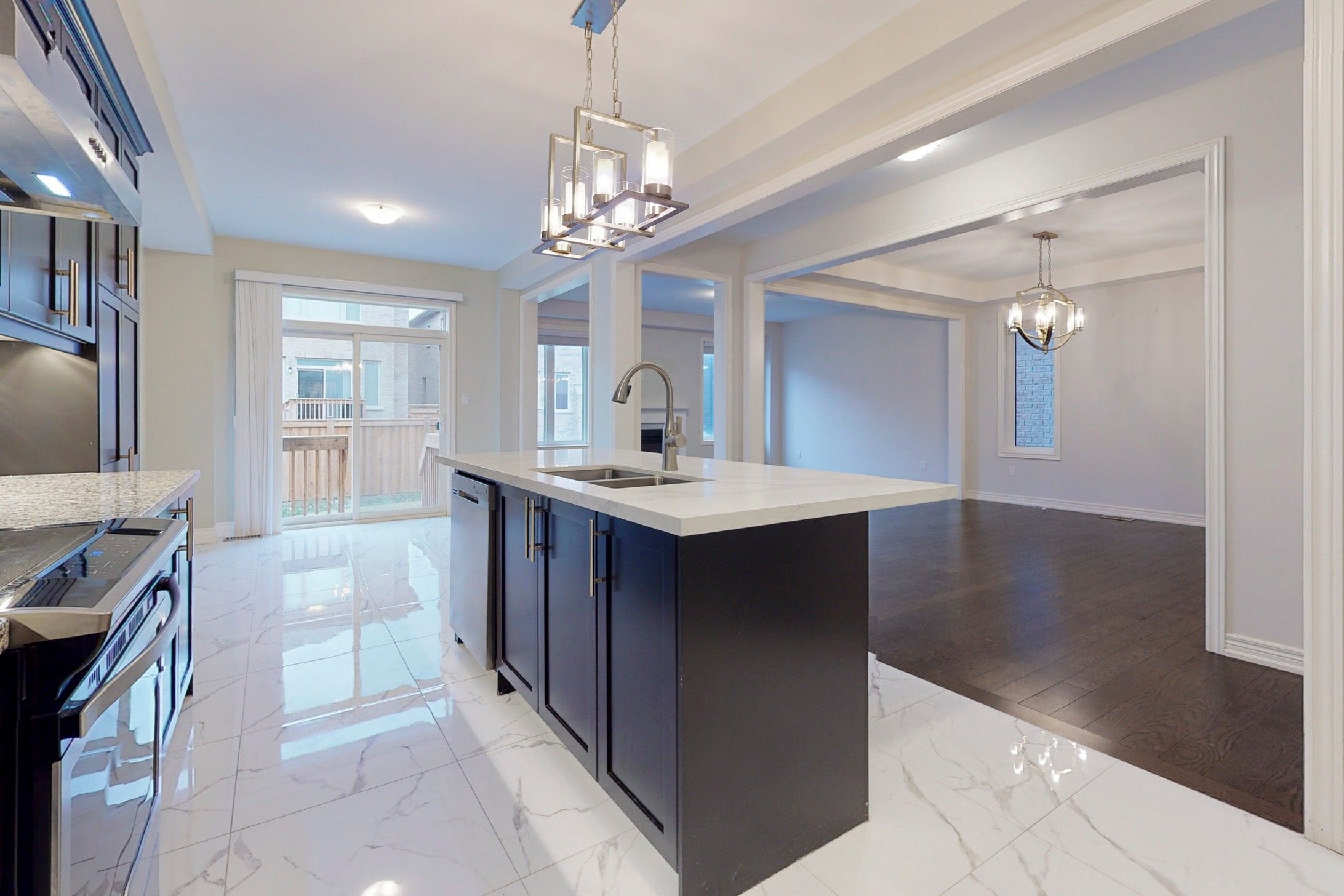• Gourmet kitchen featuring dark cabinetry and an oversized quartz island.