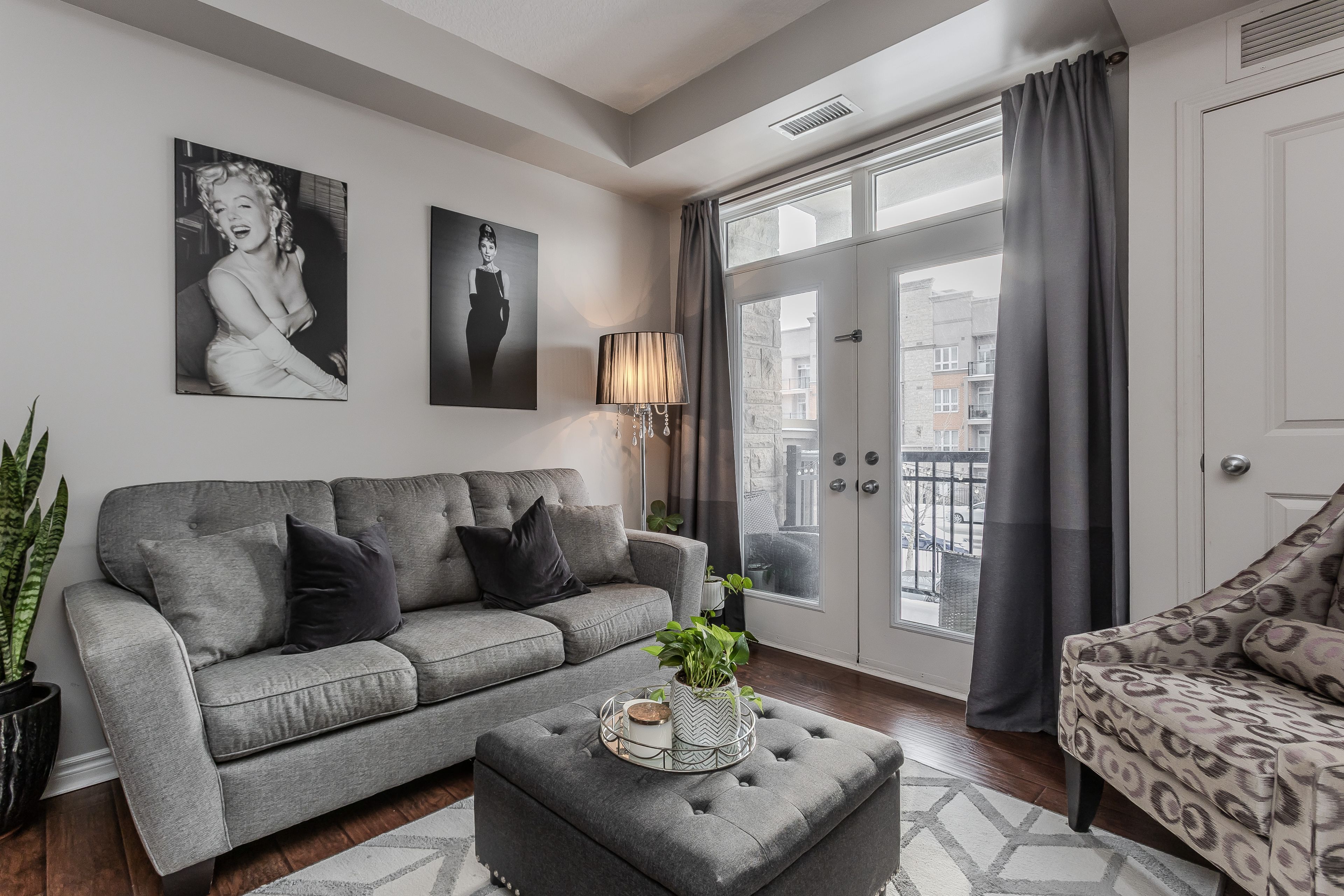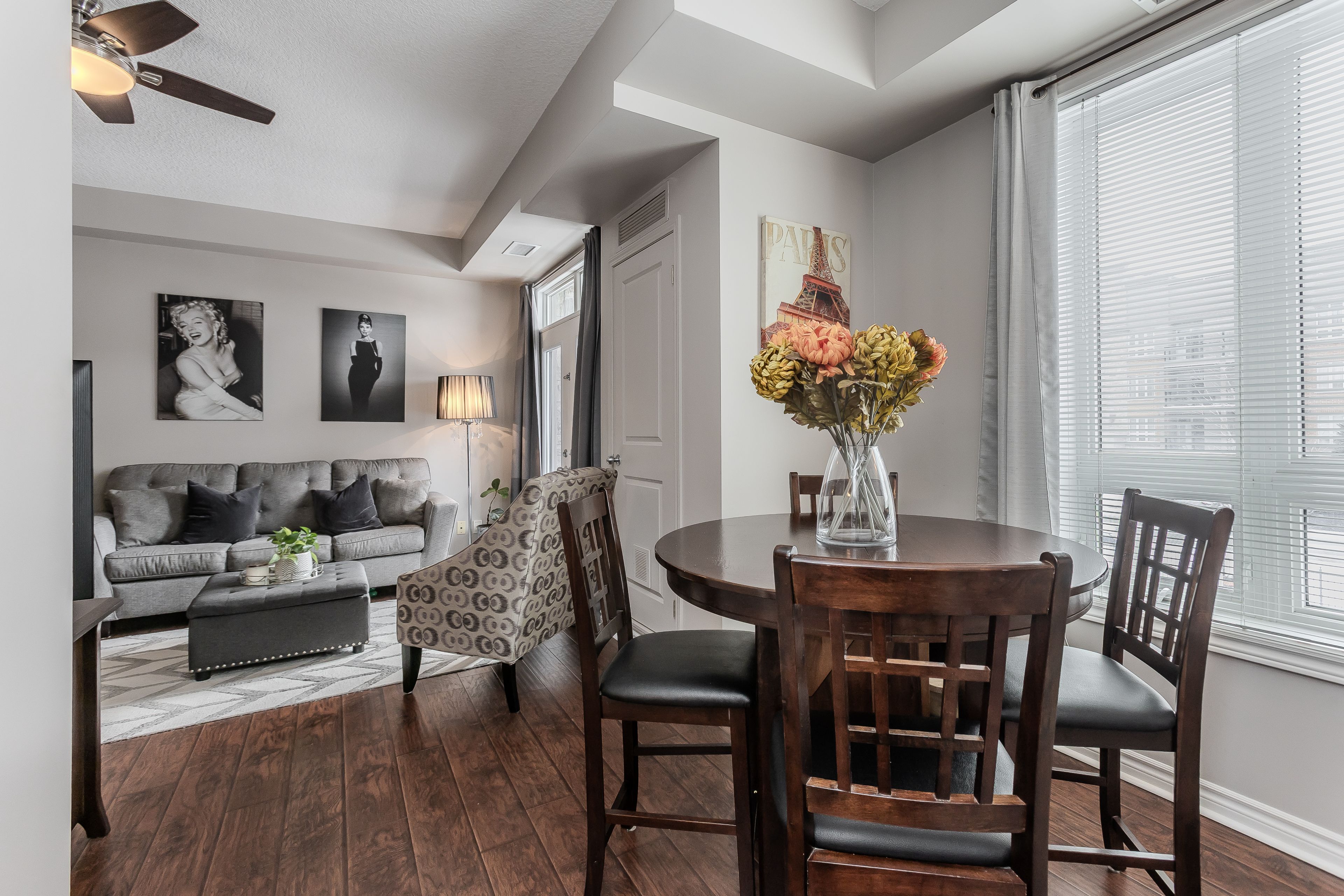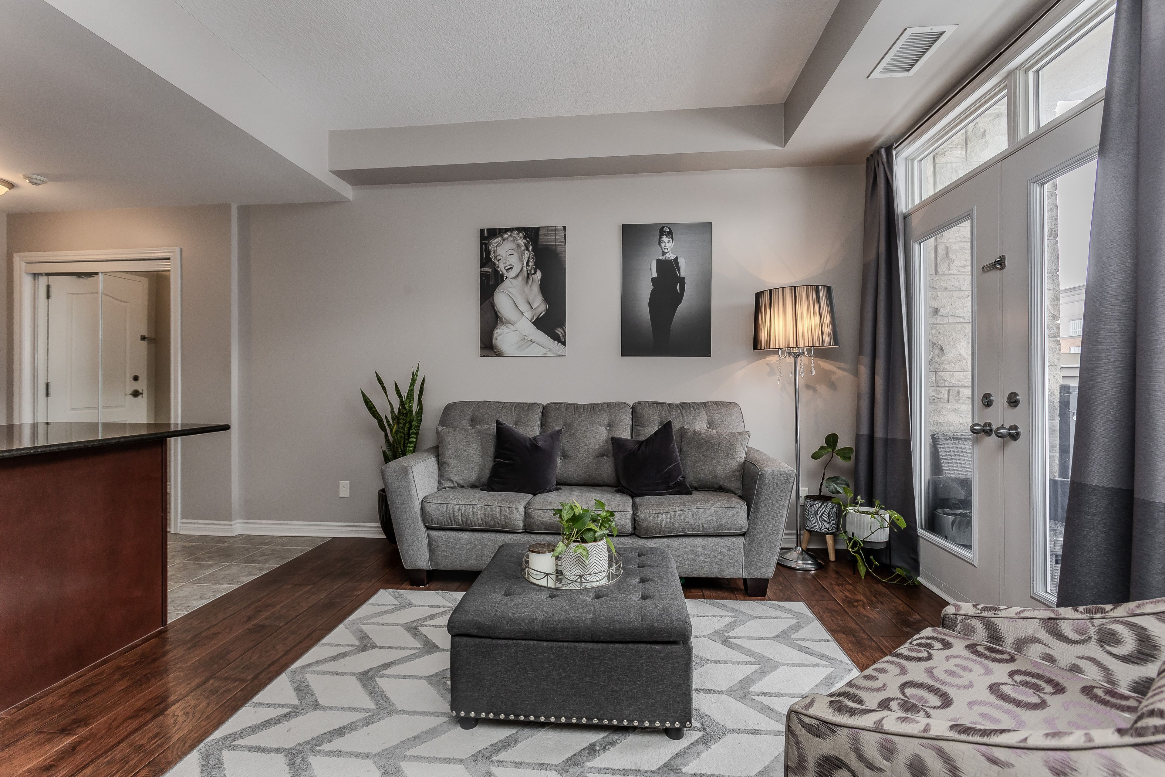 • Bright open-concept interior with hardwood flooring and high ceilings.