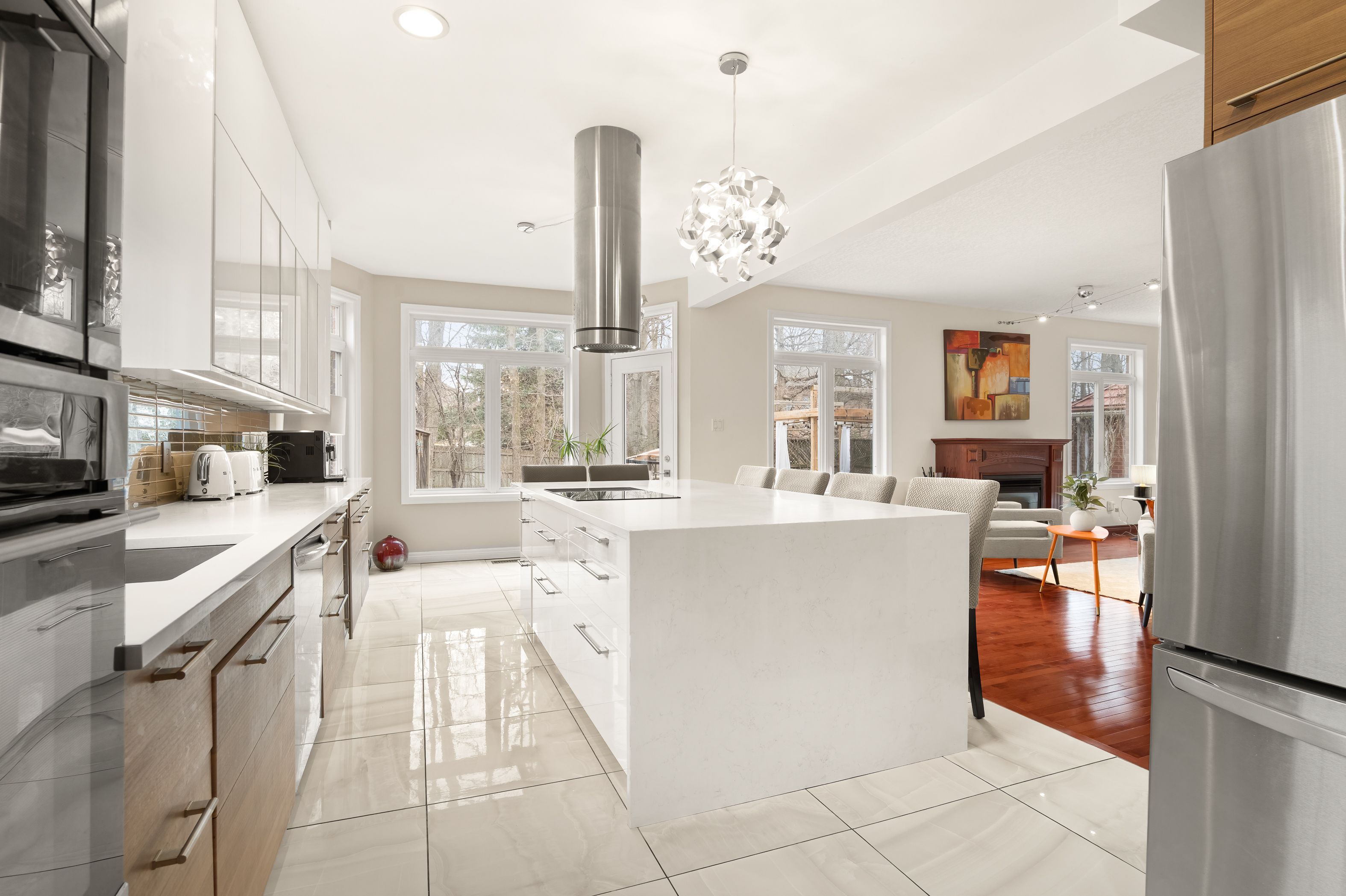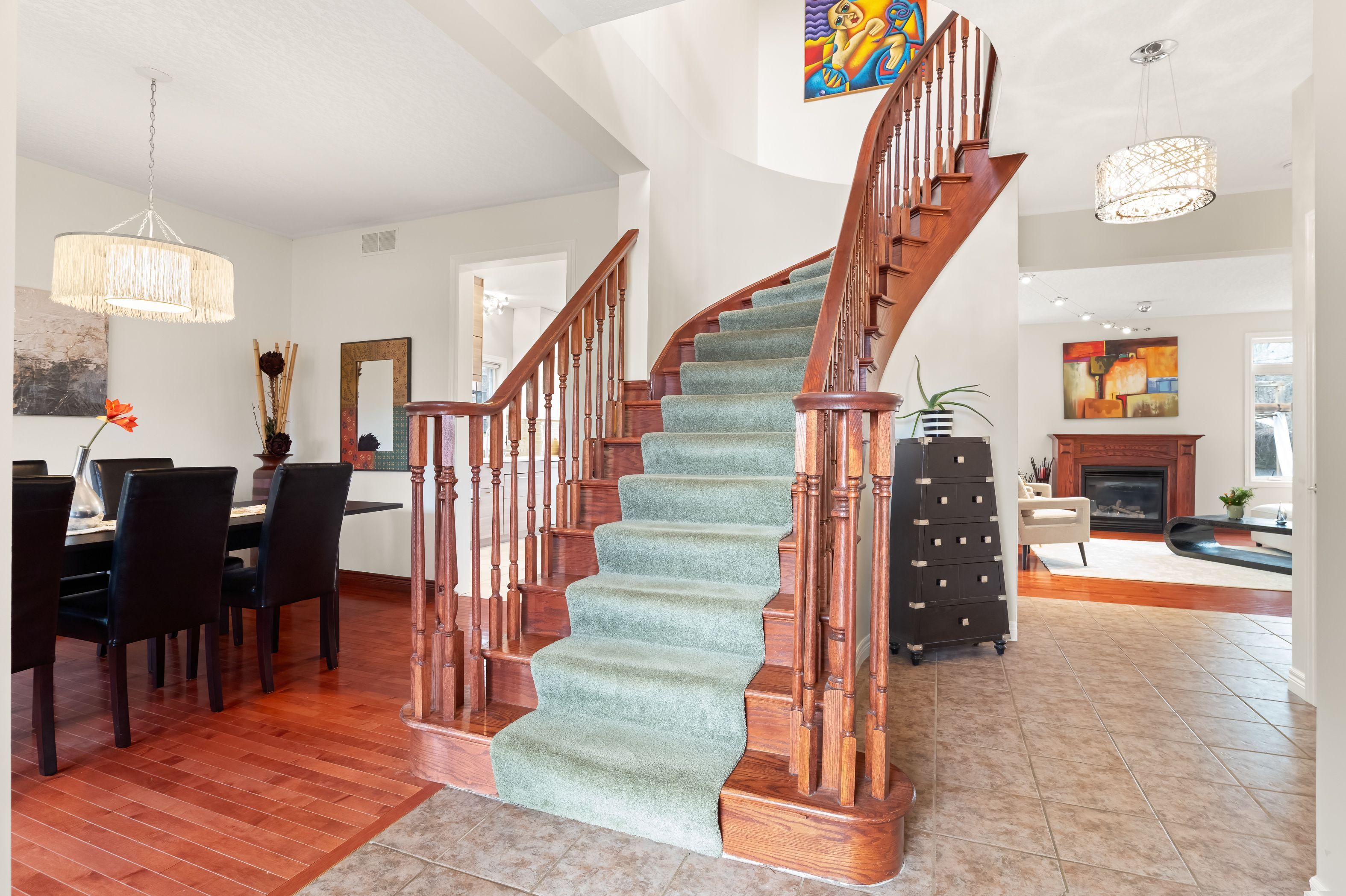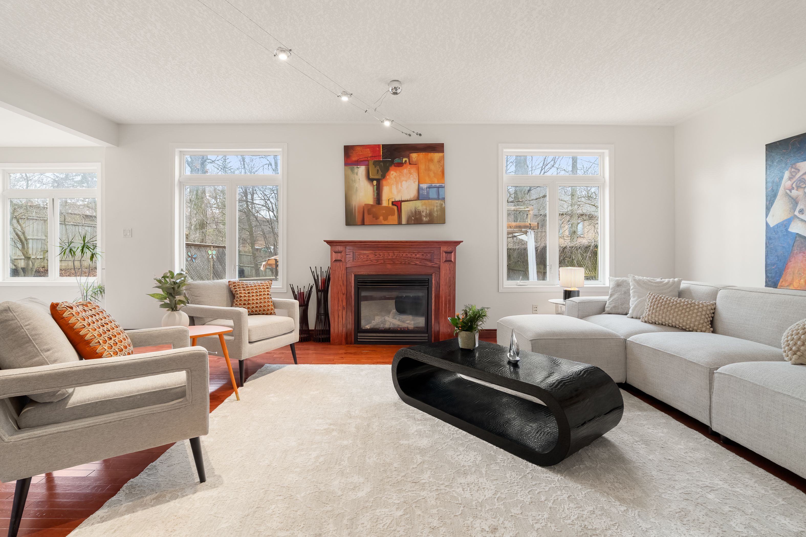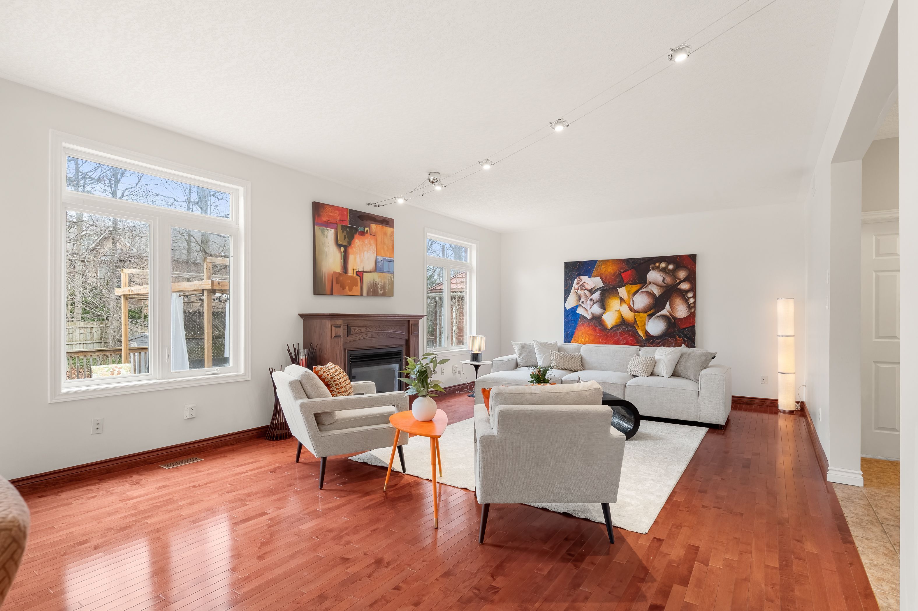 • Carpet-free main floor featuring a gas fireplace and updated lighting.