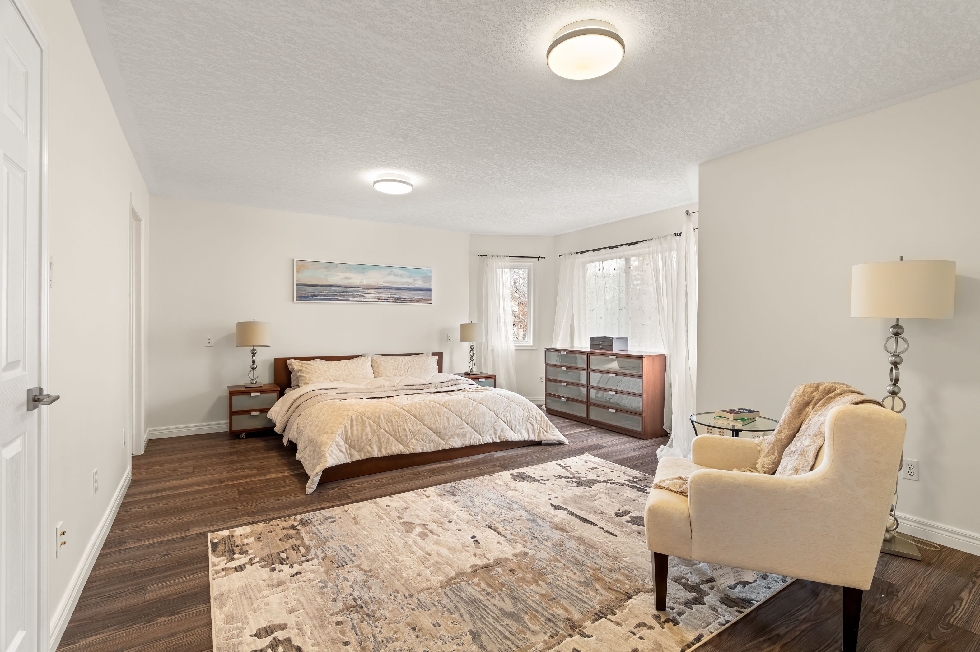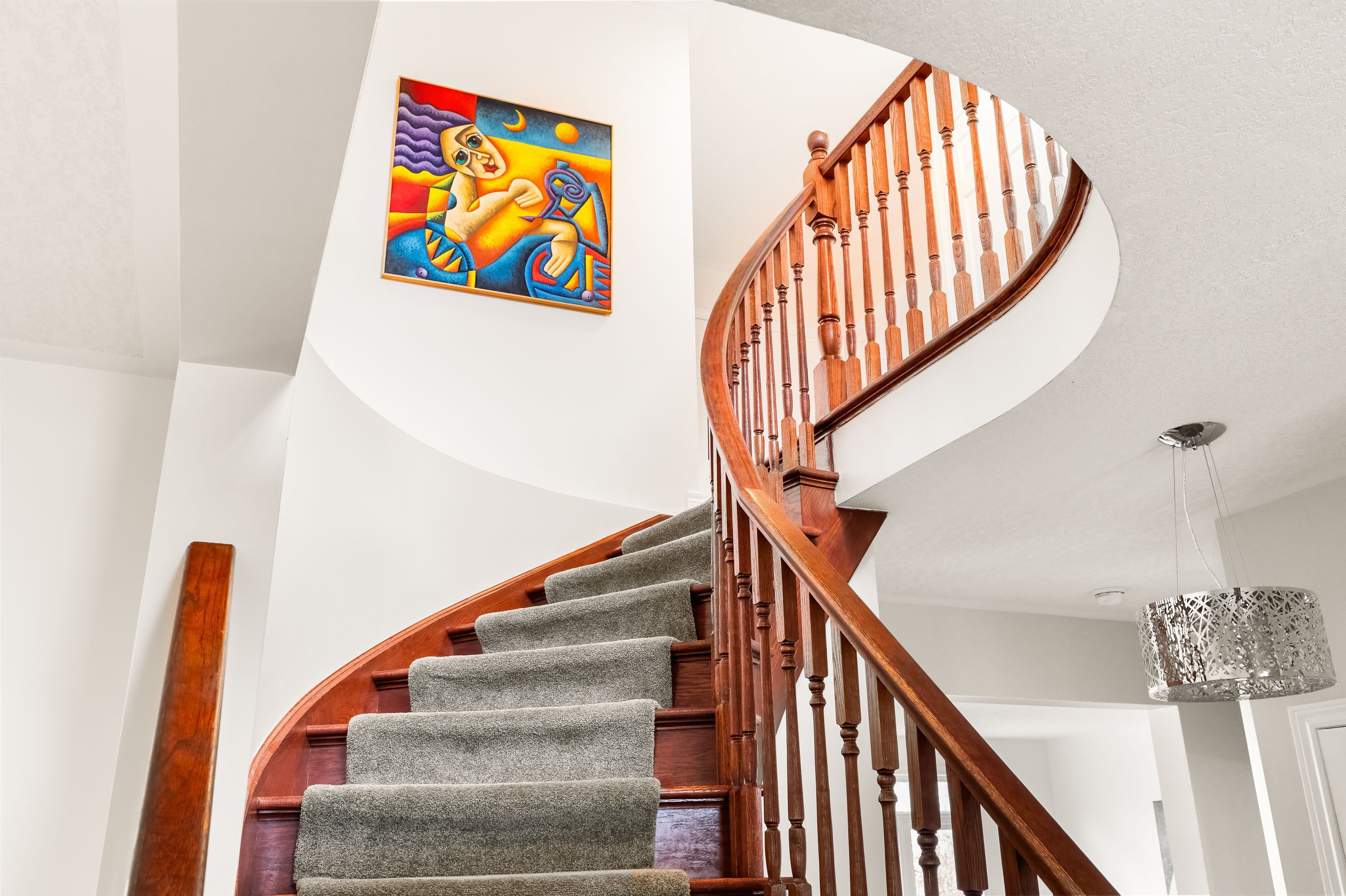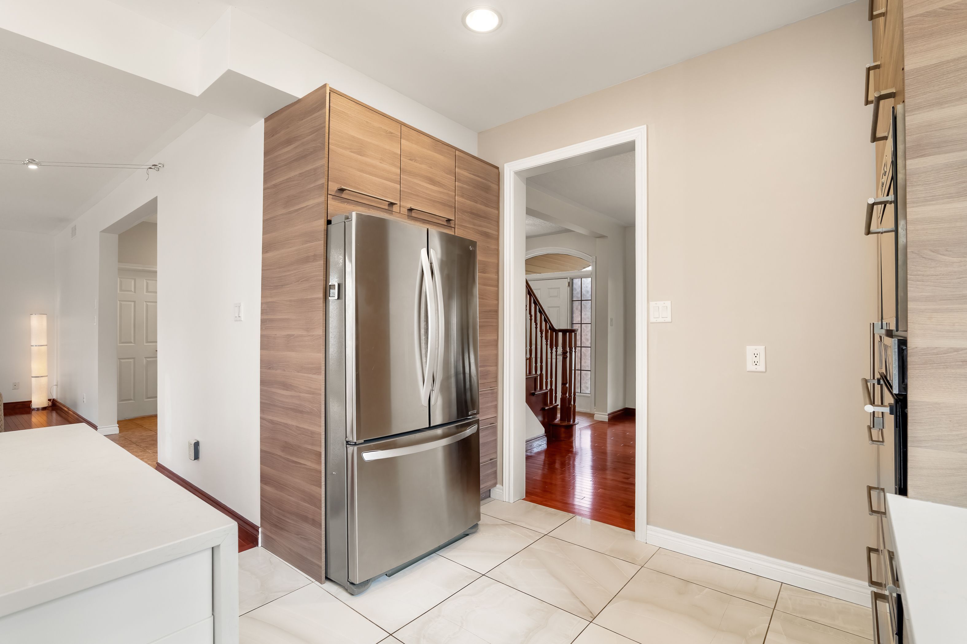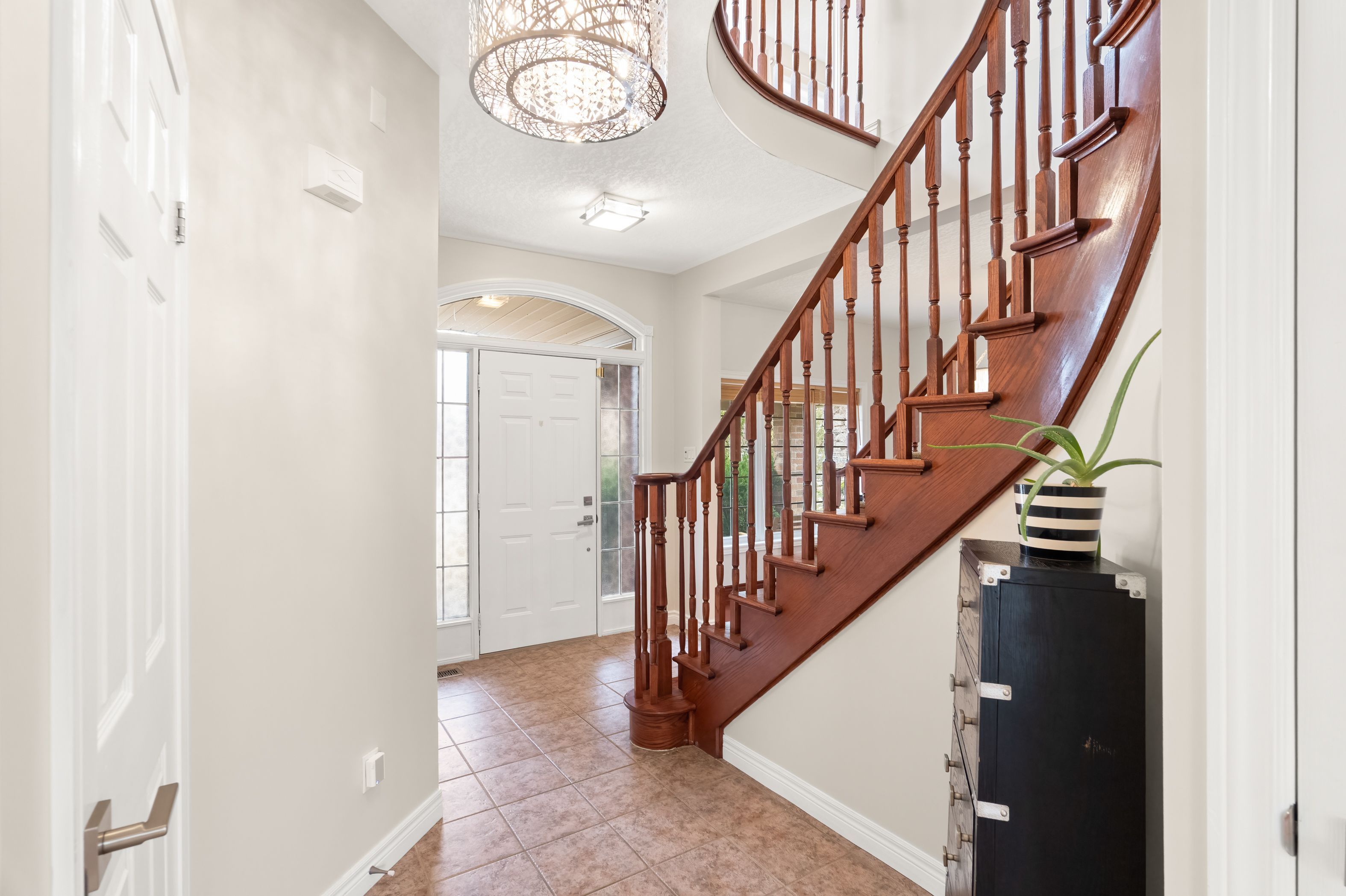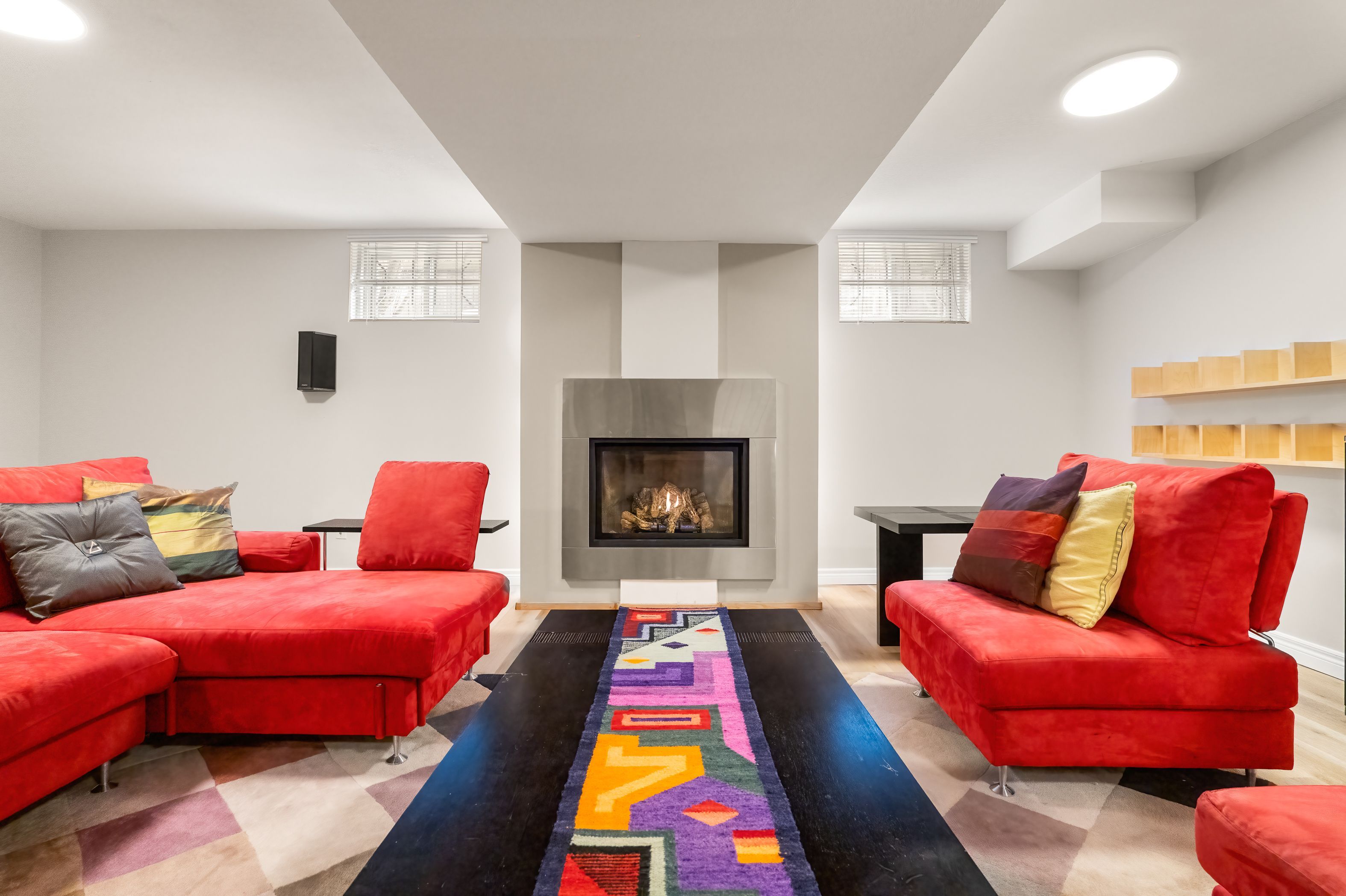 • Carpet-free main floor featuring a gas fireplace and updated lighting.