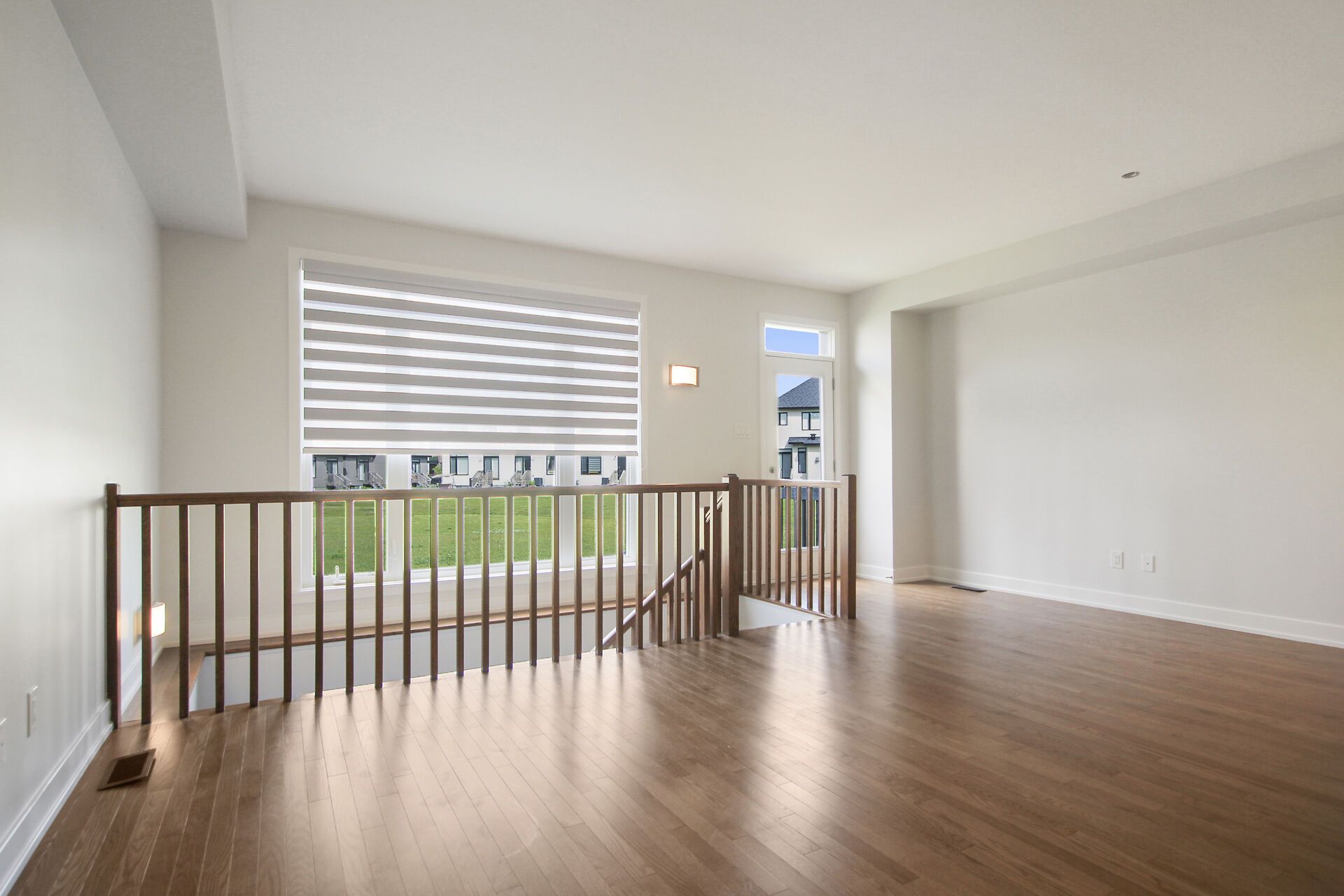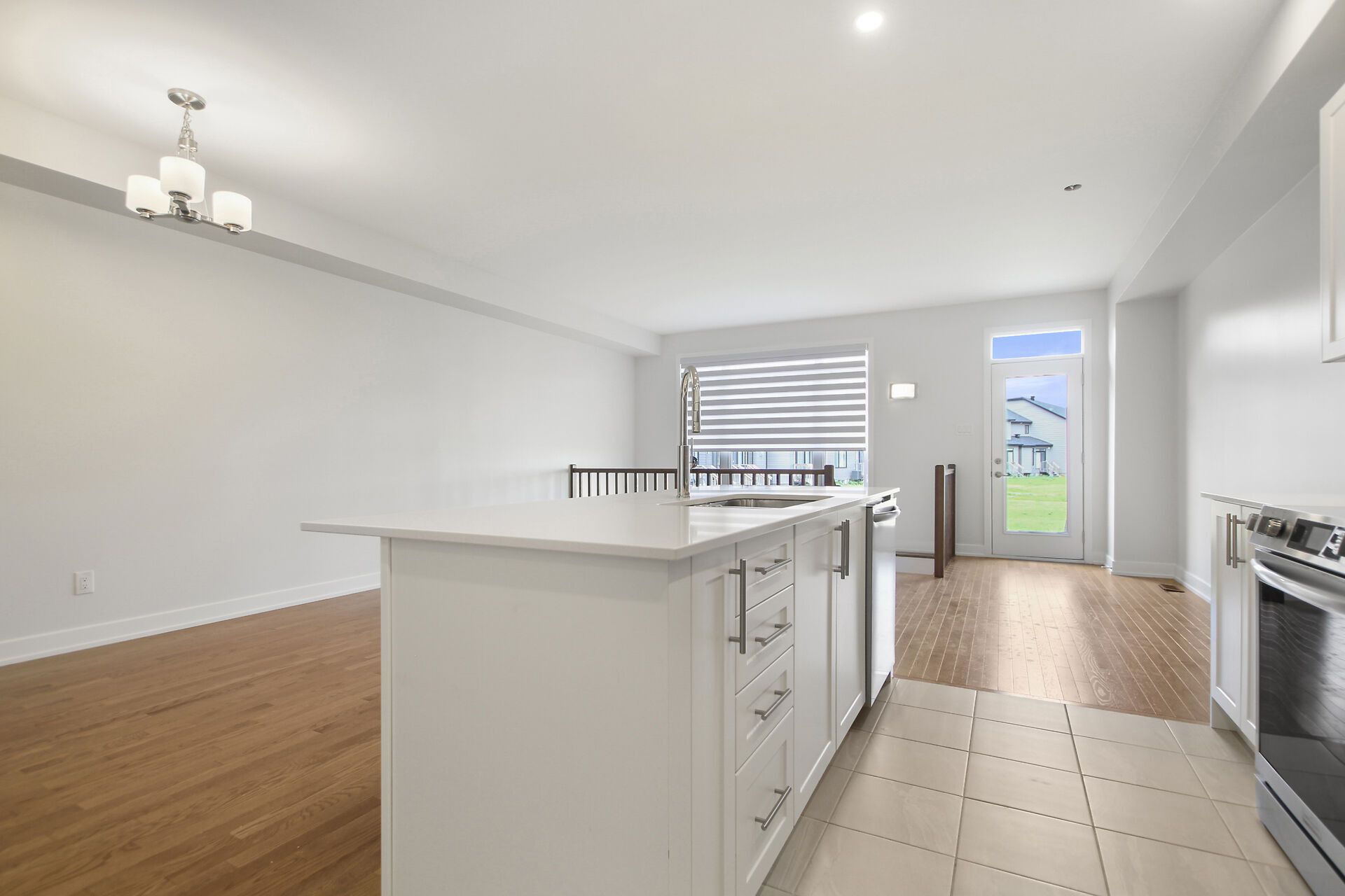 • Open-concept main level with stylish hardwood flooring and modern kitchen.