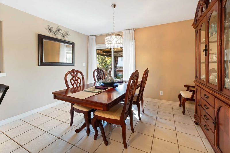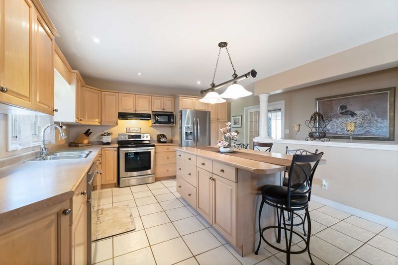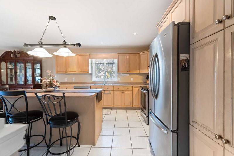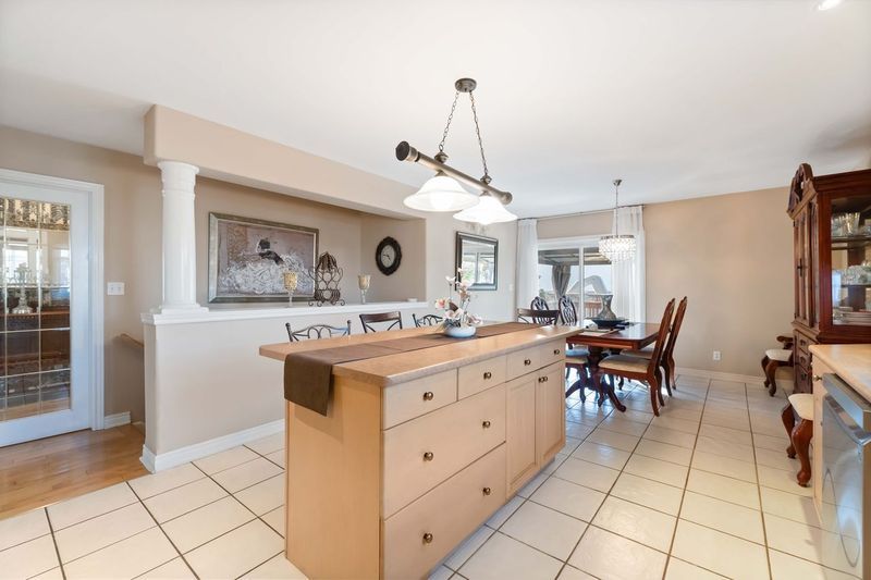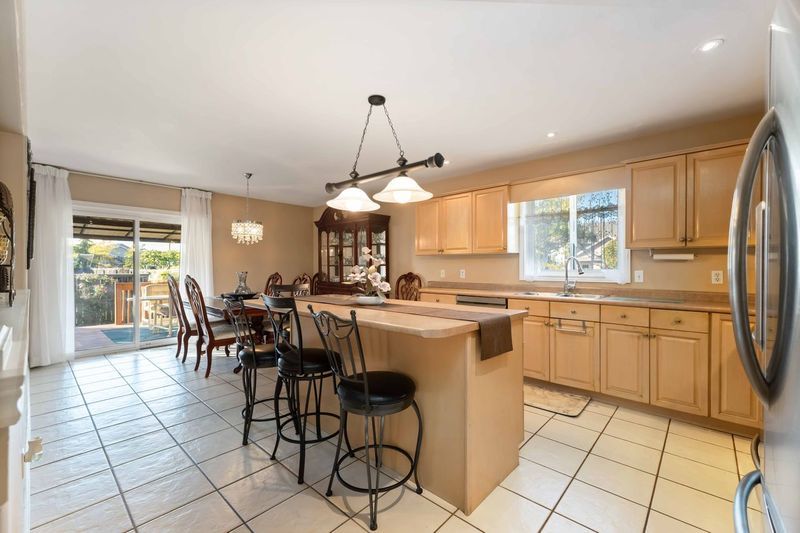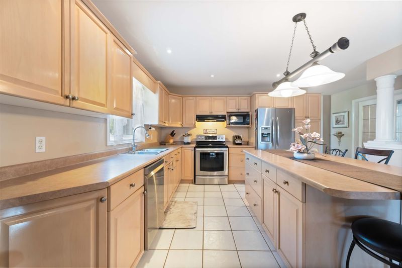 • Kitchen includes plenty of cabinetry, an island, and patio doors.